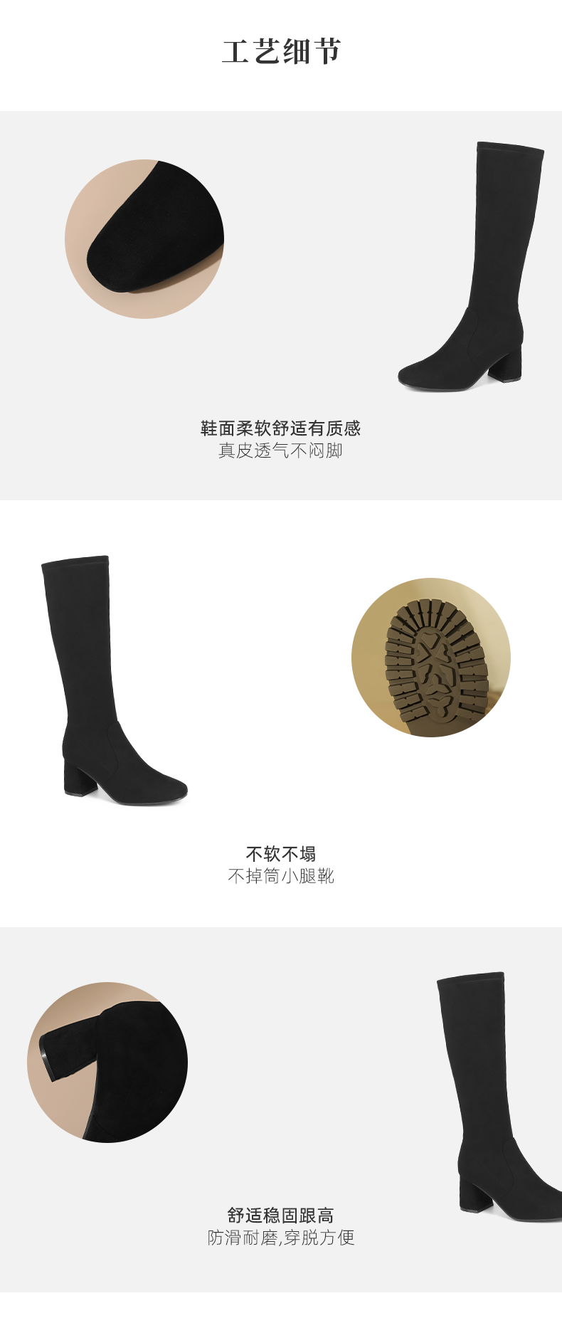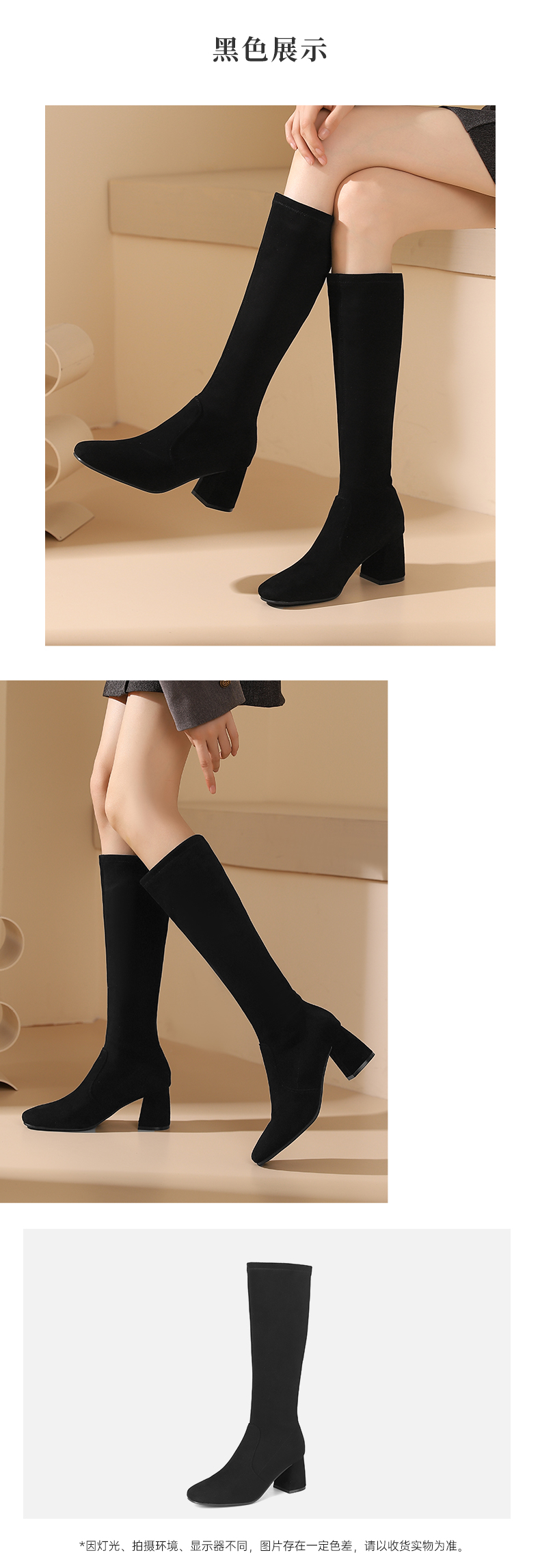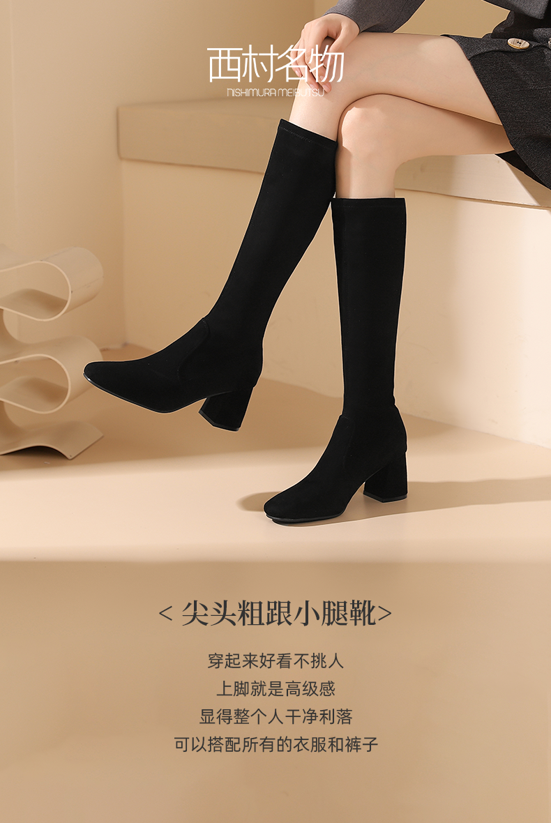 西村名物2023秋季新品尖头粗跟小腿靴法式弹力长靴不过膝女T23DQ45811