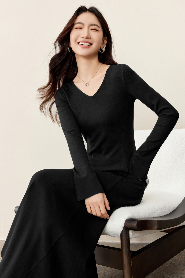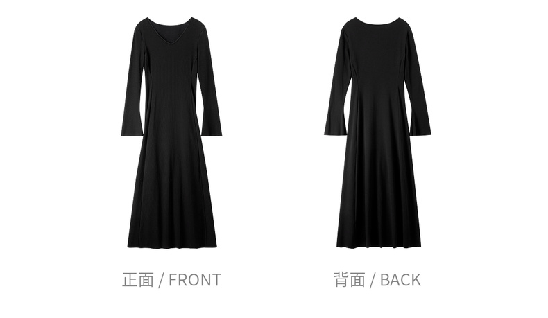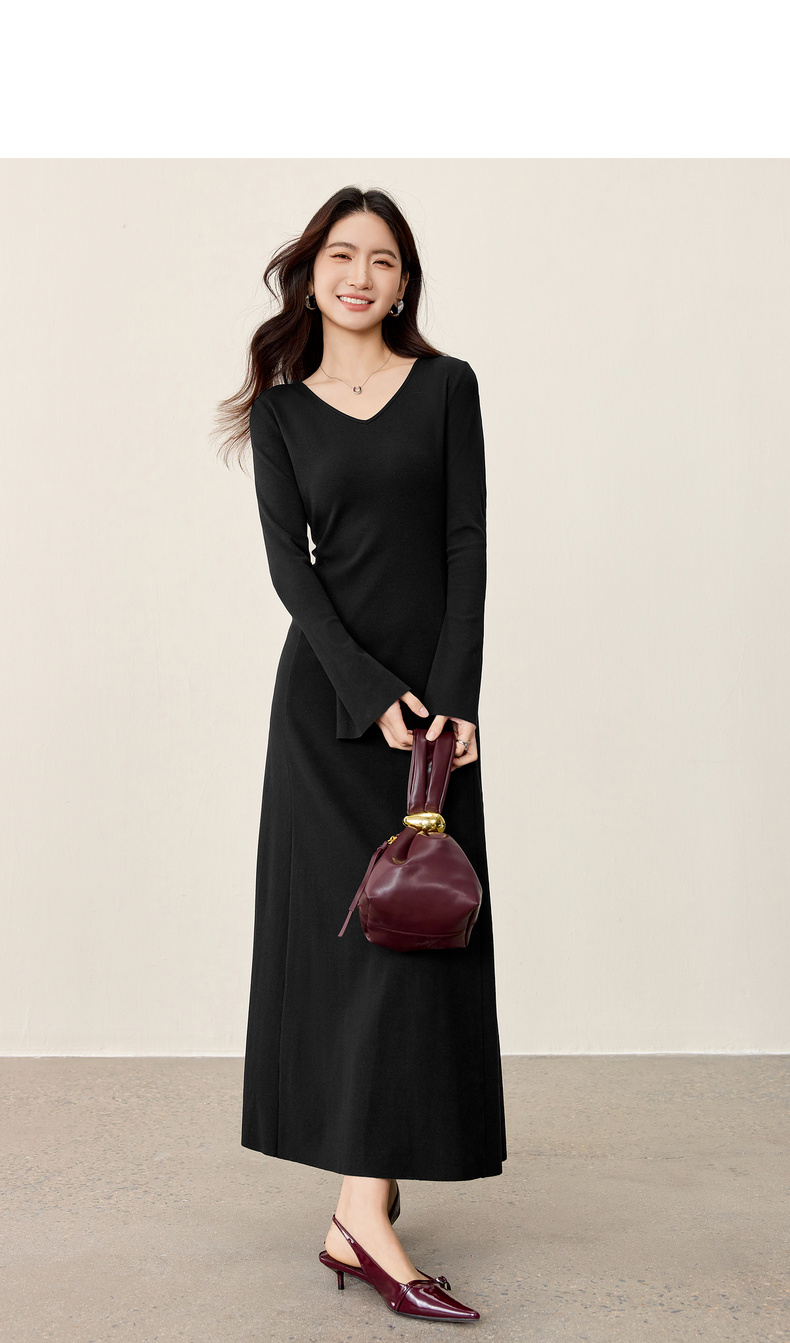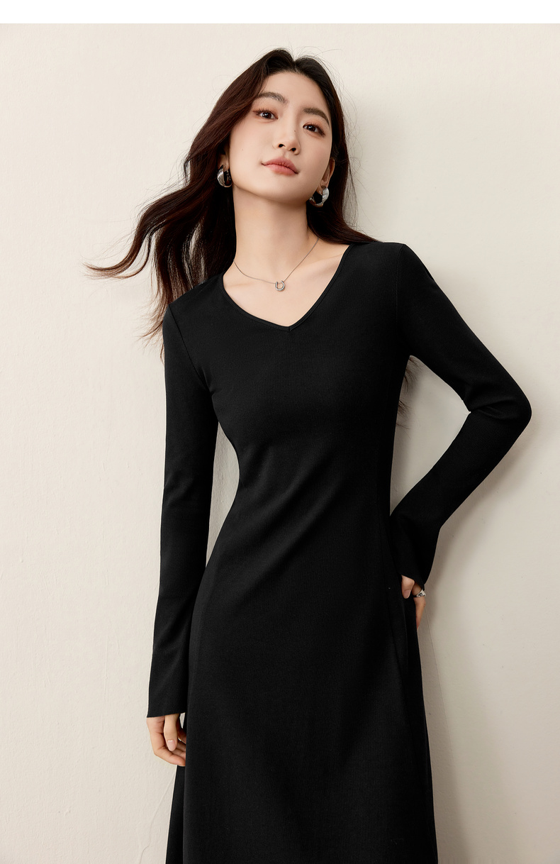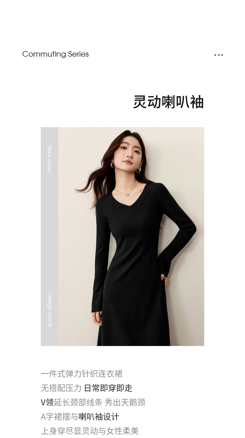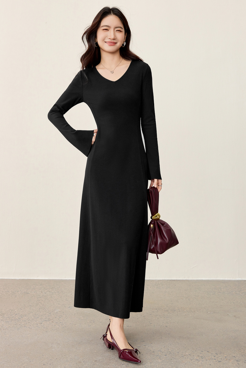 【内购】【通搭三季】简约通勤V领喇叭袖修身显瘦弹力针织连衣裙-153LN2858