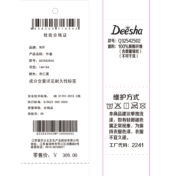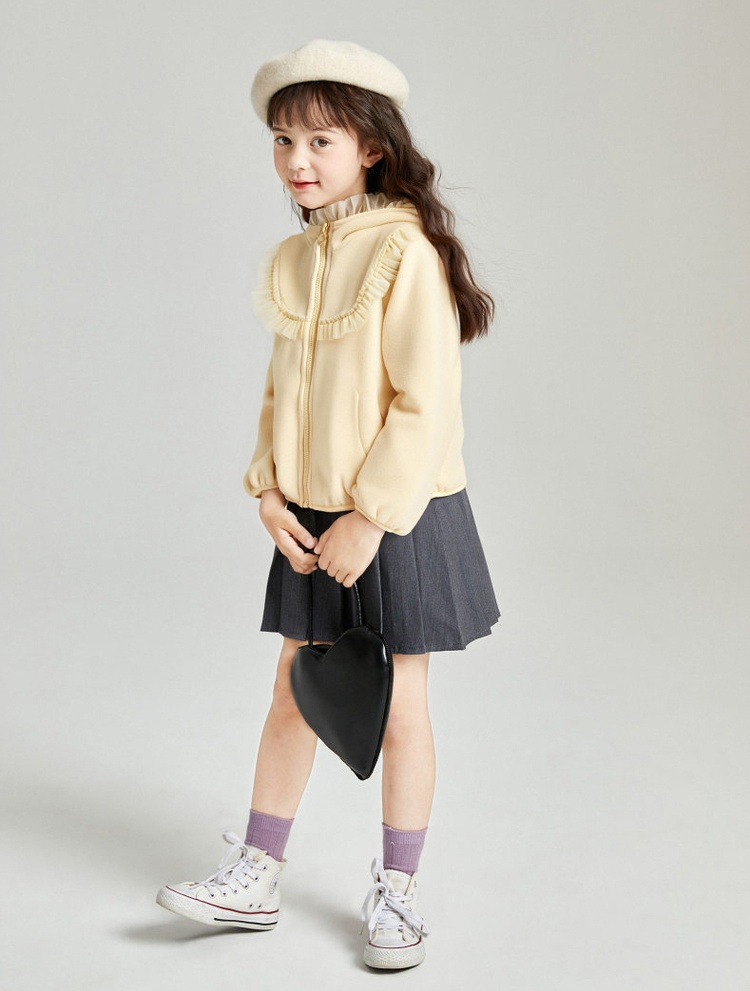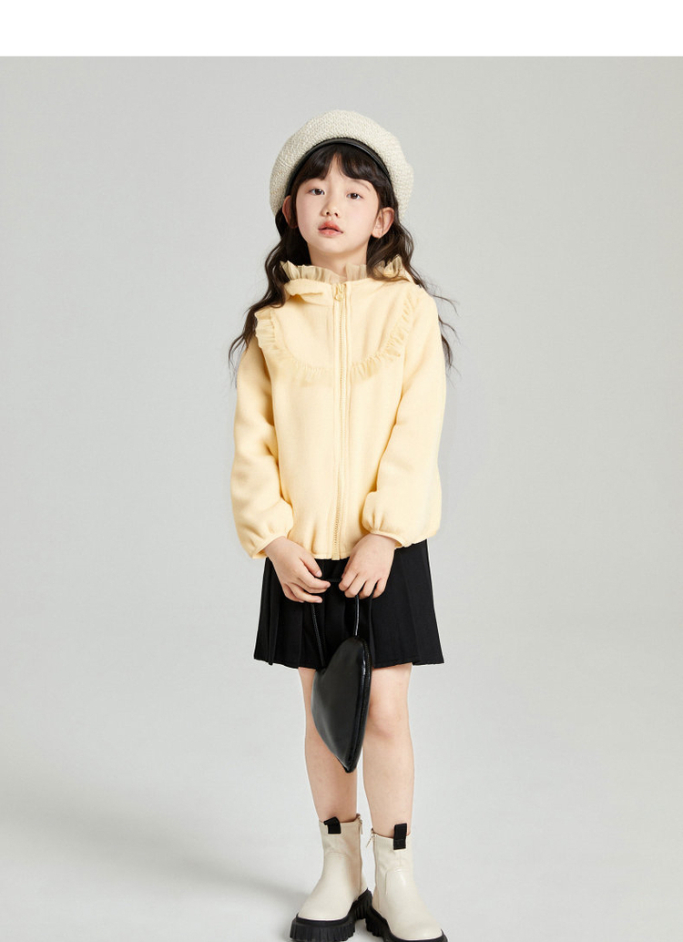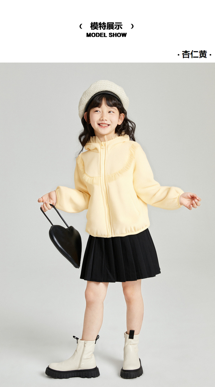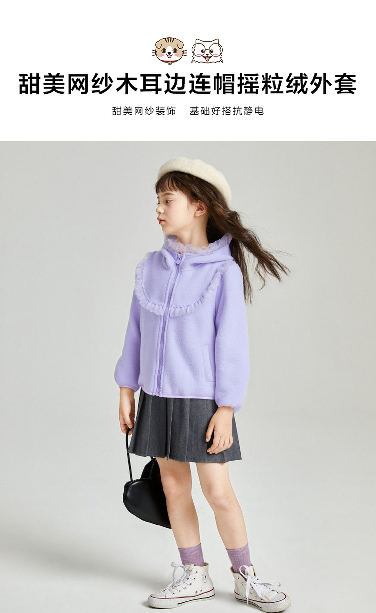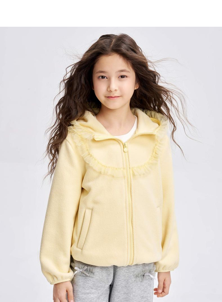 笛莎Deesha 2025冬季新款女童甜美网纱木耳边连帽摇粒绒外套