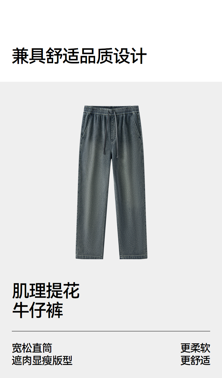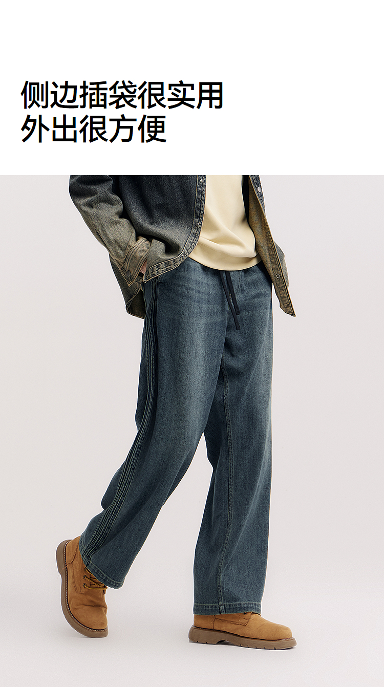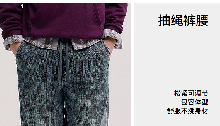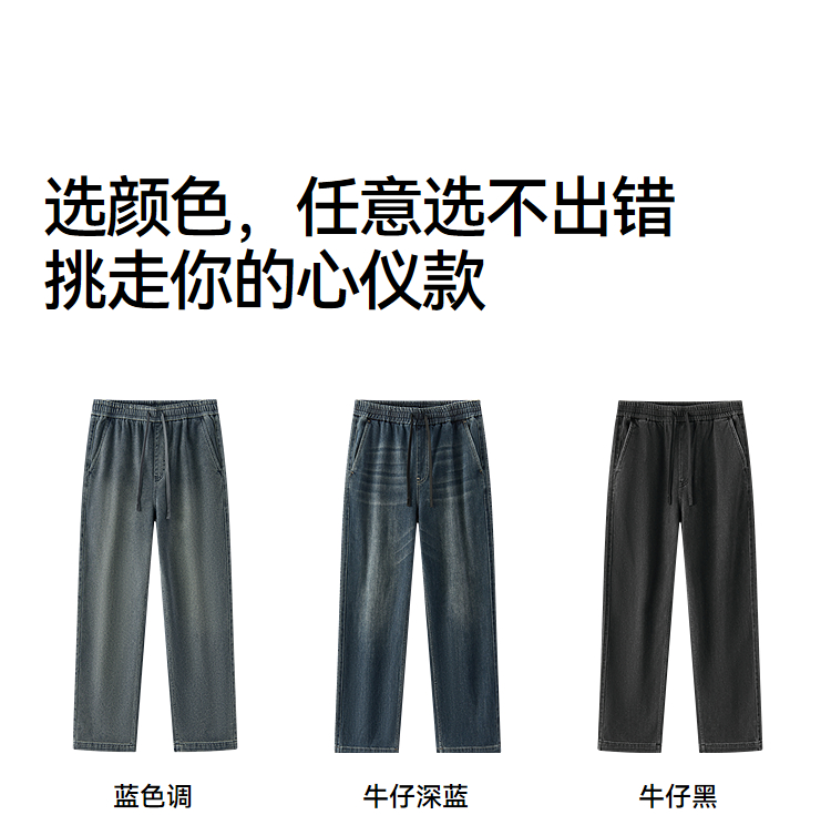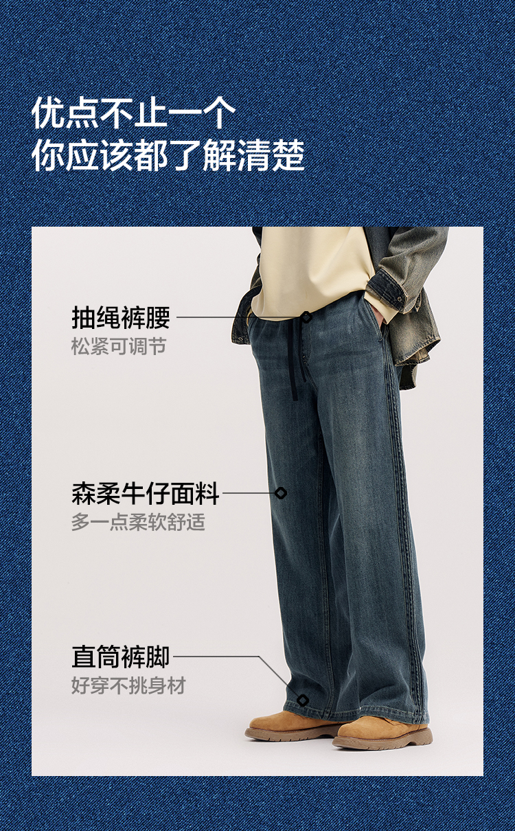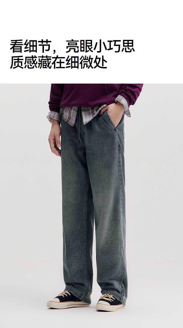 森柔|森马牛仔裤男春宽松直筒牛仔长裤抽绳松紧腰裤肌理提花