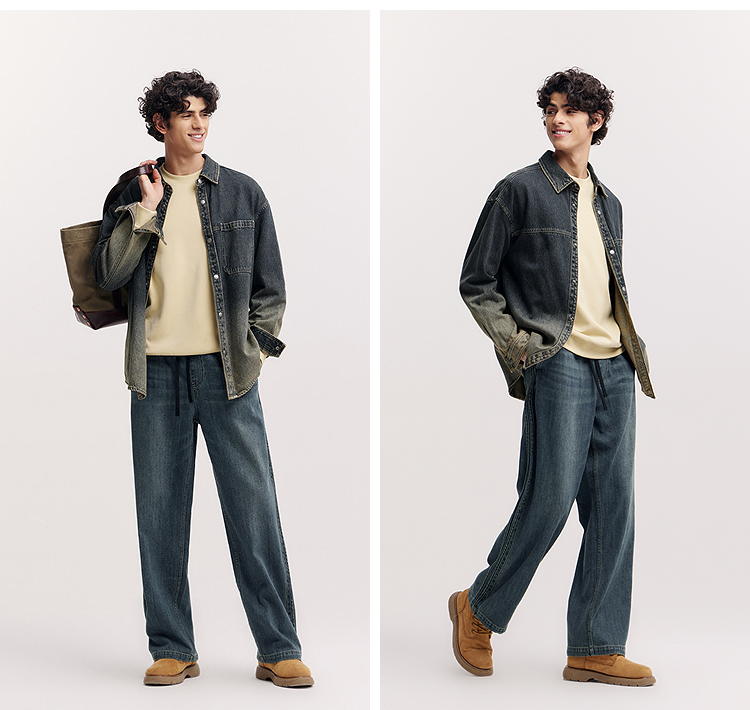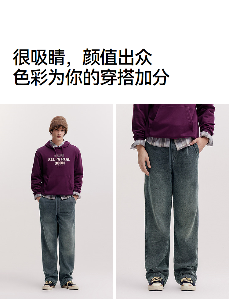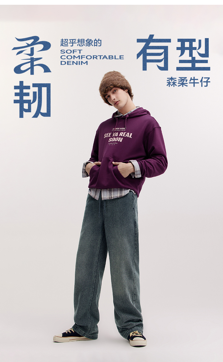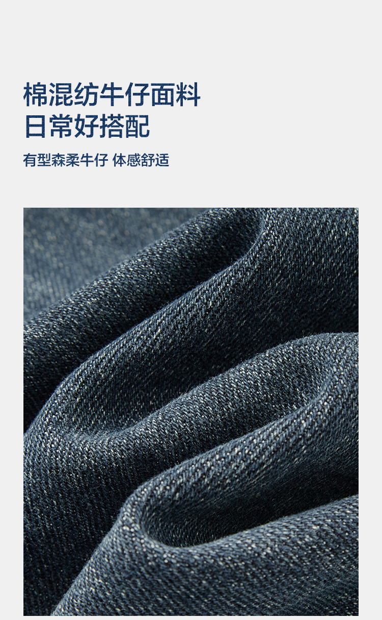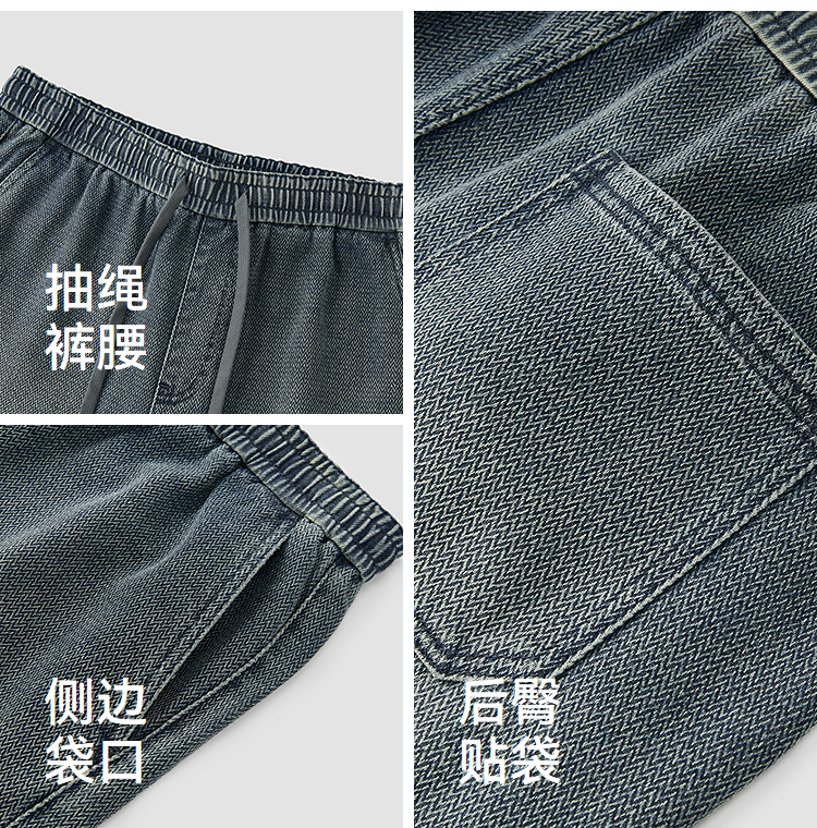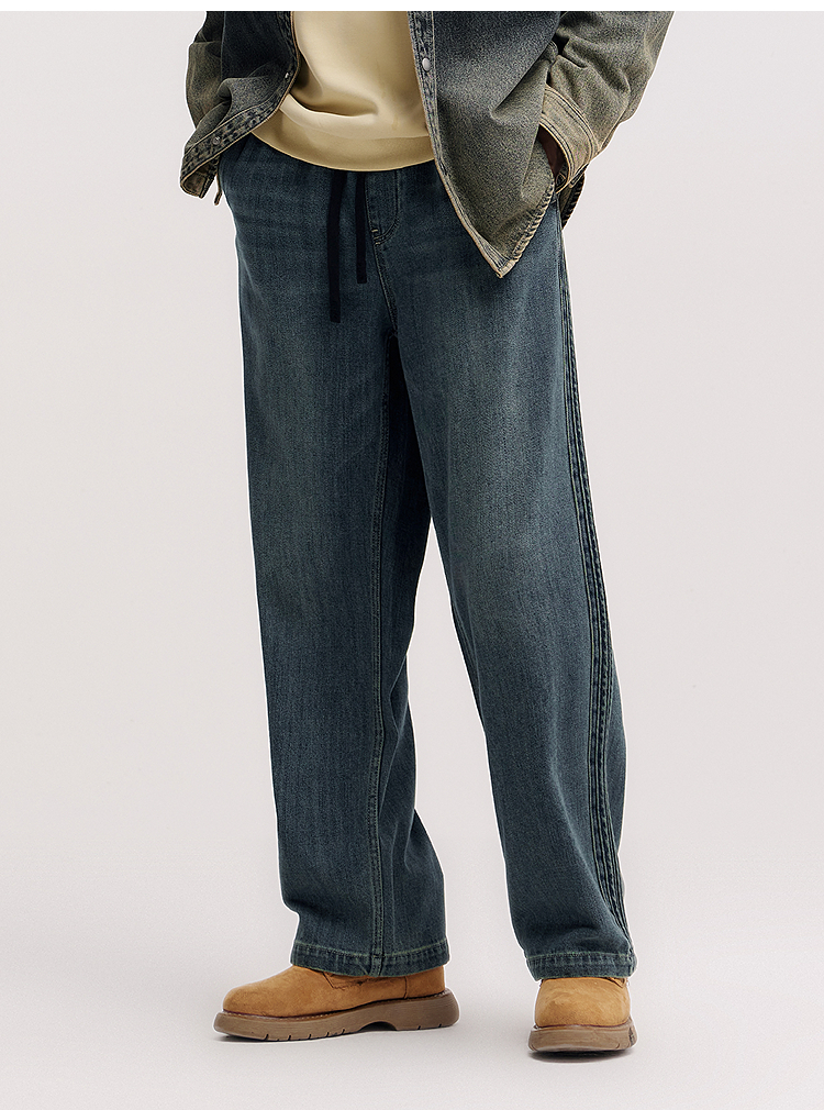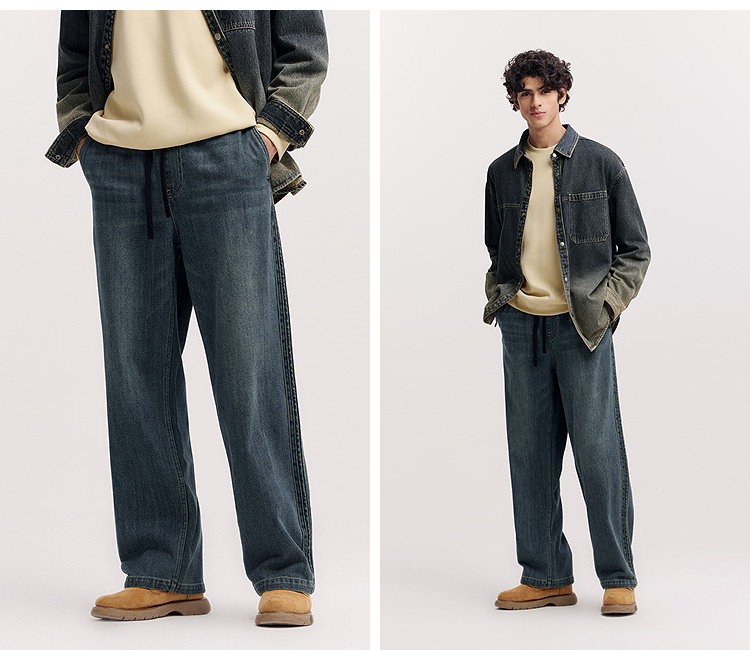 森柔|森马牛仔裤男春宽松直筒牛仔长裤抽绳松紧腰裤肌理提花