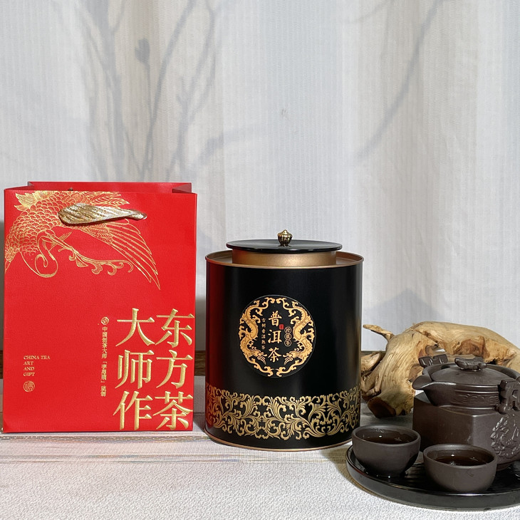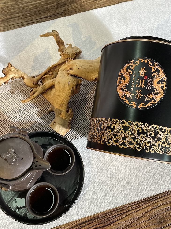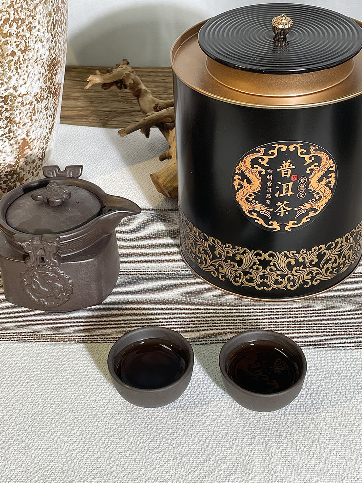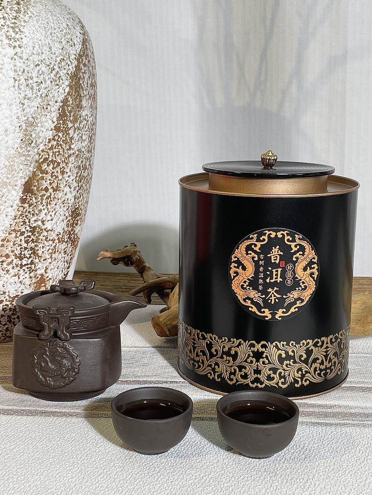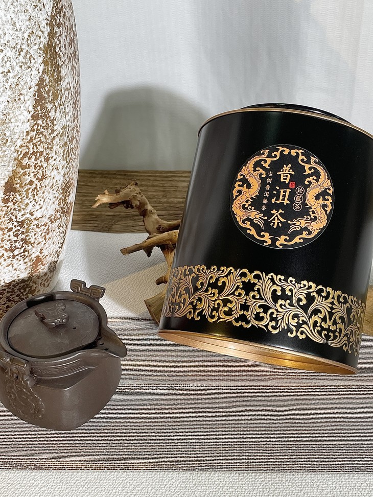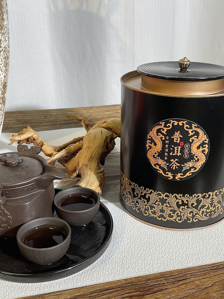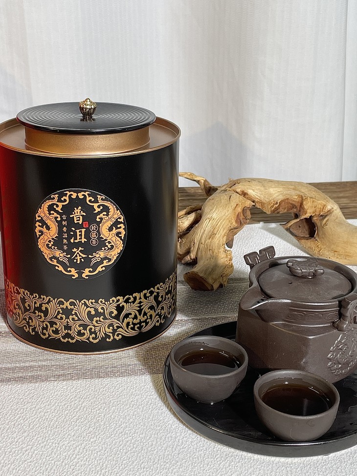 外包装采用金黑经典配色, 既彰显了普洱茶的沉稳与高贵,又不失时尚感。 茶叶罐上的图案细腻精美,与“普洱茶”三个大字相得益彰,让人一眼难忘。 这样的设计,不仅保护了茶叶的品质,更提升了整体的观赏价值, 无论是摆放在家中还是赠送亲友,都能 彰显主人的品味与格调 普洱茶以其独特的发酵工艺和丰富的内含物质,被誉为“可以喝的古董”。 它不仅能够促进消化、降脂减肥,还具有抗氧化、抗衰老等多种健康功效。 在这个快节奏的时代,一杯普洱茶,不仅是对身体的呵护,更是对生活品质的追求。