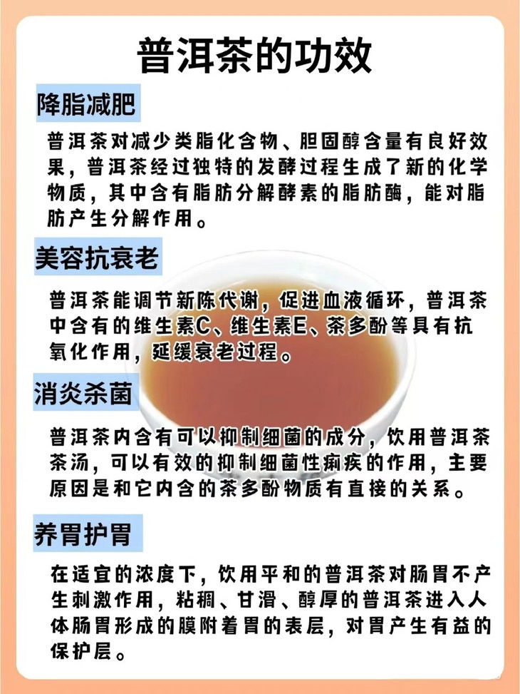 普洱茶蕴含丰富的茶黄素茶黄素就是茶里面的软黄金,它具有: ✅美容养颜 ✅抗癌 ✅排除身体的有害物质 普洱茶在中国素有“万病之药“的说法! 这款普洱茶因为9年的仓藏转化 是百年古树茶原料,茶性温和 且发酵后的大量的益生菌不会对肠胃造成刺激 十分适合日常饮用,老少皆宜 我们只做好茶,只为健康!