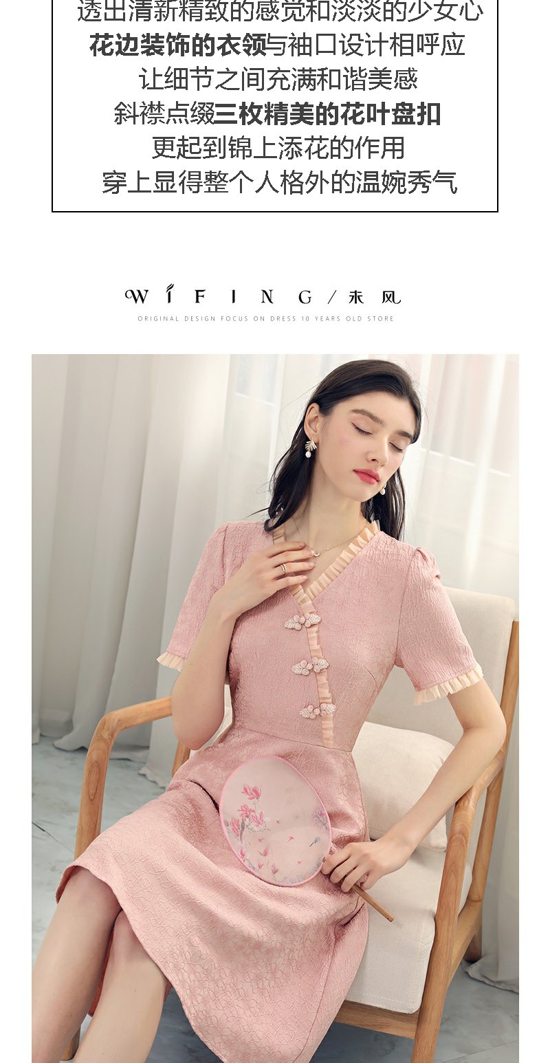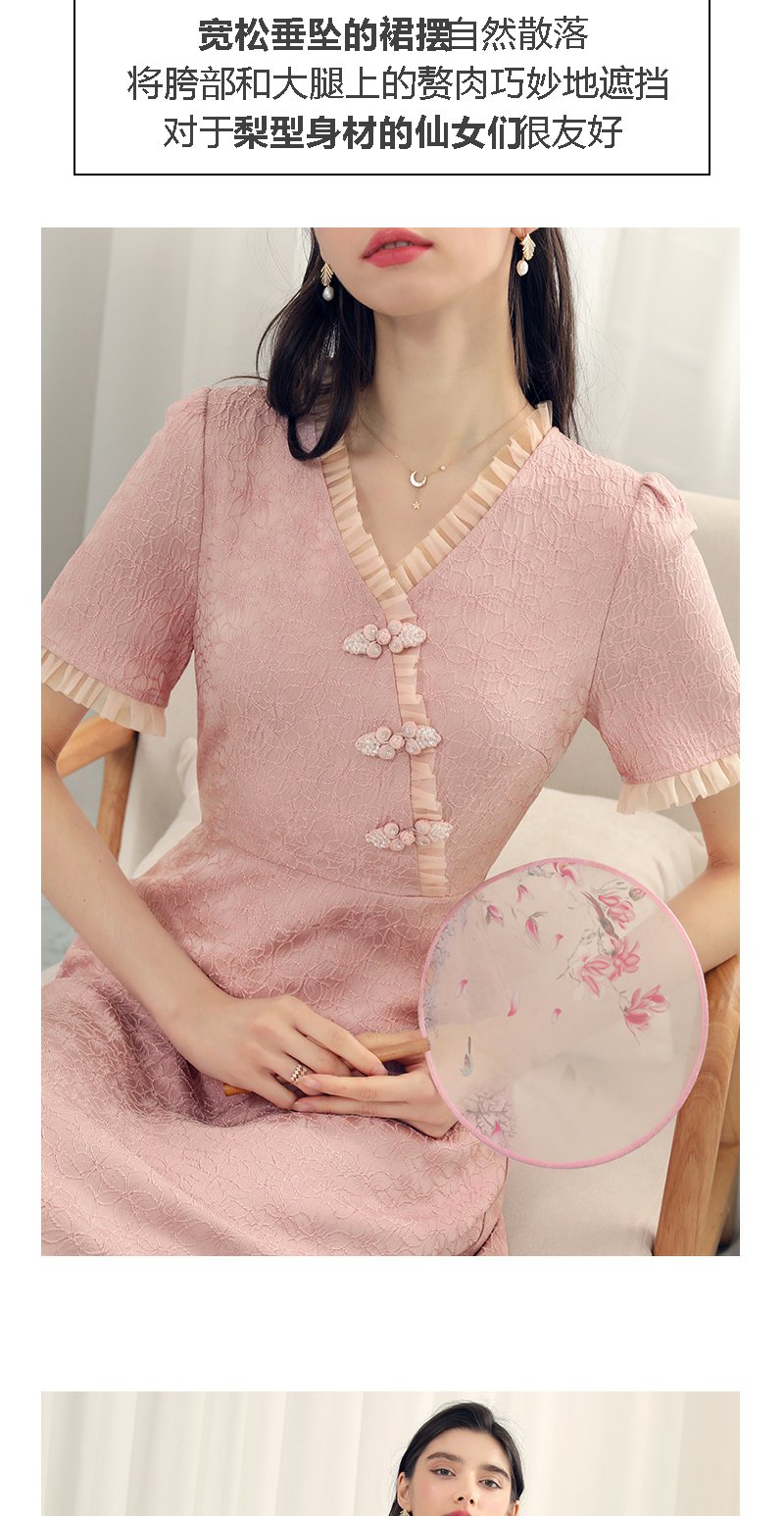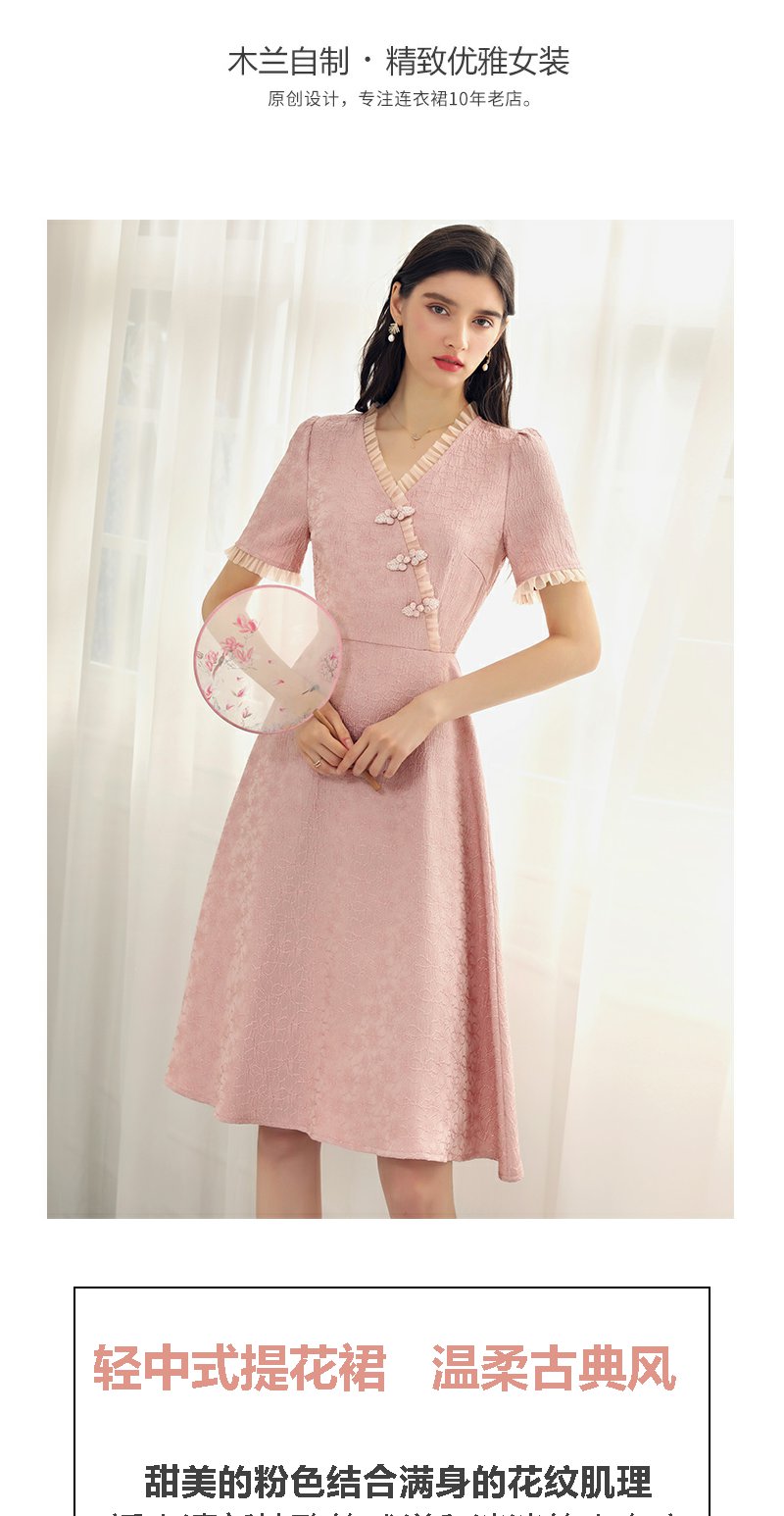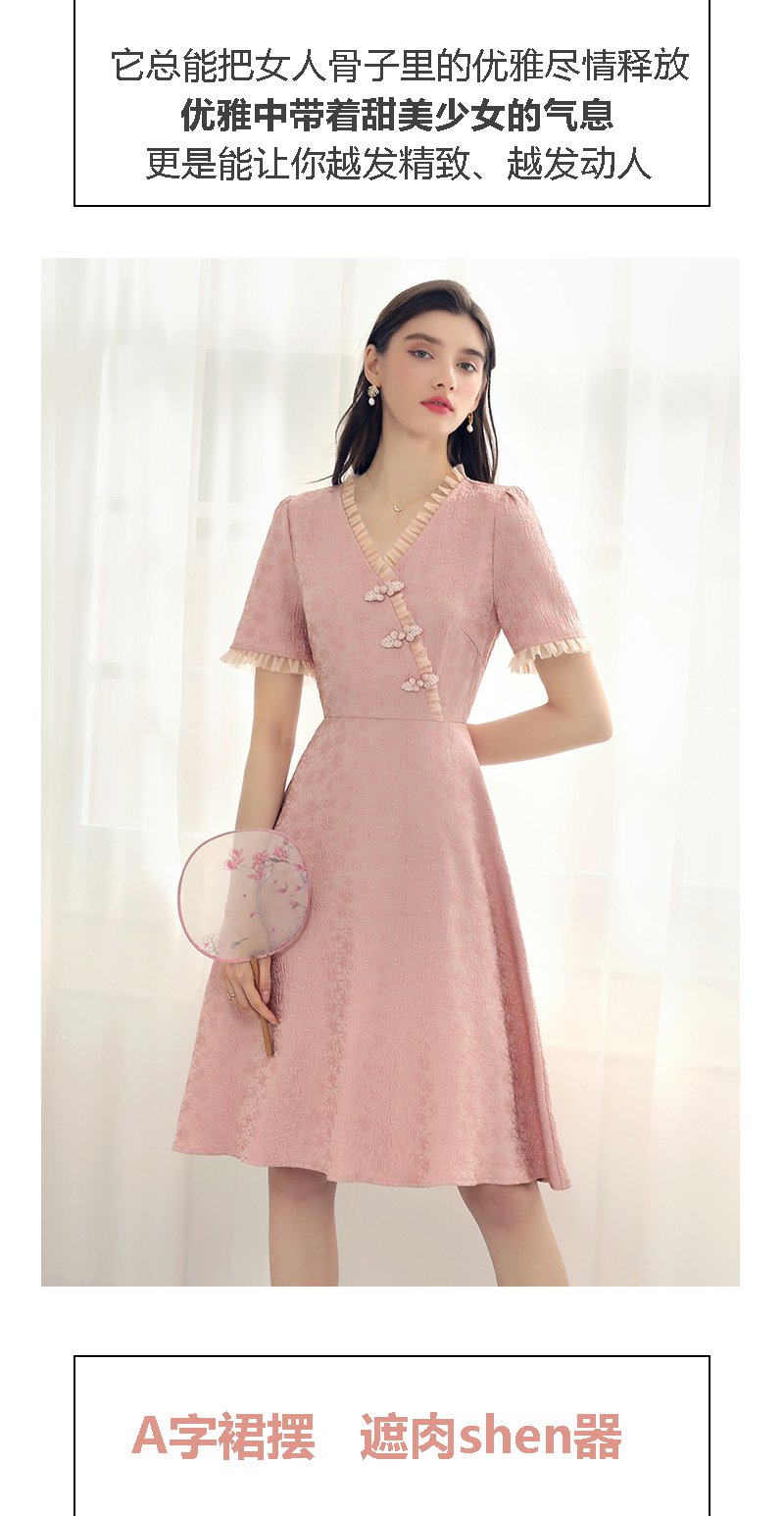 未风粉色V领连衣裙女夏2024年夏季新款女装气质修身显瘦减龄裙子