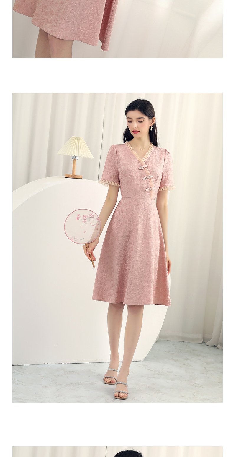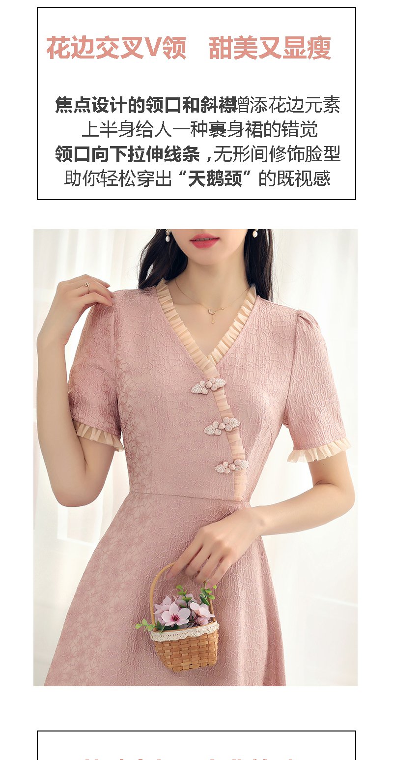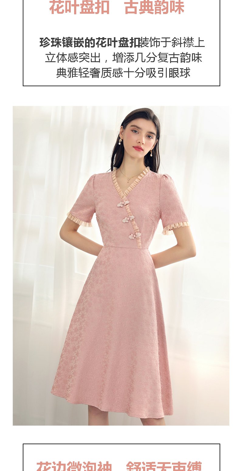 未风粉色V领连衣裙女夏2024年夏季新款女装气质修身显瘦减龄裙子