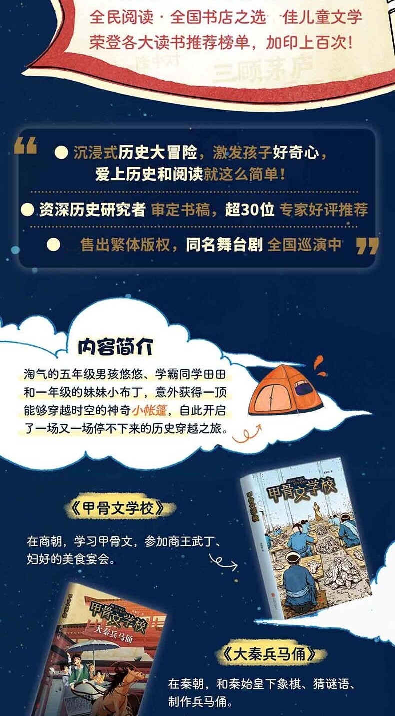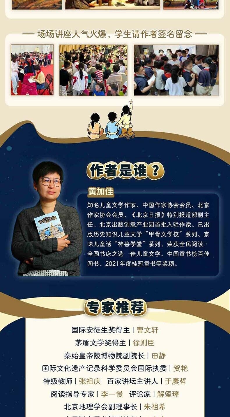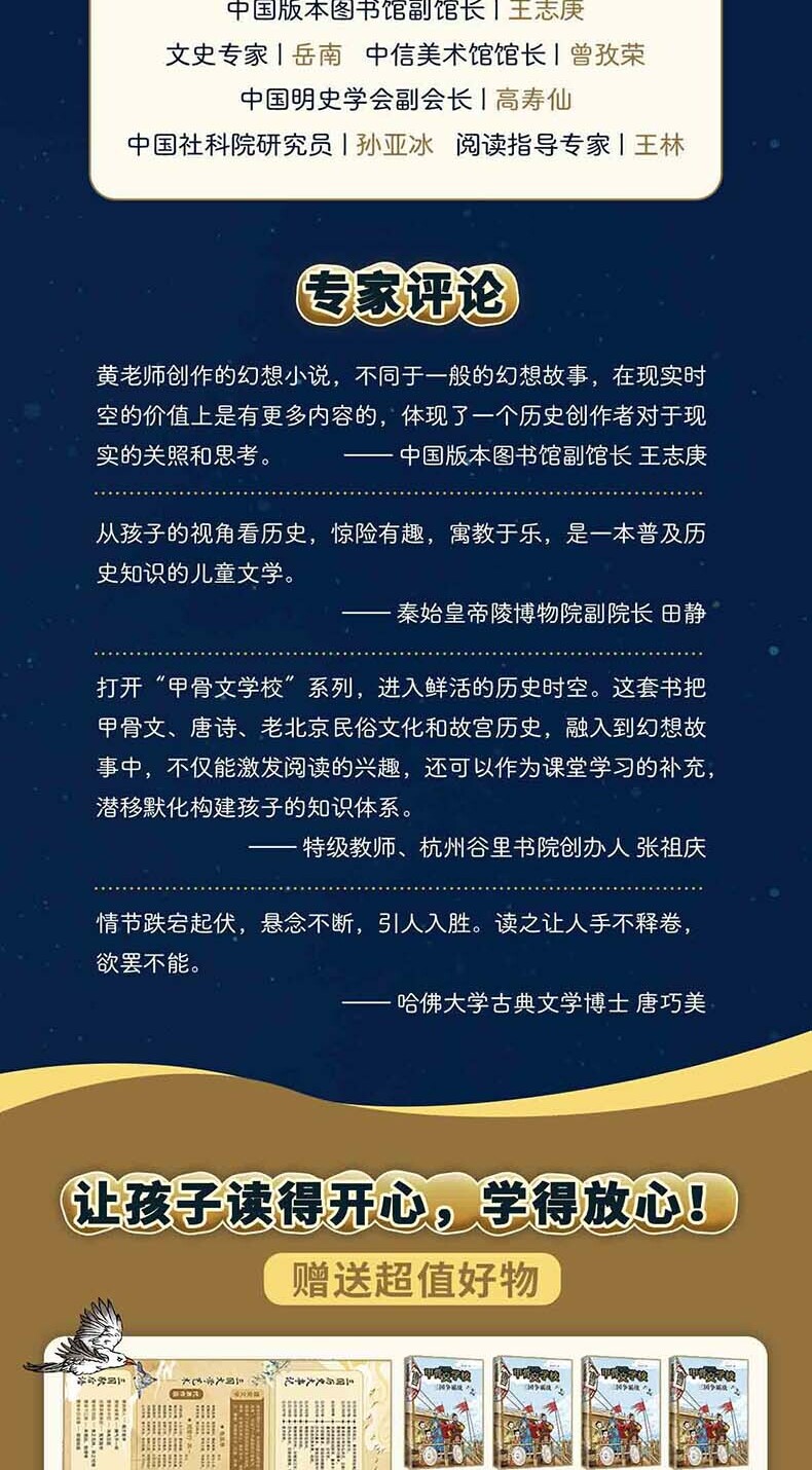由知名作家、《北京日报》特别报道部副主任黄加佳参考史料和考古发现,专门为青少年精心构思创作。出版以来,凭借趣味性、幻想性、知识性和可读性的巧妙结合,本套书得到了众多读者的喜爱,荣获搜狐文化年度十大人气好书、中国童书榜百佳图书、全民阅读·全国书店之选靠前儿童文学、《中国教育报》2020年度十大童书20本、2021年度桂冠童书、微博童书榜年度好书。在国家博物馆以及北京、河北、河南、江苏、广东等地学校的讲座中,受到了孩子、家长和老师的欢迎,加印上百次,入选全国多地小学推荐书单。