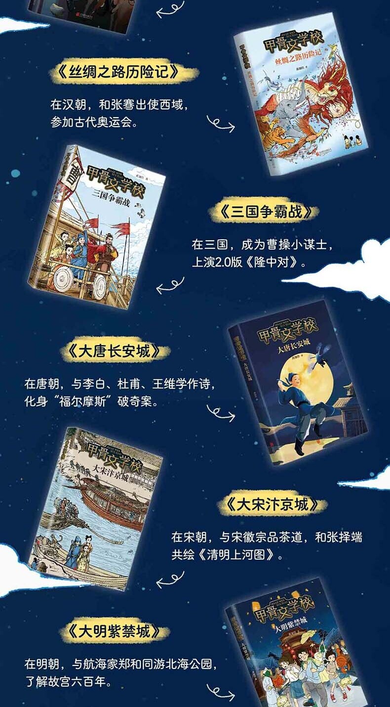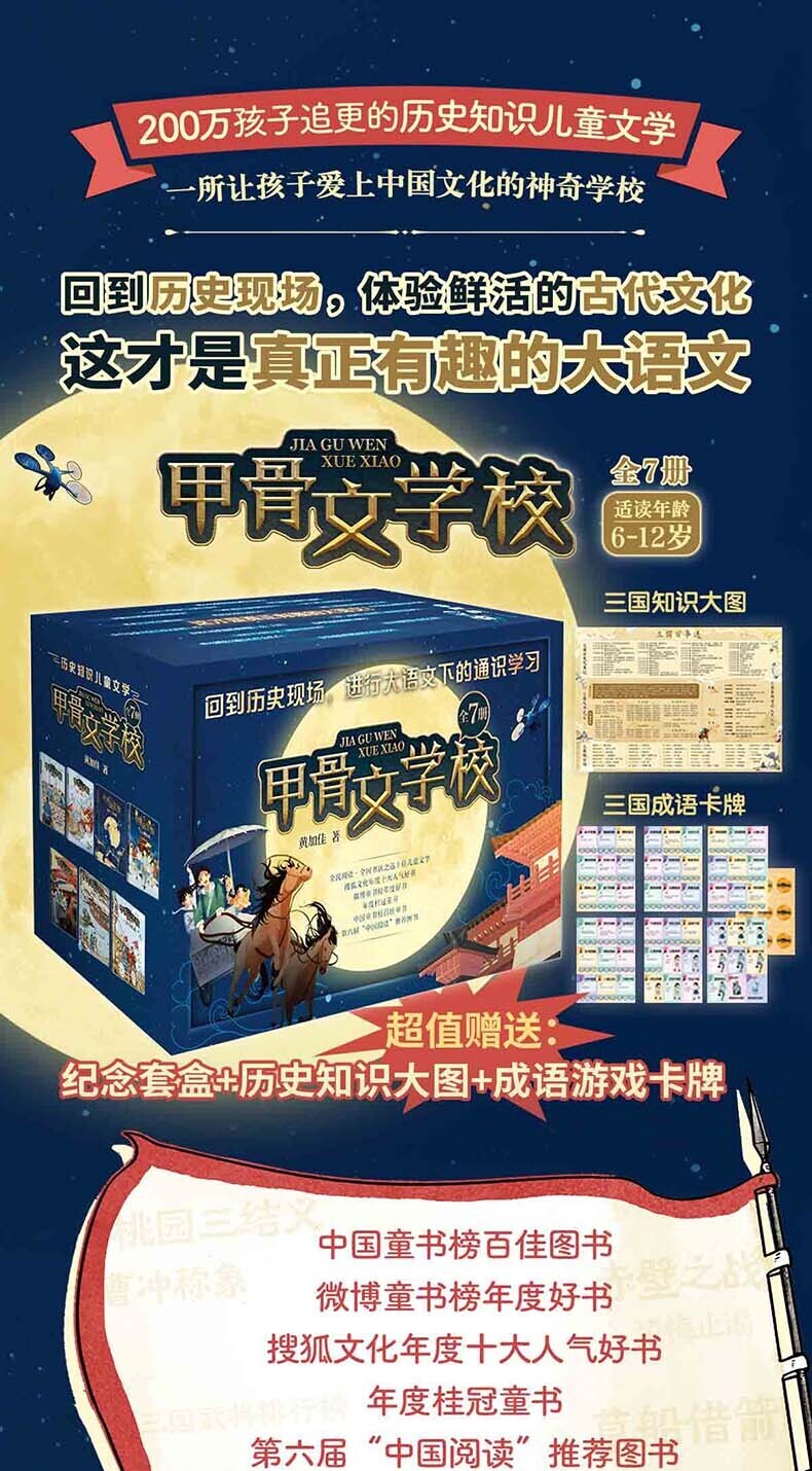 本套包括甲骨文学校系列7册:《甲骨文学校》《丝绸之路历险记》《大唐长安城》《大明紫禁城》《大秦兵马俑》《大宋汴京城》《三国争霸战》。