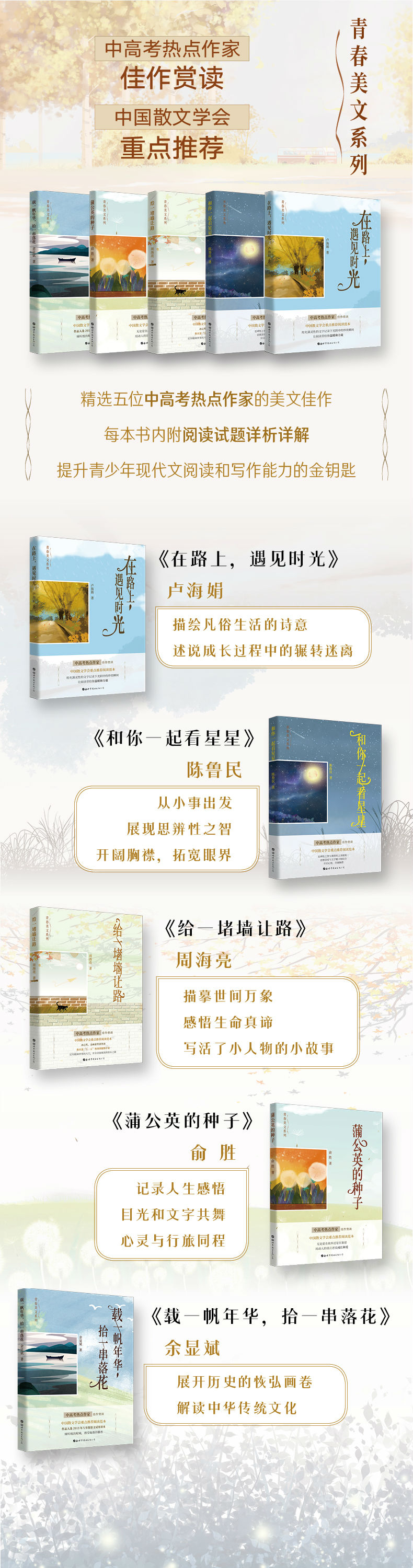 青春美文系列丛书已出版五本,精选五位中高考热点作家的美文佳作,每本书内附阅读试题详析详解。丛书所收文章立意深刻,引经据典,或独具匠心,启迪思考;或充满正能量,使人砥砺前行;或优美细腻,给人温暖和力量;或饱含哲理和学识,助人开拓视野。可谓提升青少年现代文阅读和写作能力的金钥匙。