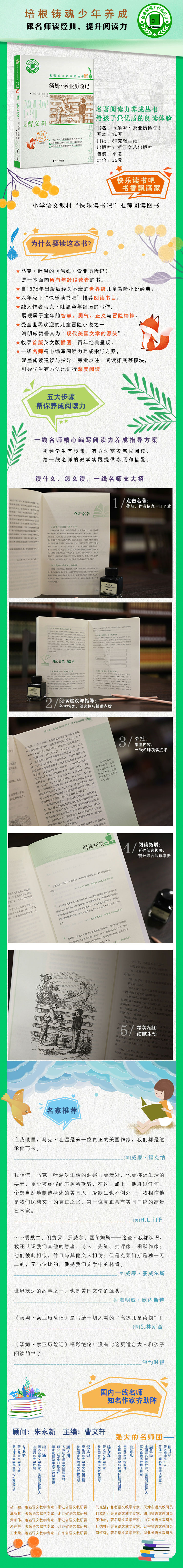 《汤姆·索亚历险记》是美国著名小说家马克·吐温的儿童文学代表作,它描写了19世纪美国儿童在乡镇生活的经典故事。主人公汤姆是个充满幻想的孩子,他像其他孩子一样非常调皮,喜欢恶作剧,但他又是个善良、可爱、乐于助孩子人。他讨厌教堂里老师毫无趣味的说教,也不喜欢枯燥无味的生活,他喜欢海盗,喜欢过新鲜刺激的生活。他总在危险时刻,做出其他孩子无法做出的正义行为,以此来向别人展示自己的魅力。《汤姆·索亚历险记(六年级下)/名著阅读力养成丛书·快乐读书吧》由儿童文学翻译家徐朴翻译,还原了马克·吐温幽默风趣的语言风格,展现了少年的冒险精神。该儿童小说以其幽默的语言风格,精彩的人物描写,被誉为美国“黄金时代”的一首田园牧歌。