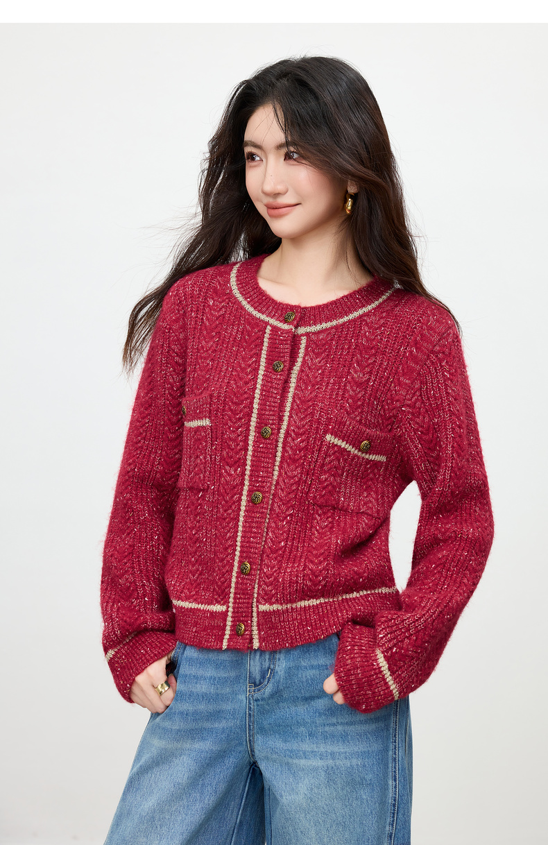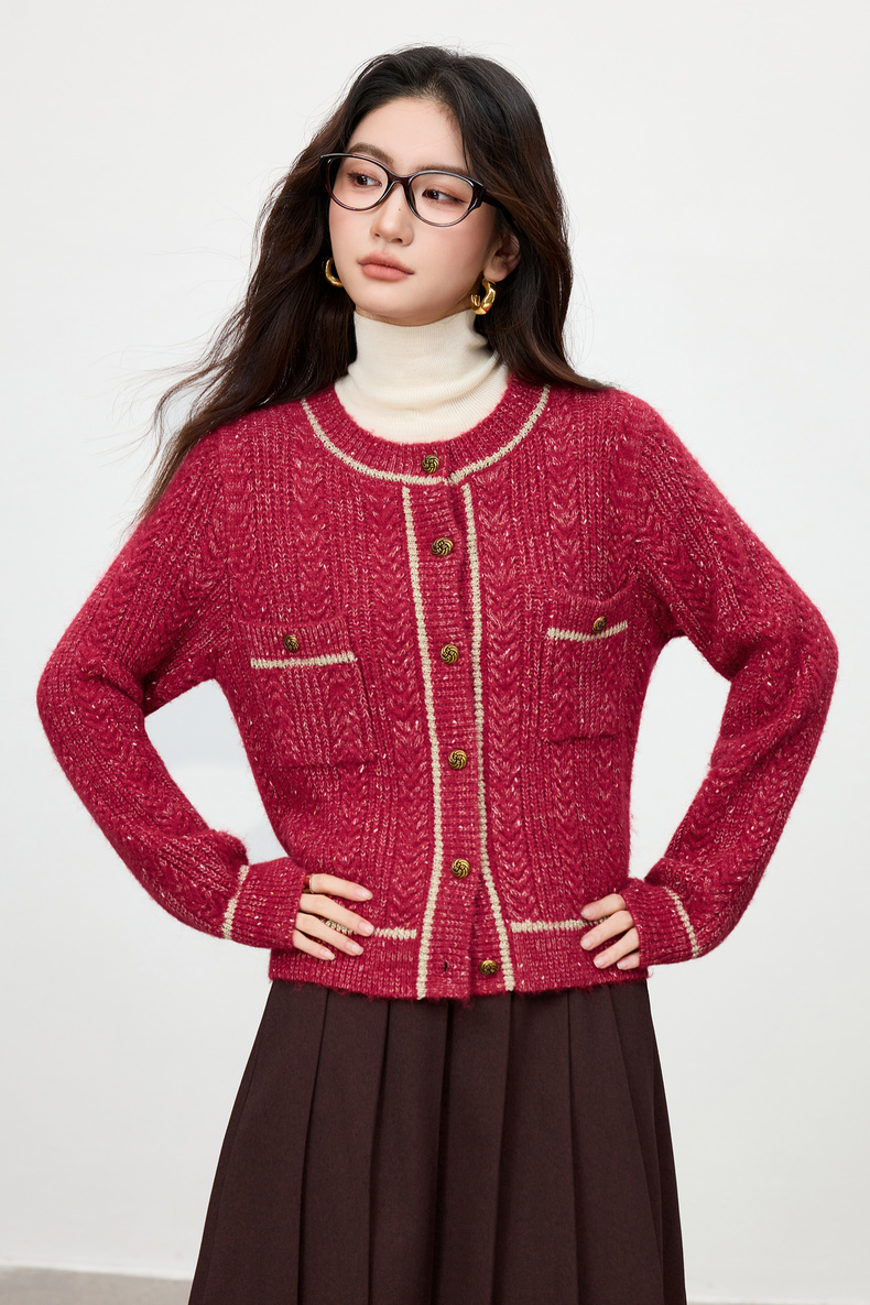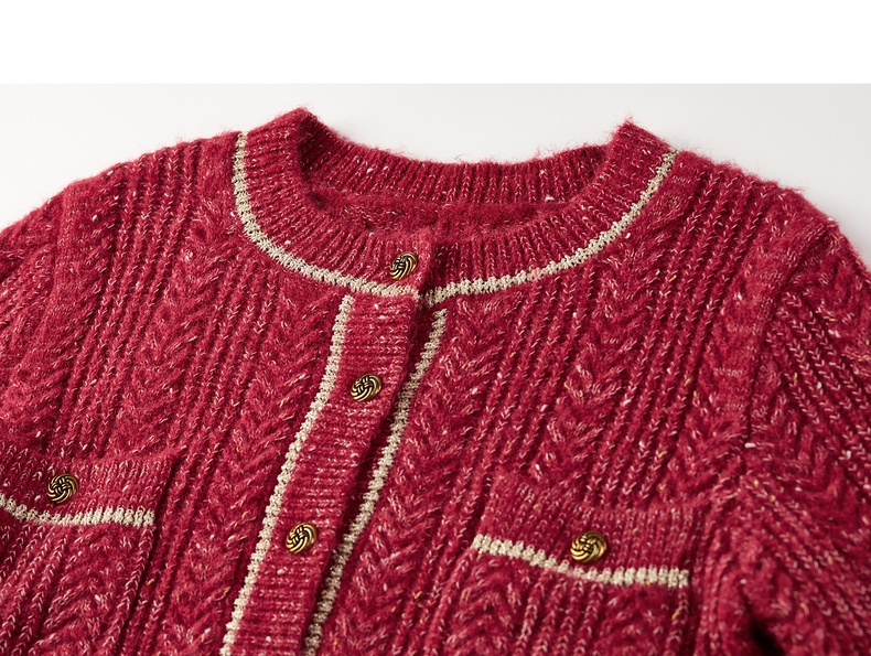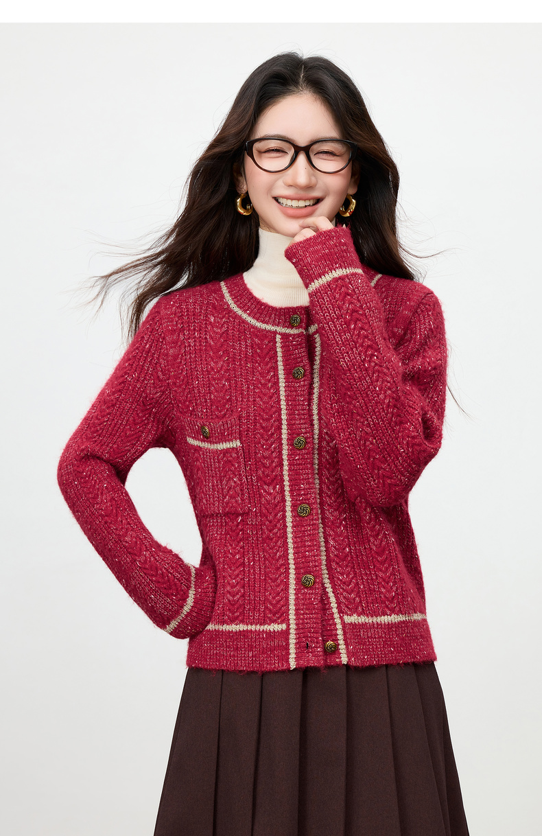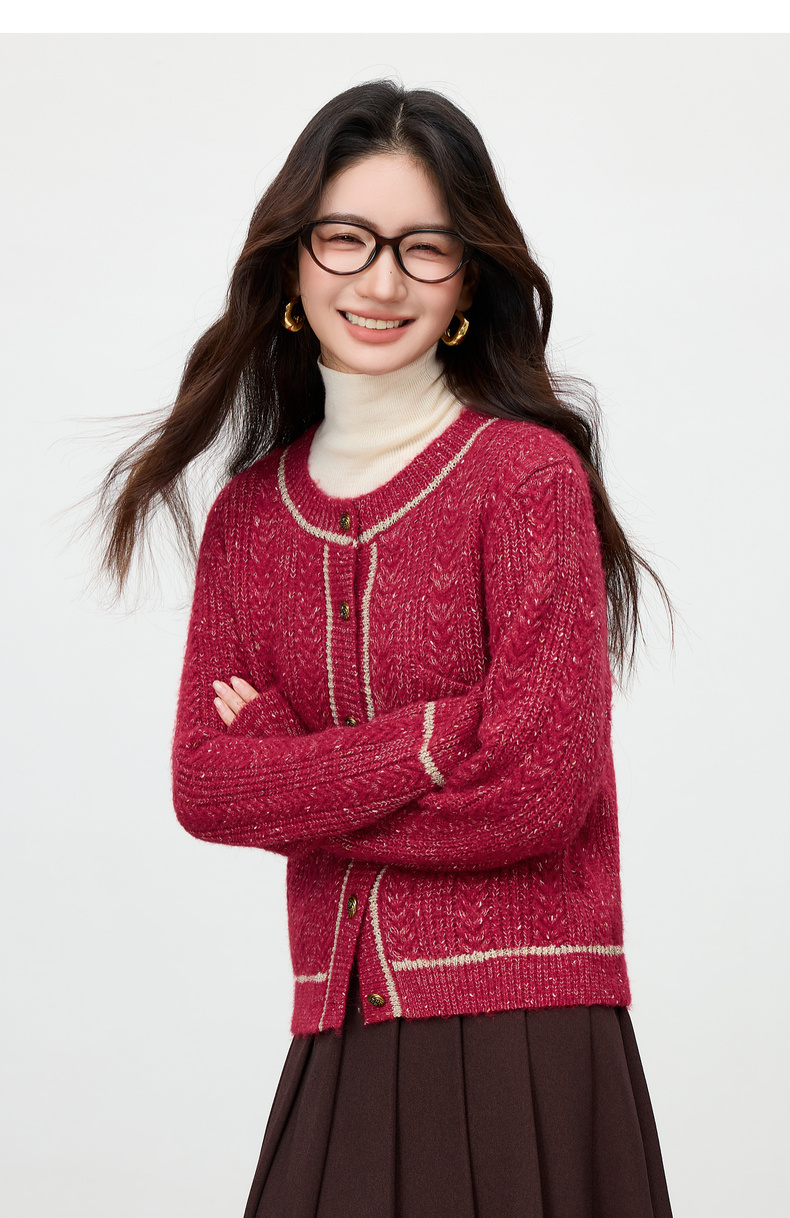 【内购】【云朵衫】优雅通勤撞色细边圆领扭结扣弹力亮丝肌理开衫毛衣-W54EB4148