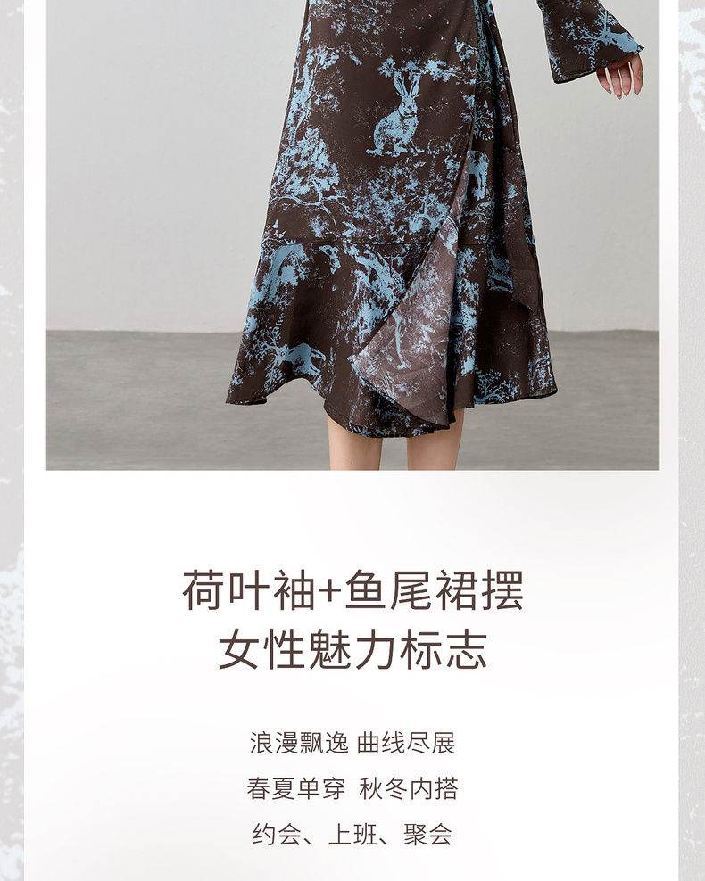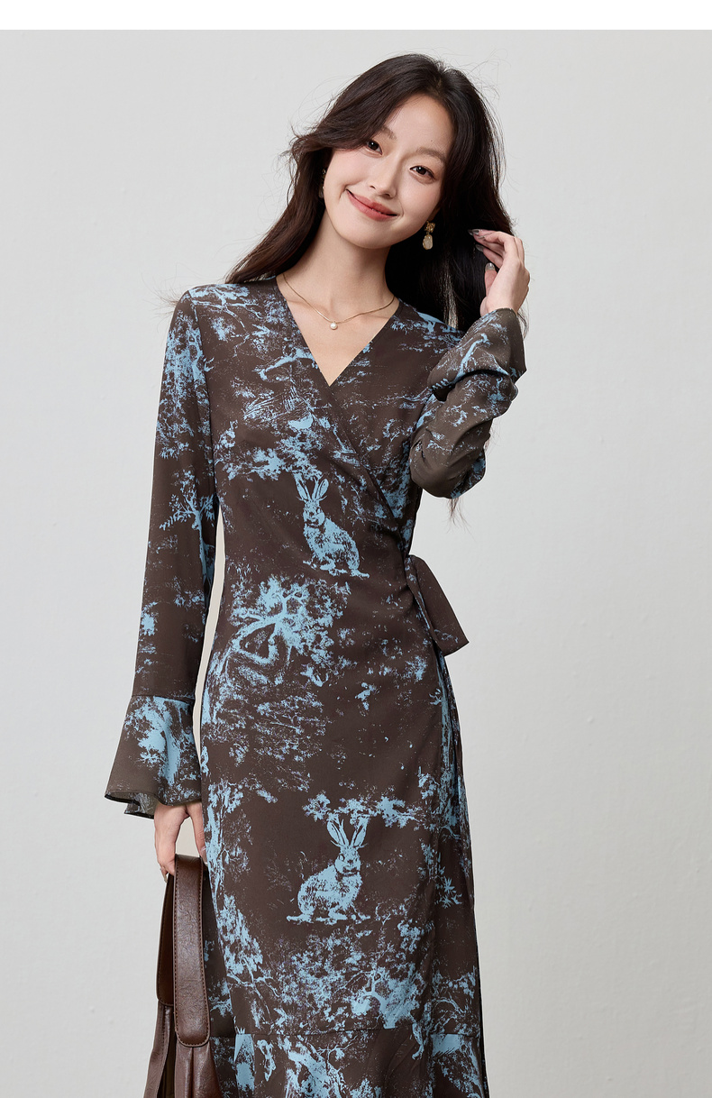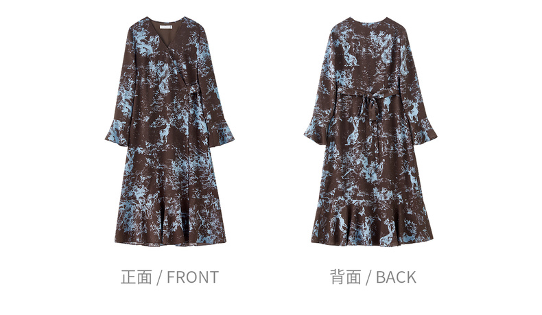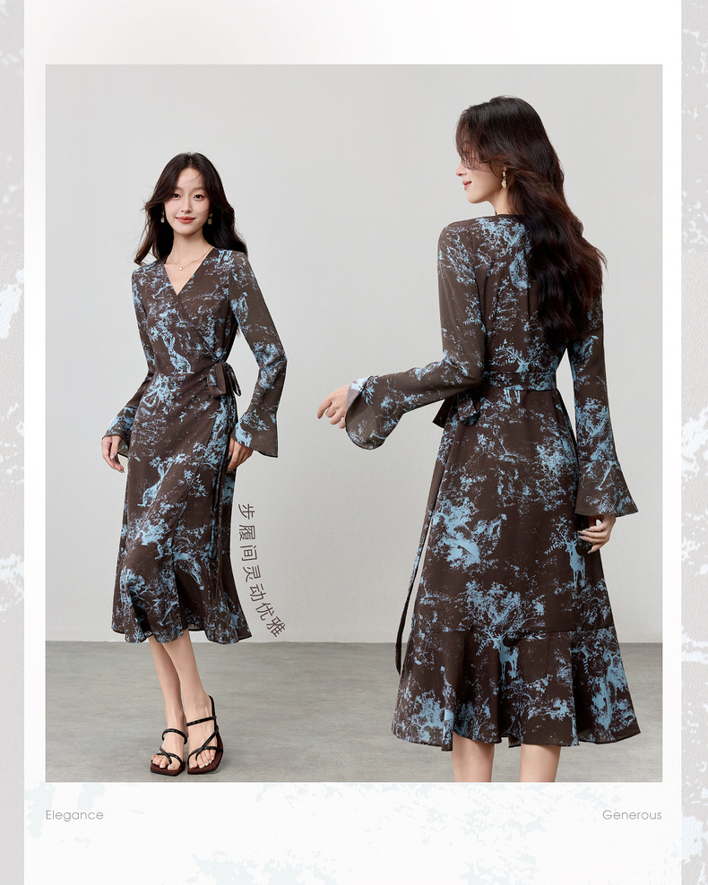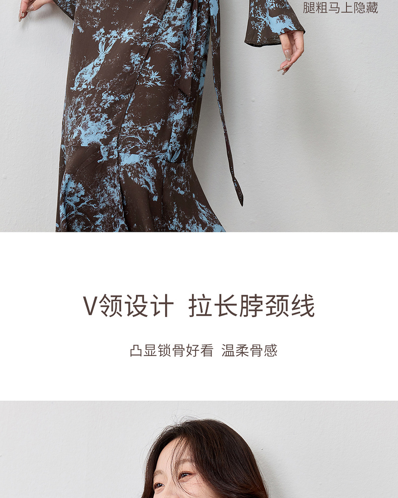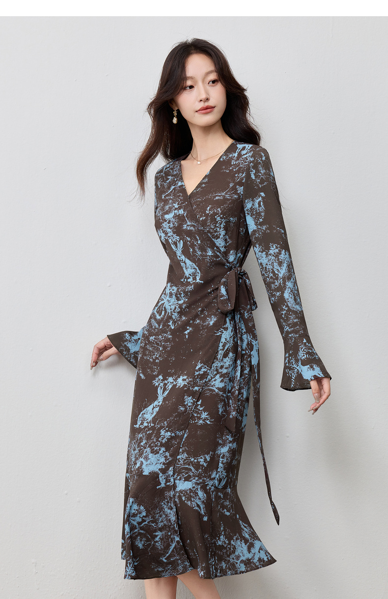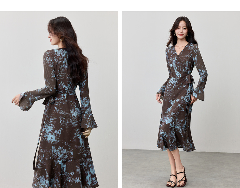 【内购】【一片式系带】优雅通勤V领腰侧系绑带喇叭袖收腰雪纺鱼尾连衣裙-Q53LF2805