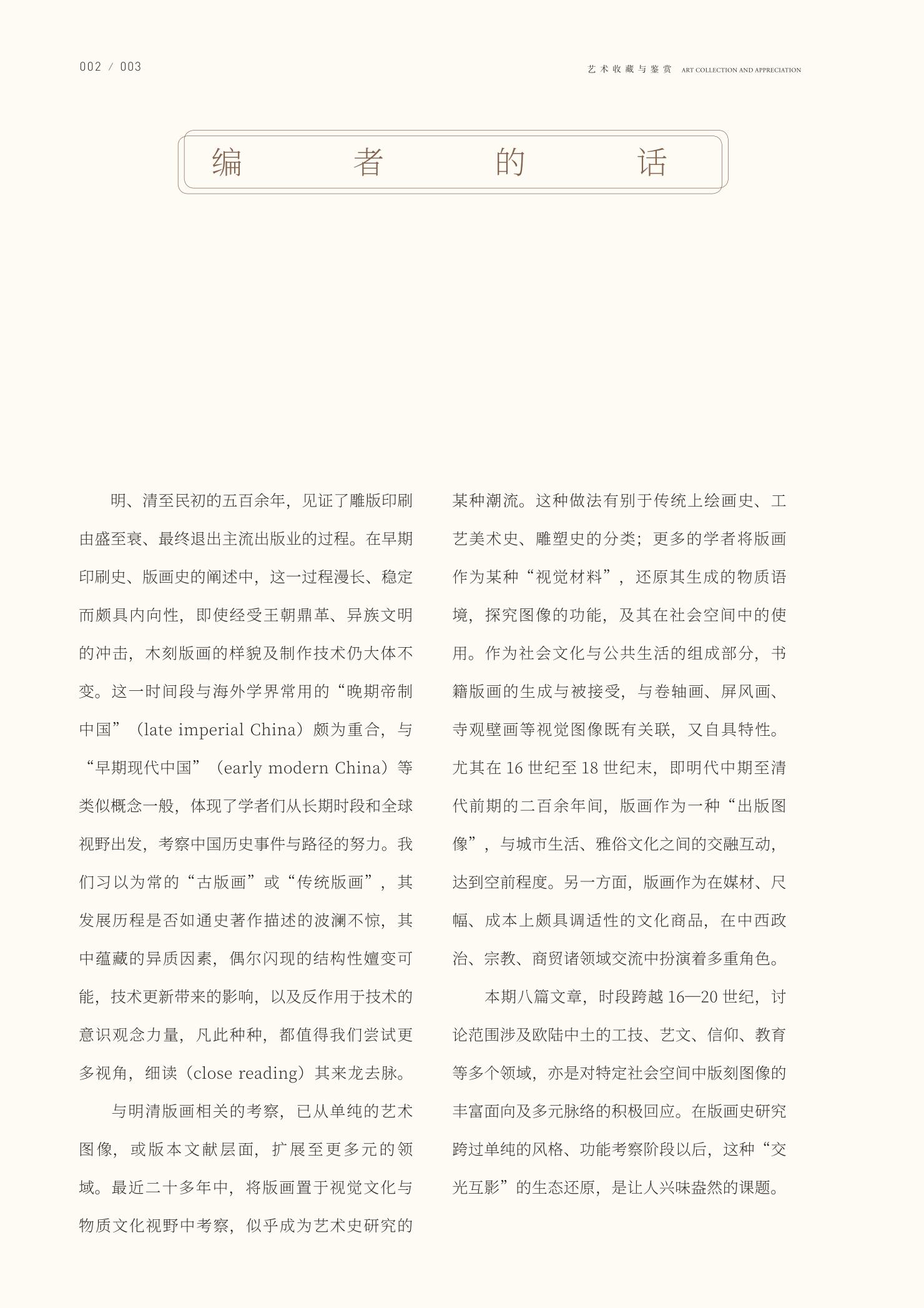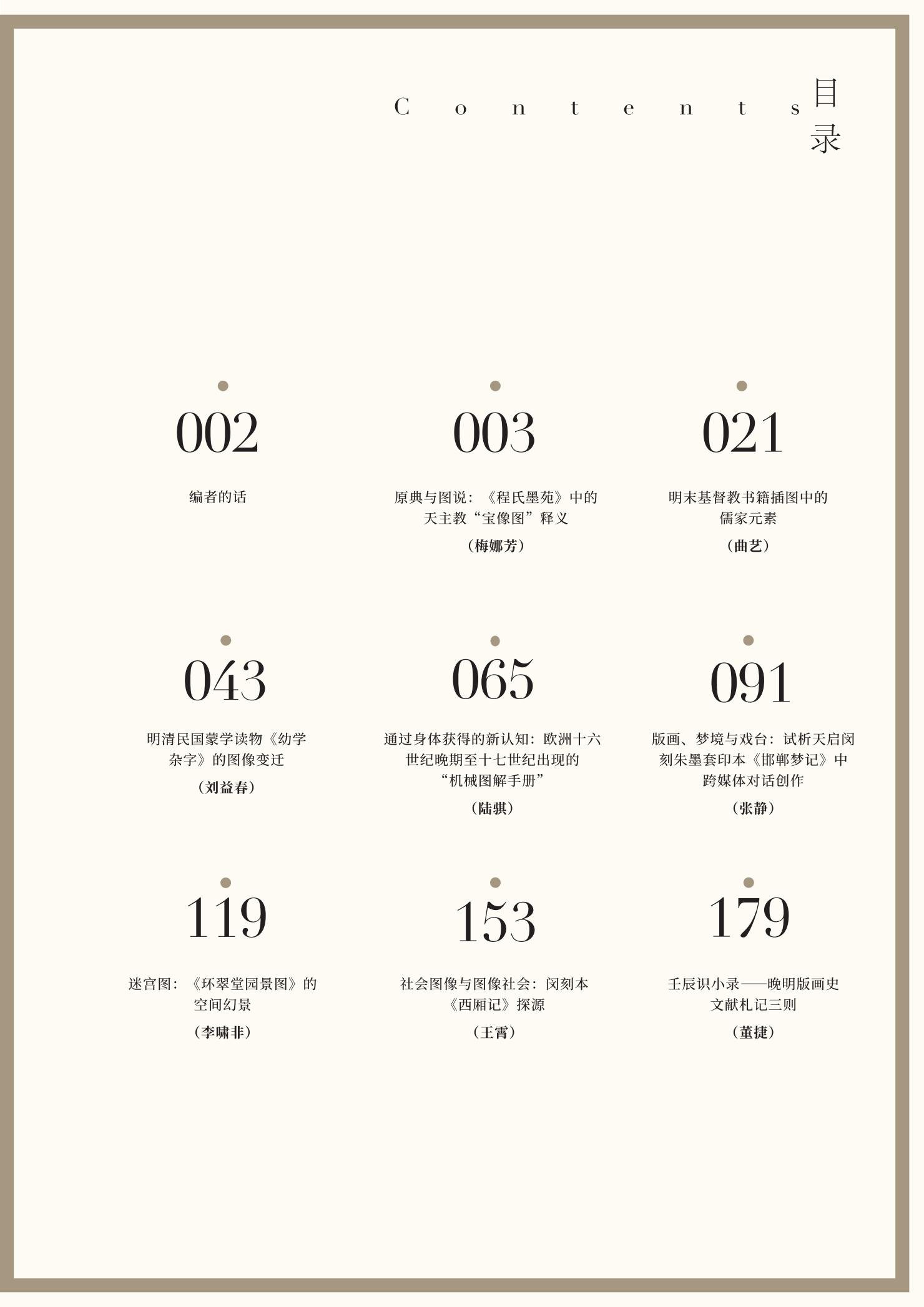与明清版画相关的考察,已从单纯的艺术图像,或版本文献层面,扩展至更多元的领域。最近二十多年中,将版画置于视觉文化与物质文化视野中考察,似乎成为艺术史研究的某种潮流。这种做法有别于传统上绘画史、工艺美术史、雕塑史的分类;更多的学者将版画作为某种“视觉材料”,还原其生成的物质语境,探究图像的功能,及其在社会空间中的使用。作为社会文化与公共生活的组成部分,书籍版画的生成与被接受,与卷轴画、屏风画、寺观壁画等视觉图像既有关联,又自具特性。尤其在16世纪至18世纪末,即明代中期至清代前期的二百余年间,版画作为一种“出版图像”,与城市生活、雅俗文化之间的交融互动,达到空前程度。另一方面,版画作为在媒材、尺幅、成本上颇具调适性的文化商品,在中西政治、宗教、商贸诸领域交流中扮演着多重角色。本期八篇文章,时段跨越16—20世纪,讨论范围涉及欧陆中土的工技、艺文、信仰、教育等多个领域,亦是对特定社会空间中版刻图像的丰富面向及多元脉络的积极回应。在版画史研究跨过单纯的风格、功能考察阶段以后,这种“交光互影”的生态还原,是让人兴味盎然的课题。