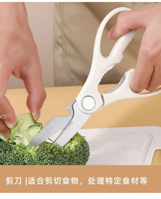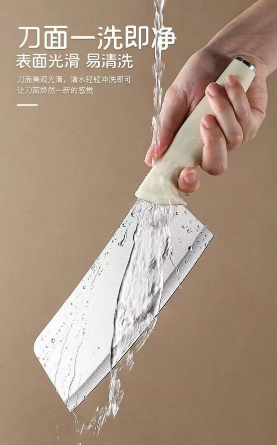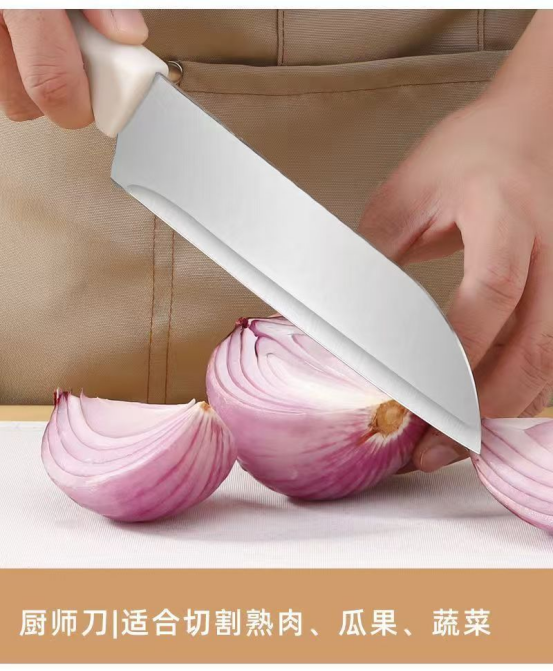 【一见倾心的北欧风设计】 刀身采用奶白+金属流线造型,灵感源自黑鳍鲨捕食姿态, 鲨鱼鳍仿生设计不仅好看,还能减轻切剁阻力,连砍筒骨都毫不费力! 分体式ABS刀座可拆卸清洗,彻底告别木质刀座发霉烦恼, 电镀底座高级感拉满,随便摆在台面上都是艺术品~