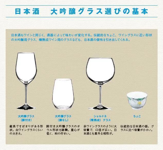 另外一种就是白葡萄酒杯,因为和白葡萄酒类似,大吟酿酒体较轻,而且同样适合冰镇后饮用。更为窄的杯口第一是可以保持较低的温度,二是可以更好的聚集大吟酿的香气。现在很多的专业清酒评测比赛都开始使用白葡萄酒杯来进行。