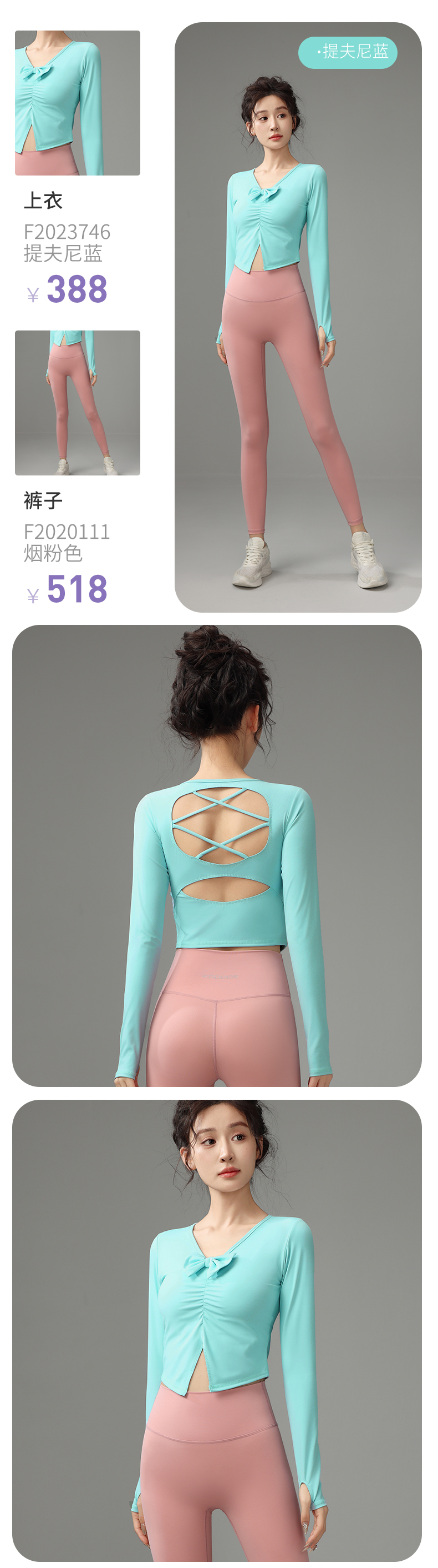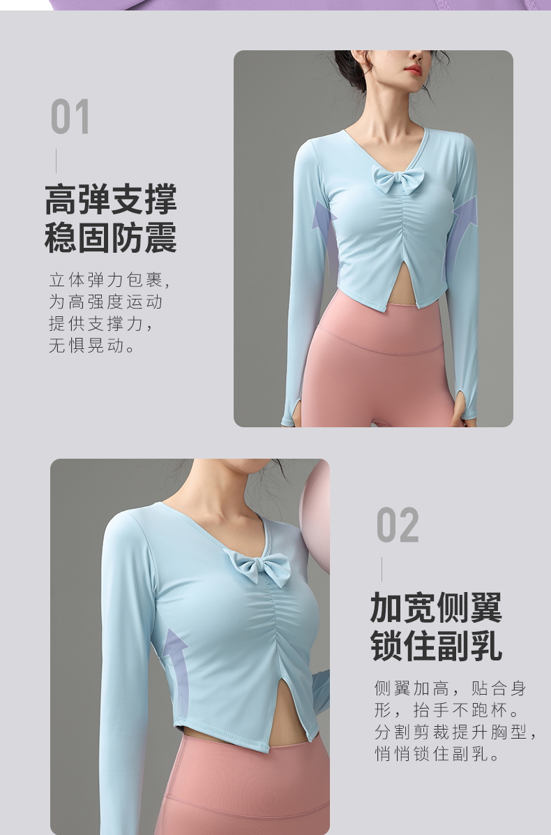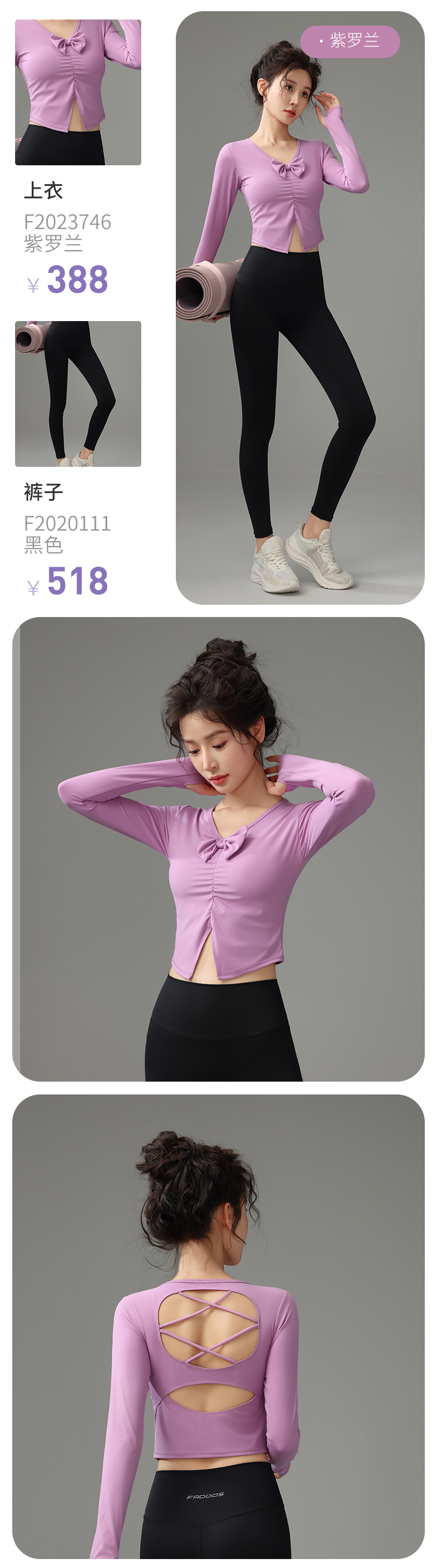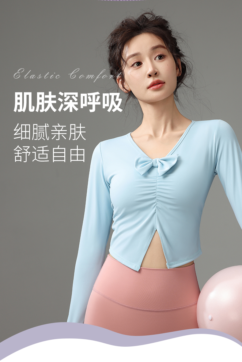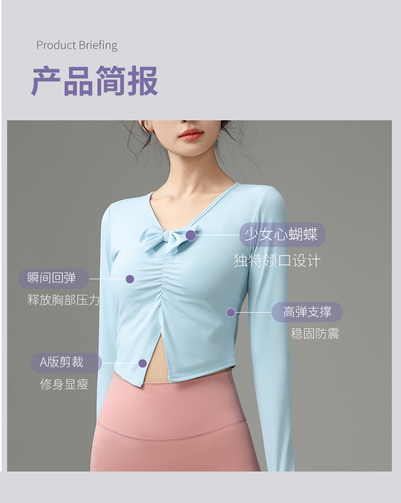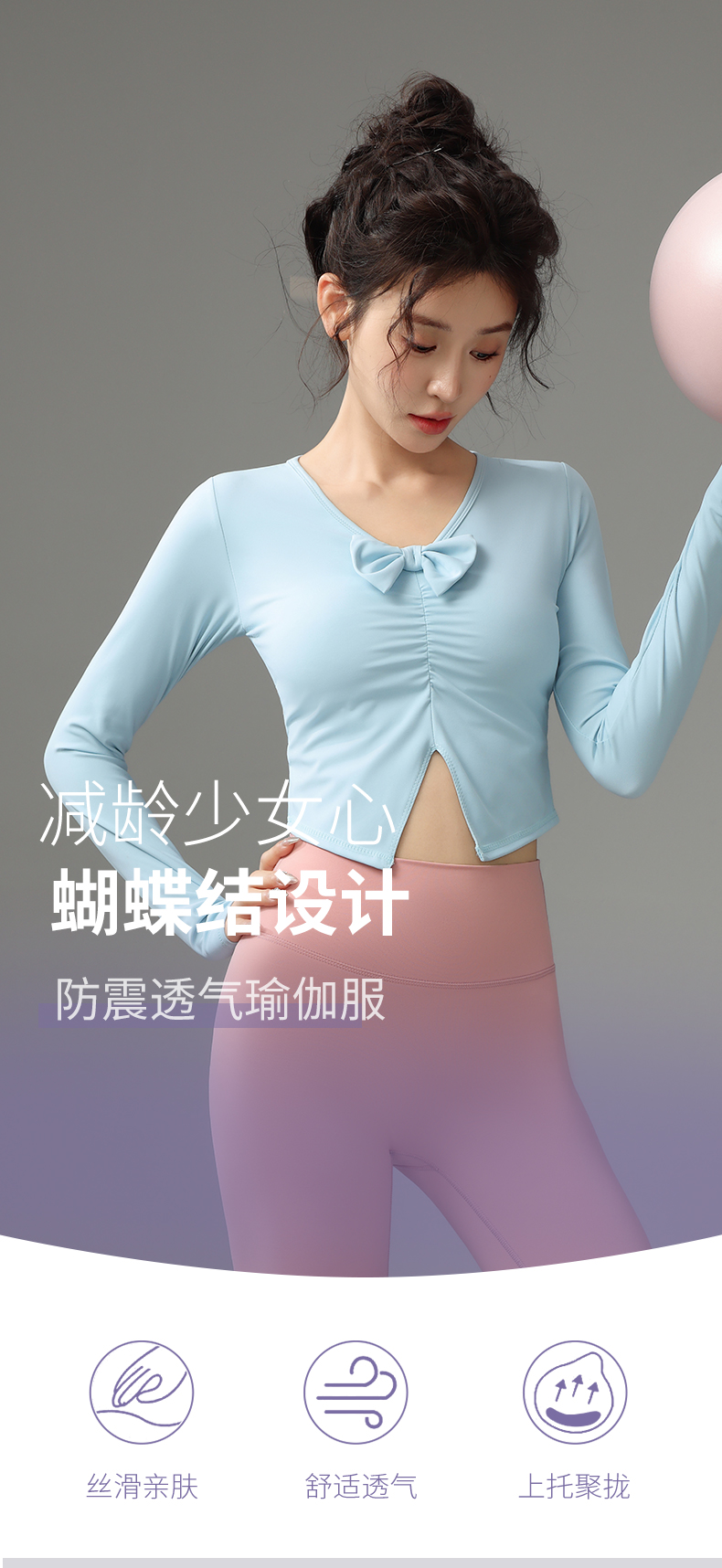 F2023746梵蒂欧V领小清新瑜伽长袖显瘦小蛮腰瑜伽服长袖一体杯