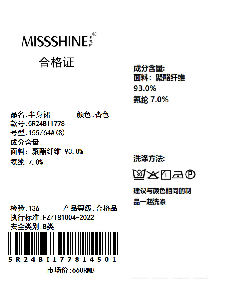 | 详细材质信息: | 面料:聚酯纤维 93.0% 氨纶 7.0% |