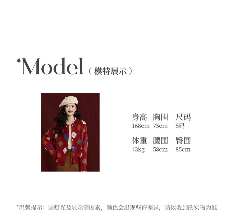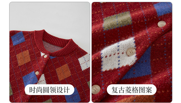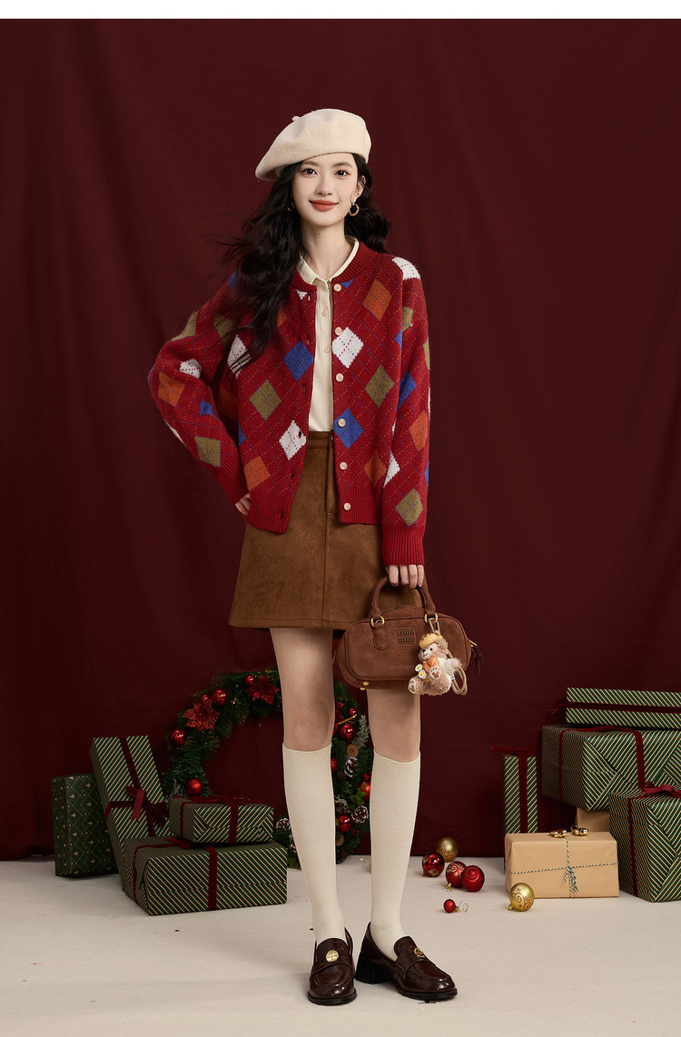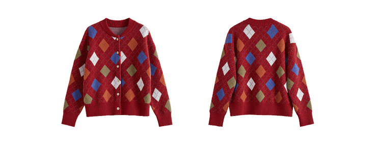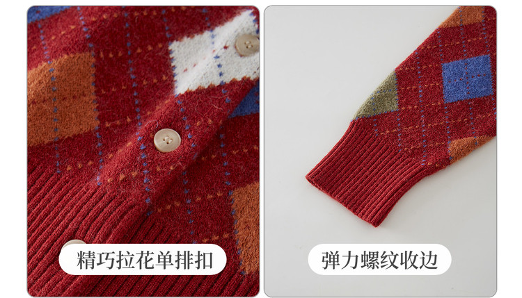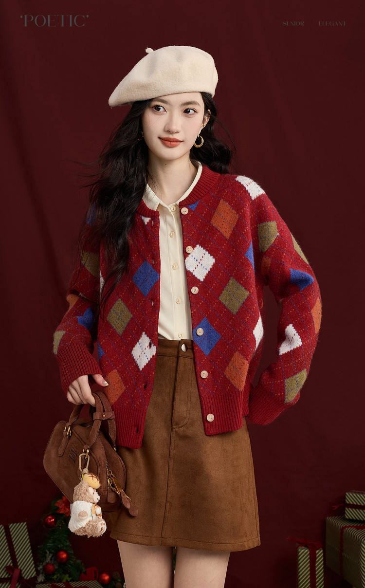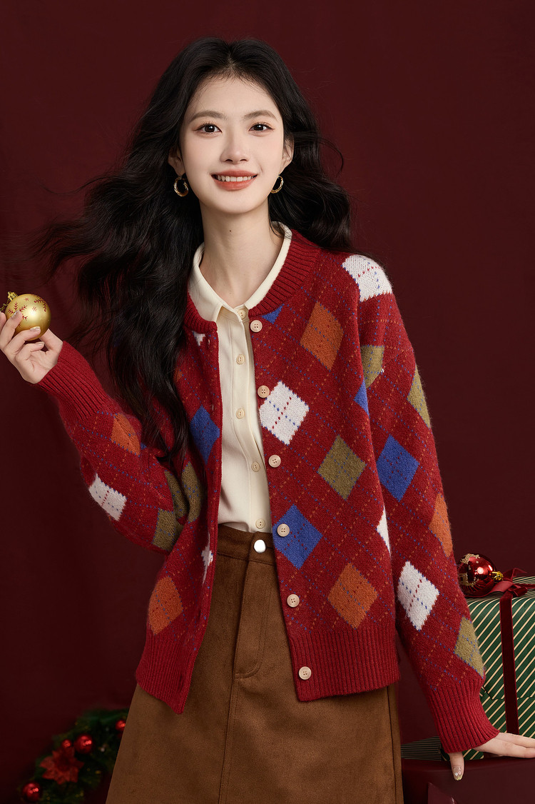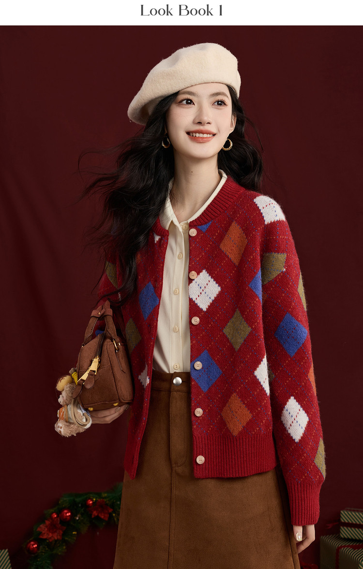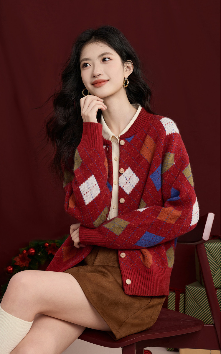 【12/31新品】熙世界新年穿搭红色菱格针织开衫女2025秋冬新款撞色复古毛衣外套
