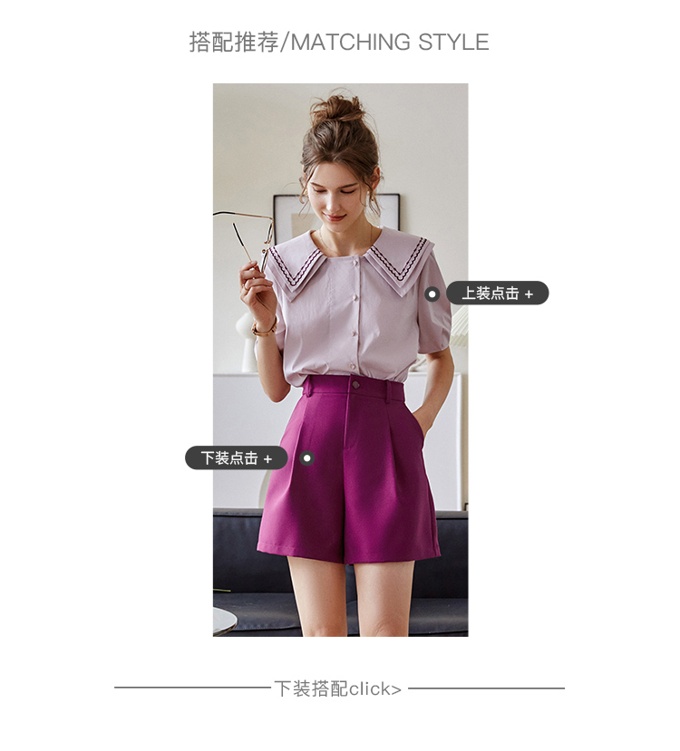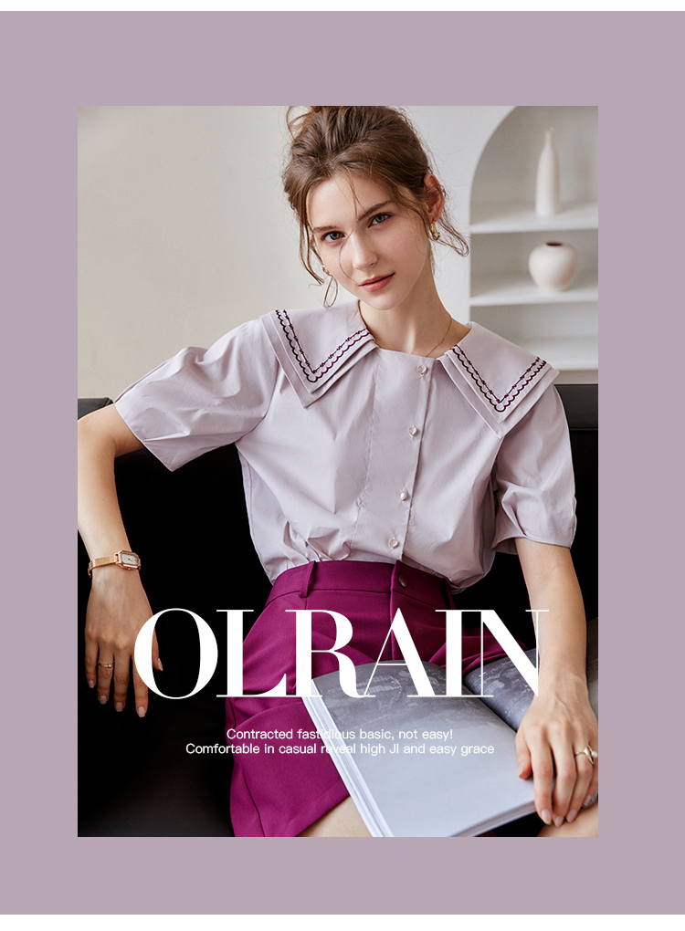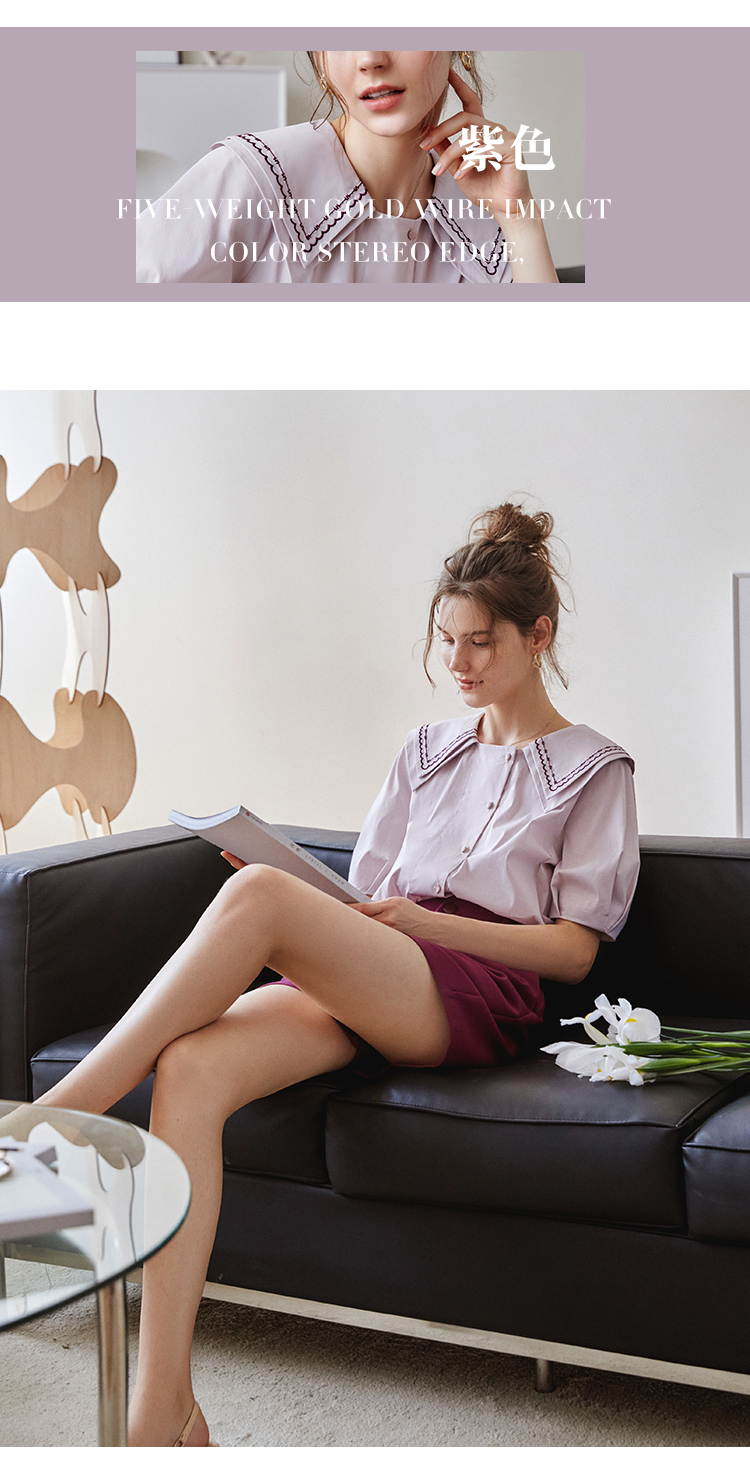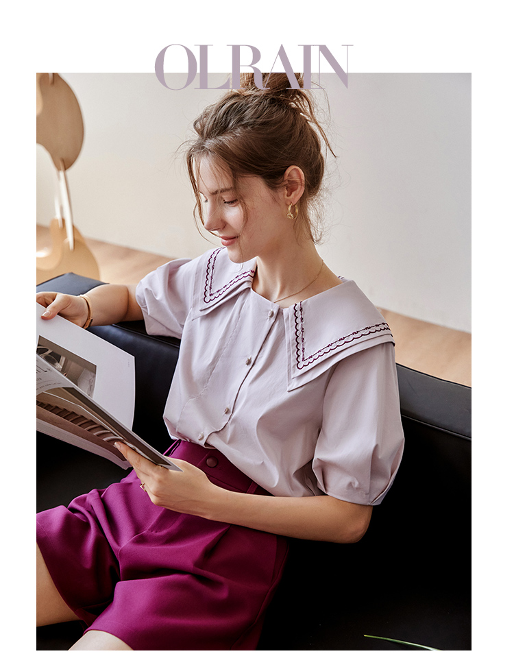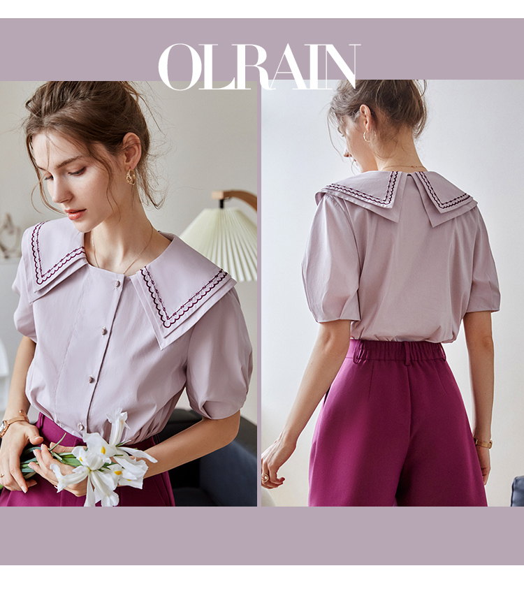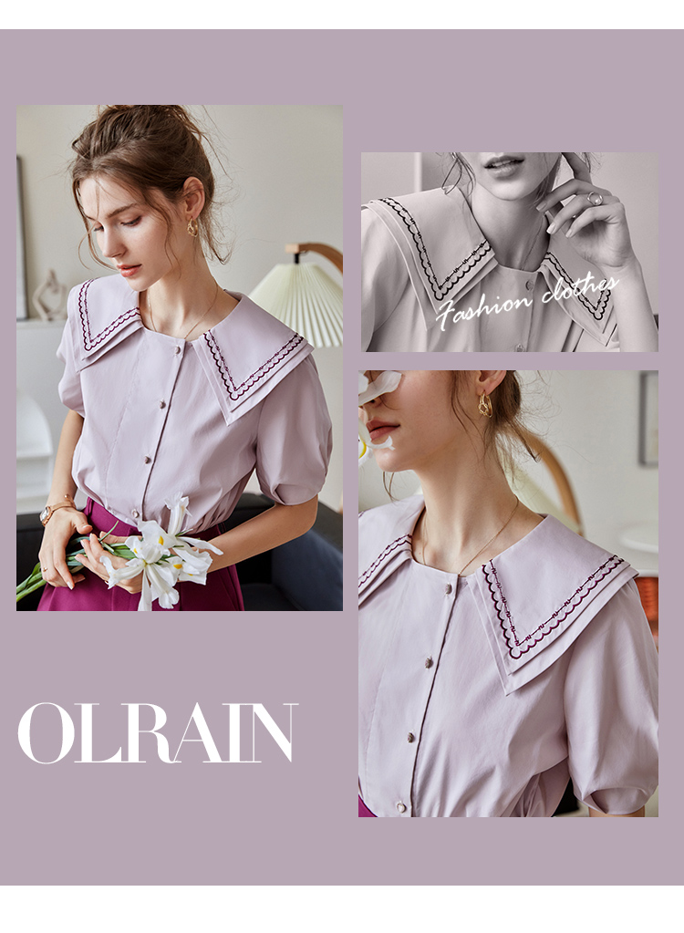 【欧芮儿衬衫女夏薄款小众法式别致上衣女设计感2021新款短袖紫色衬衣