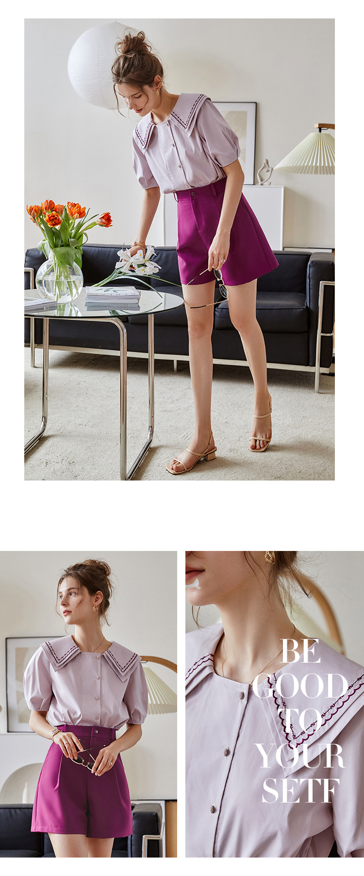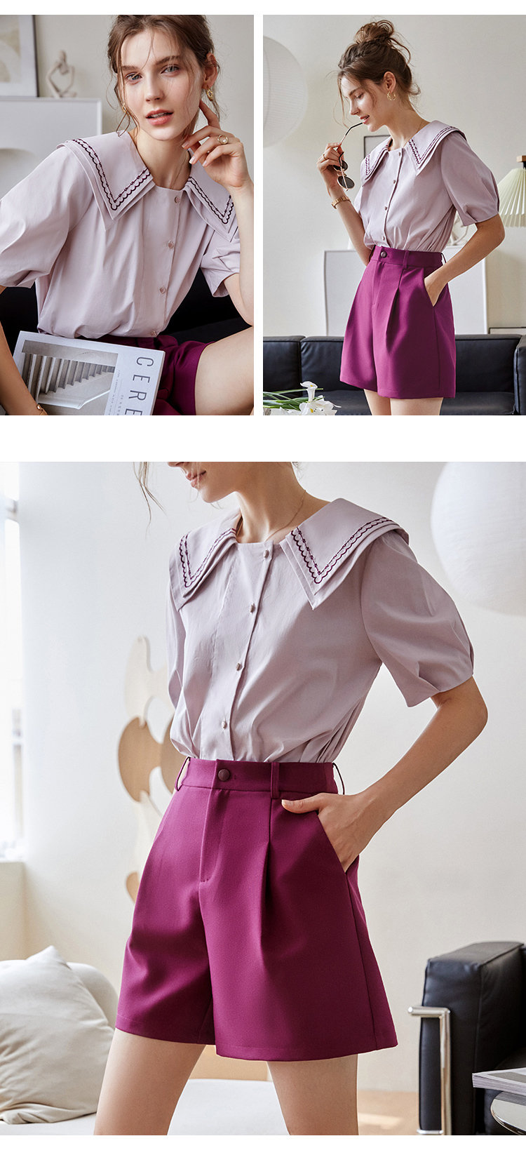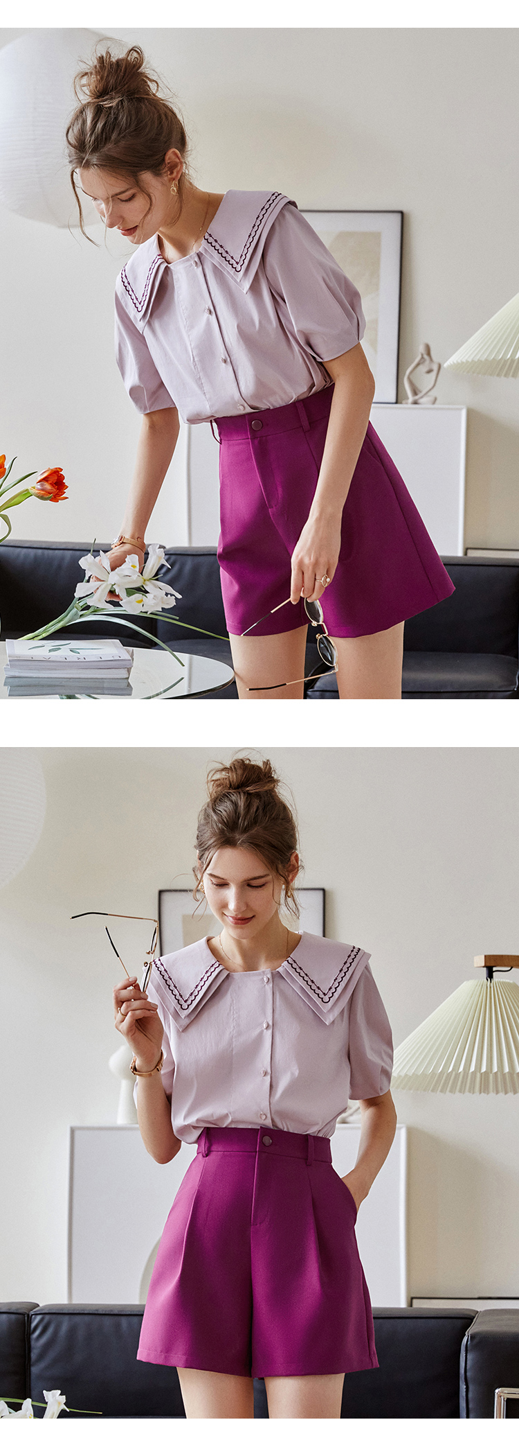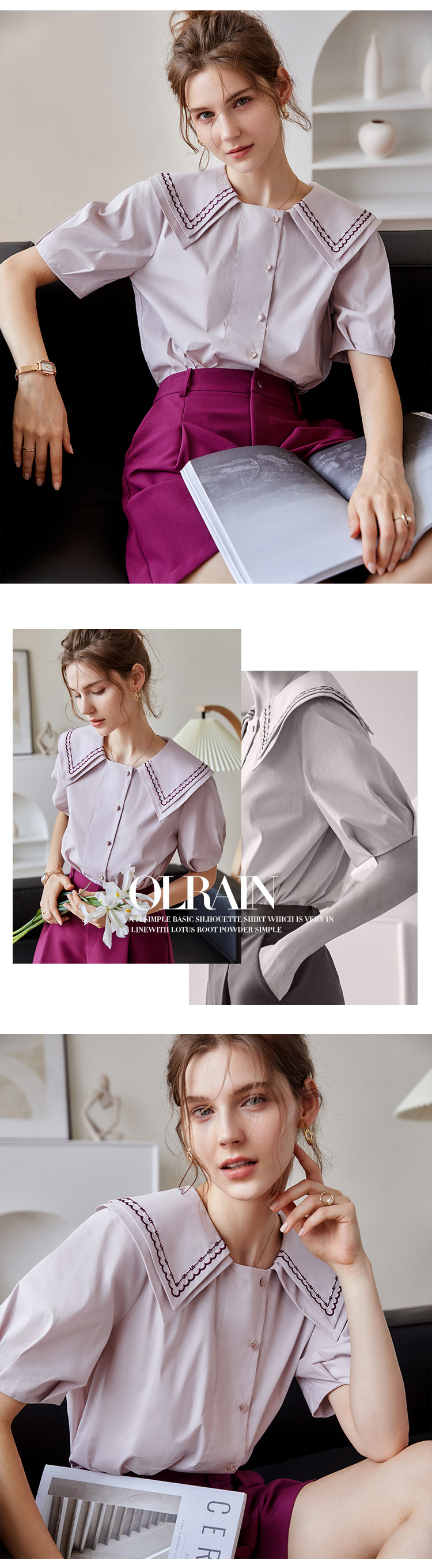 【欧芮儿衬衫女夏薄款小众法式别致上衣女设计感2021新款短袖紫色衬衣