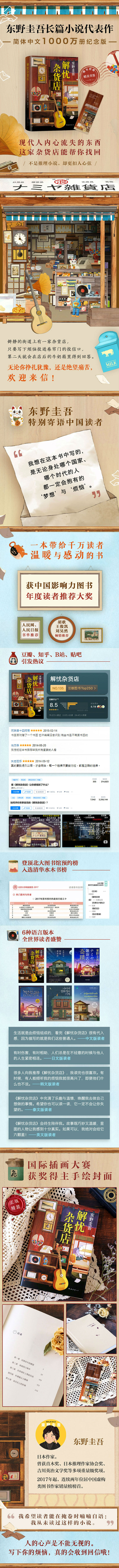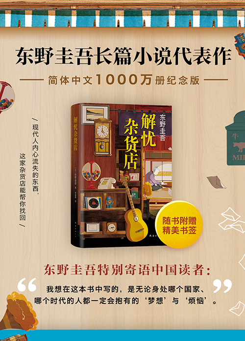 《解忧杂货店》是东野圭吾的奇迹之作,运用巧妙的构思和奇幻的设定,让温情、惊喜与感动悄然渗入读者心中,回味无穷。《解忧杂货店》的销量已突破1000万册,为此,东野圭吾特别寄语中国读者:“《解忧杂货店》能在中国拥有这么多读者,对我而言既是荣幸也是鼓励。我想在这本书中写的,是无论身处哪个国家、哪个时代的人都一定会抱有的‘梦想’与‘烦恼’。人之所以为人,正是因为这无尽的梦想与烦恼吧。”