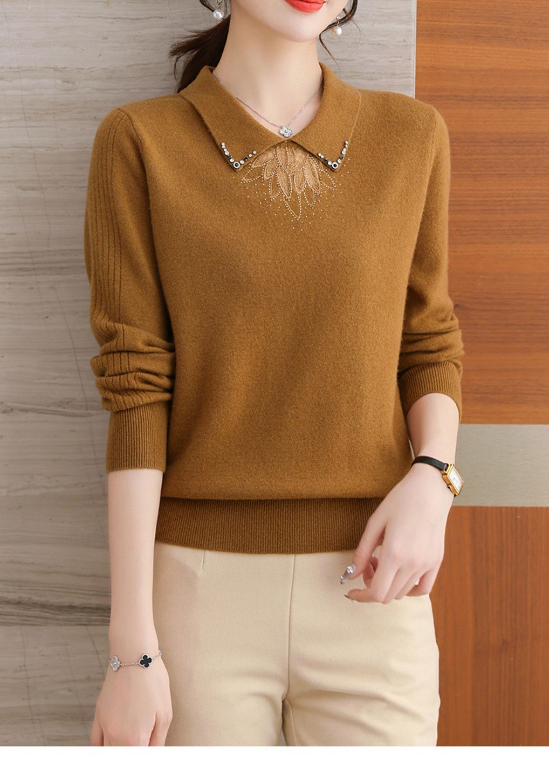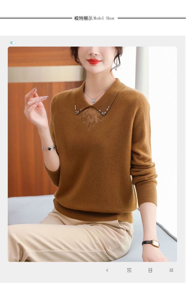 秋冬女士polo领纯羊毛打底衫,新款翻领镂空短毛衣刺绣针织上衣CC-10-3557