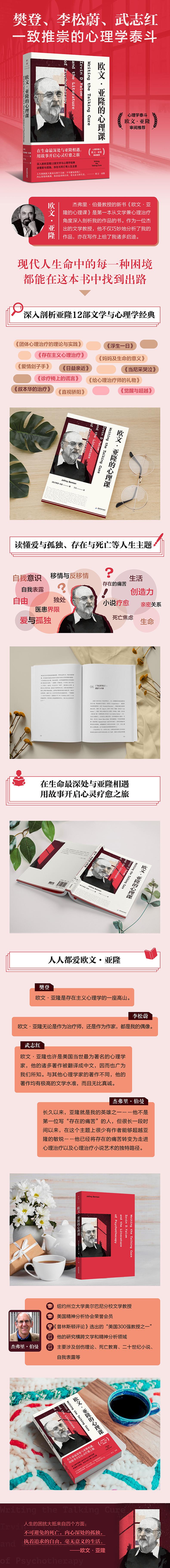" ★樊登、李松蔚、武志红一致推崇的心理学泰斗 ★在生命最深处与亚隆相遇,用故事开启心灵疗愈之旅 ★现代人生命中的每一种困境,都能在这本书中找到出路 ★深入解读《团体心理治疗的理论与实践》《日益亲近》《存在主义心理治疗》《觉醒与超越》《爱情刽子手》《当尼采哭泣》《诊疗椅上的谎言》《妈妈及生命的意义》《给心理治疗师的礼物》《叔本华的治疗》《直视骄阳》《浮生一日》共12部文学与心理学经典 ★读懂自我表露、移情与反移情、存在的痛苦、医患界限、小说疗愈、创造力、爱与孤独、死亡焦虑…… ★欧文·亚隆亲自审阅并推荐:“杰弗里·伯曼教授的新书《欧文·亚隆的心理课》是第一本从文学兼心理治疗角度深入剖析我的作品的书。” ★人生的困扰大抵来自四个方面:不可避免的死亡,内心深处的孤独,执着追求的自由,毫无意义的生活。——欧文·亚隆"