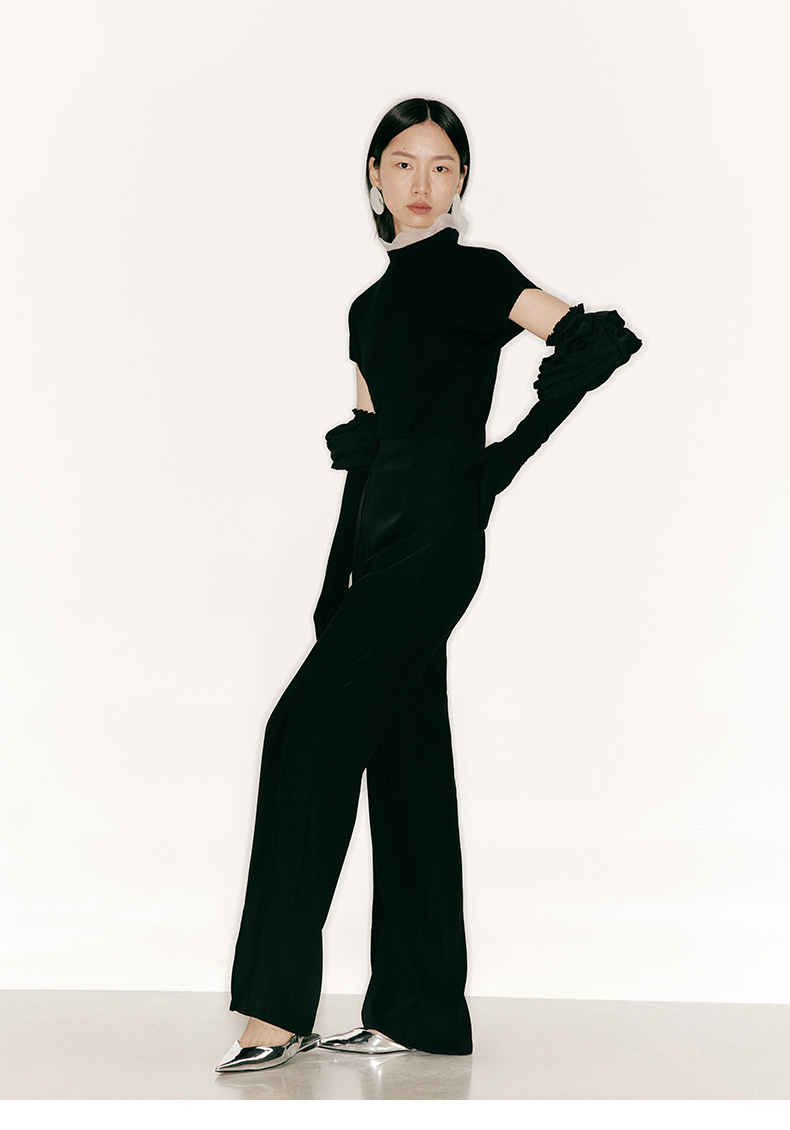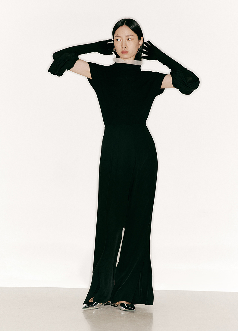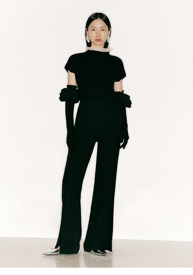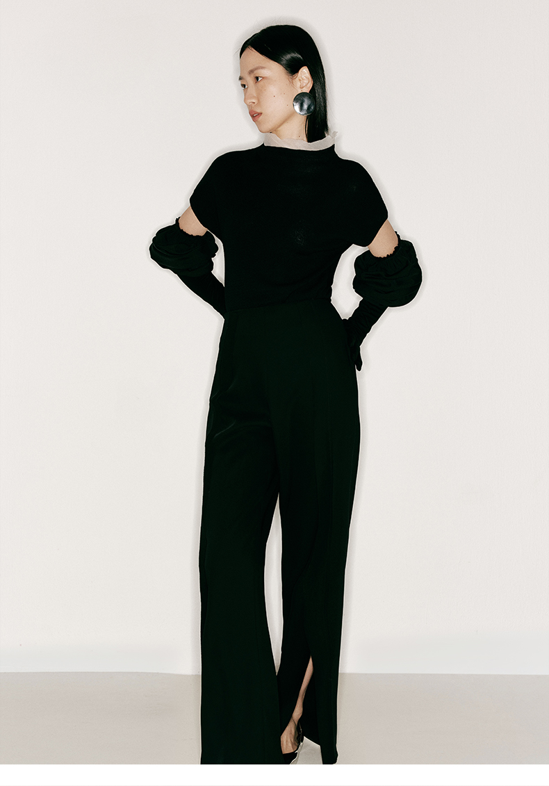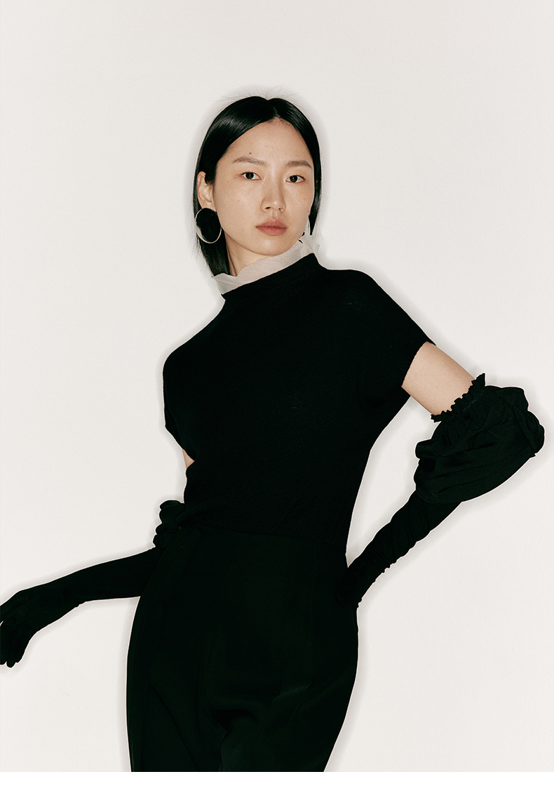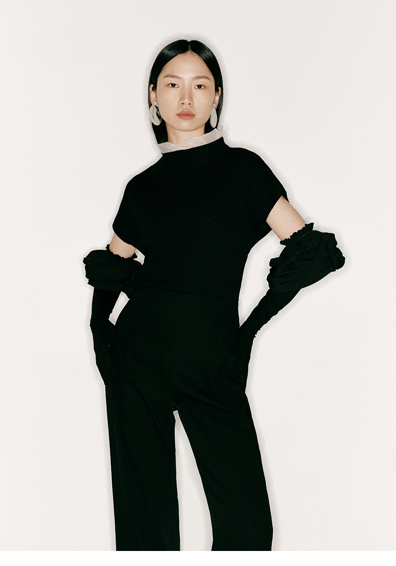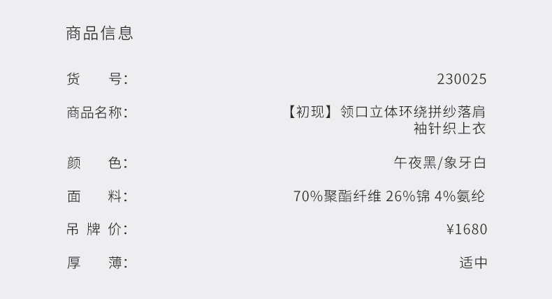【初现】领口立体环绕拼纱落肩袖针织上衣/230025