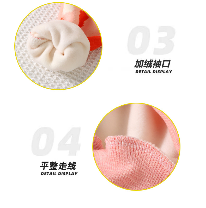 领口是螺纹 小圆领;袖口、下摆,罗纹收口, 圆领包边领口设计,修饰脖颈 袖口和下摆处都采用收边设计 微微收紧的设计,有效避免着凉! 不易跑风,增加保暖性~