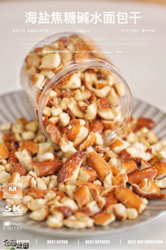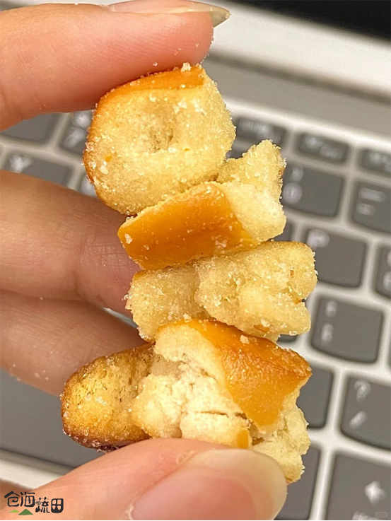 海盐焦糖口味的面包干,外面有一层海盐粒, 更加激发麦香和碱香,口感上层次更加丰富了! 一口下去嘎脆,吃起来咸香咸香的, 还夹杂着焦糖的香味! 咸咸甜甜酥酥脆脆的,越吃越香, 吃完真的忍不住嗦手指😋~