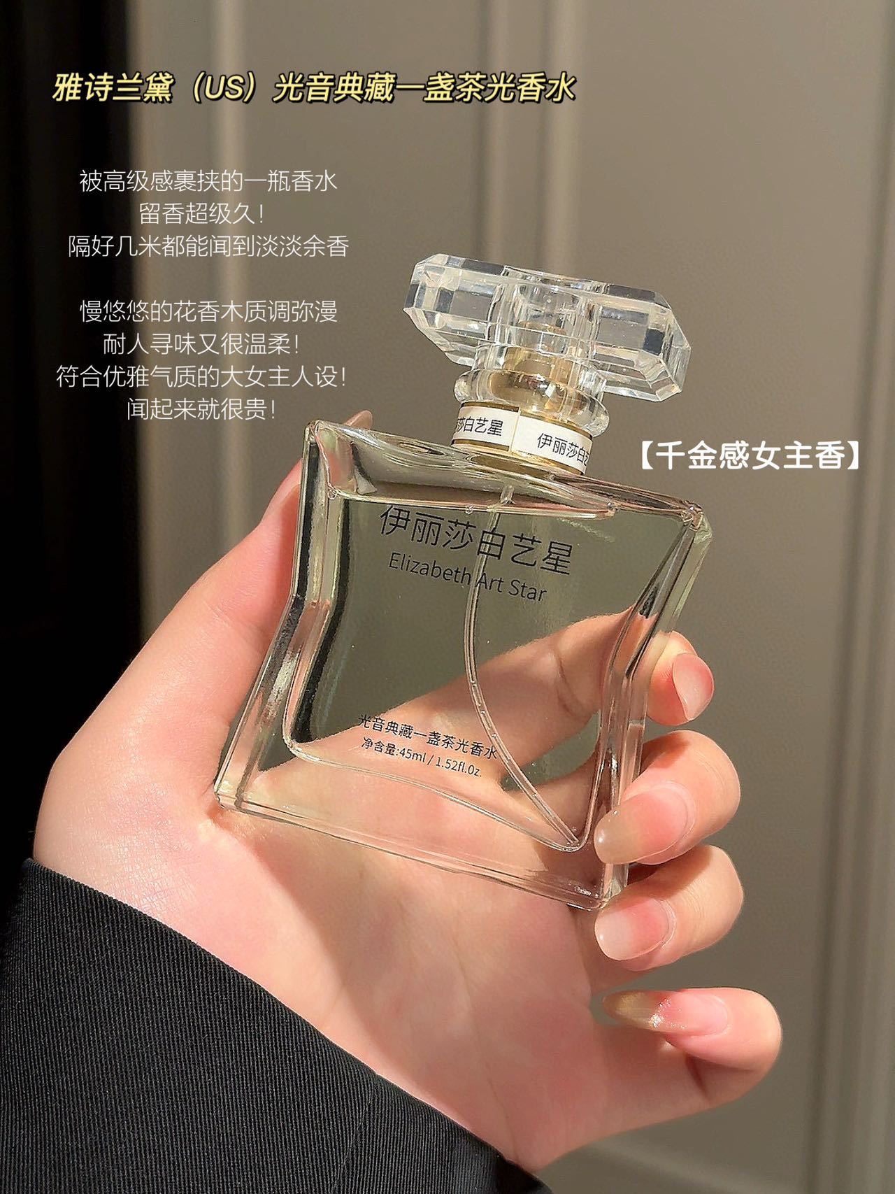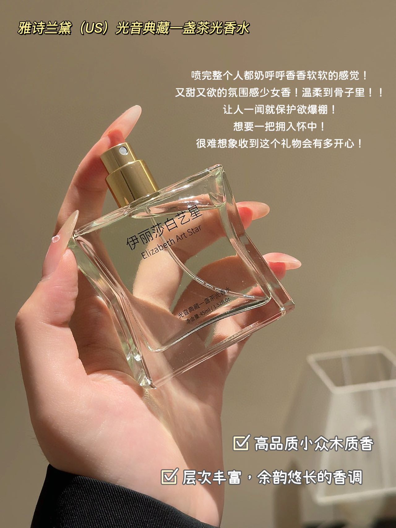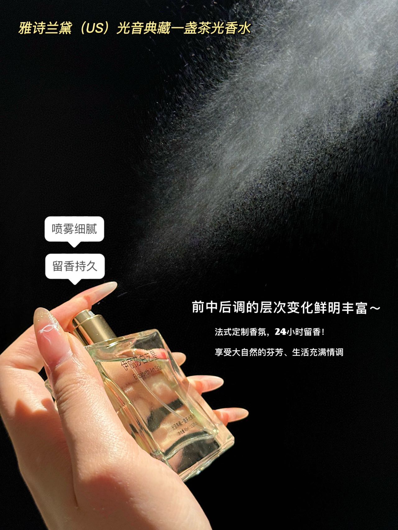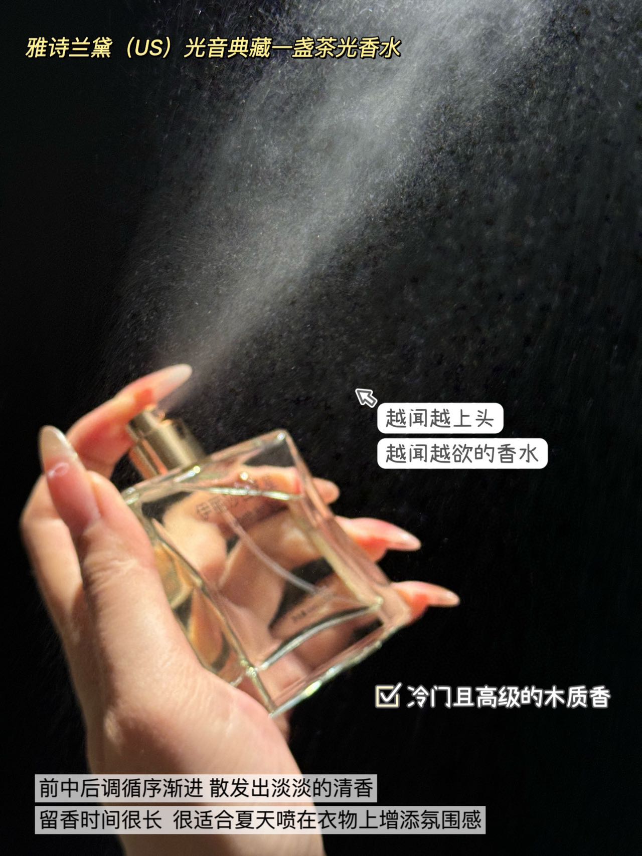 拿在手里超有质感,仪式感拉满✨ 喷头超细腻,轻轻一按就像薄雾裹身,留香也很能打,从早到晚都有若有似无的茶香萦绕,伪体香拿捏~