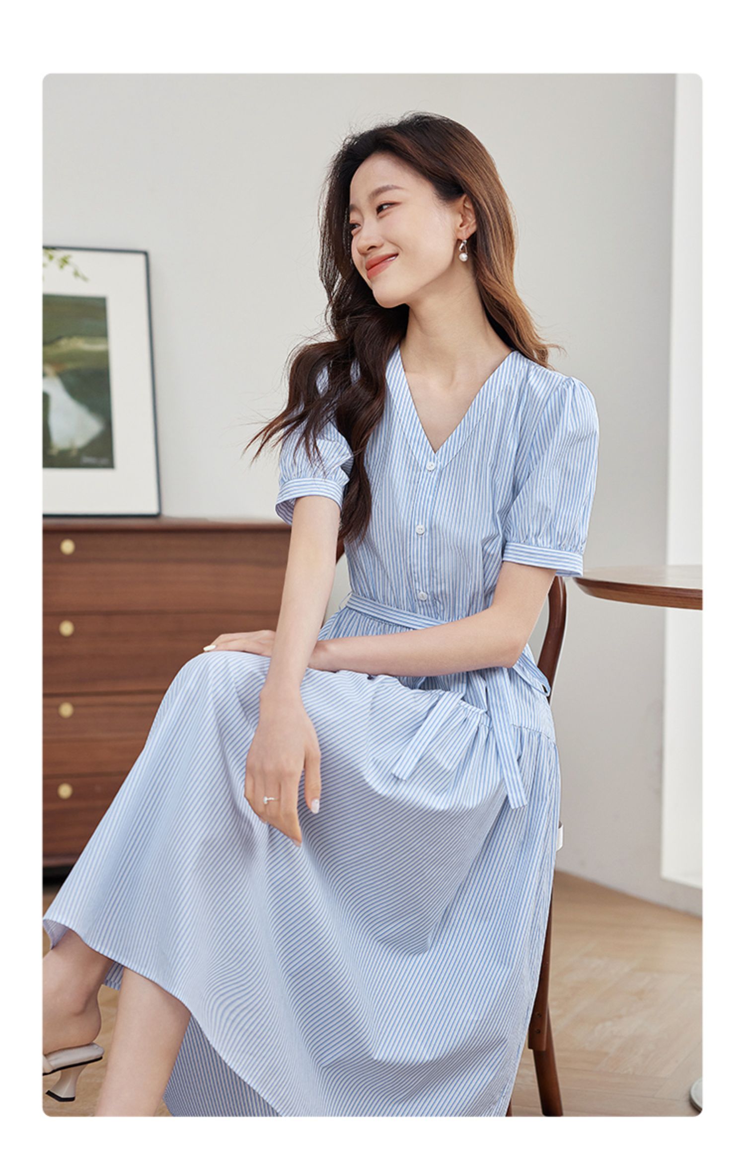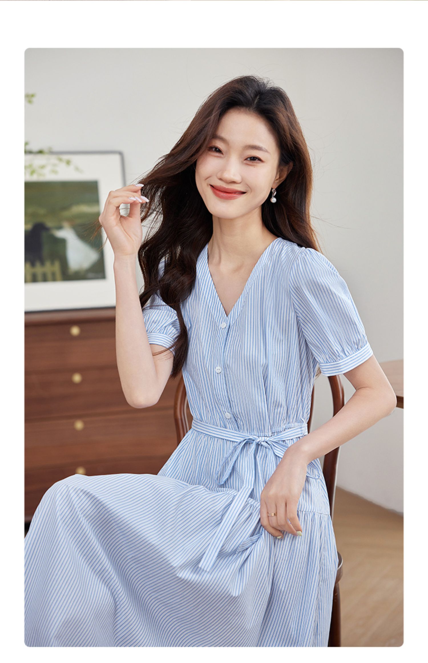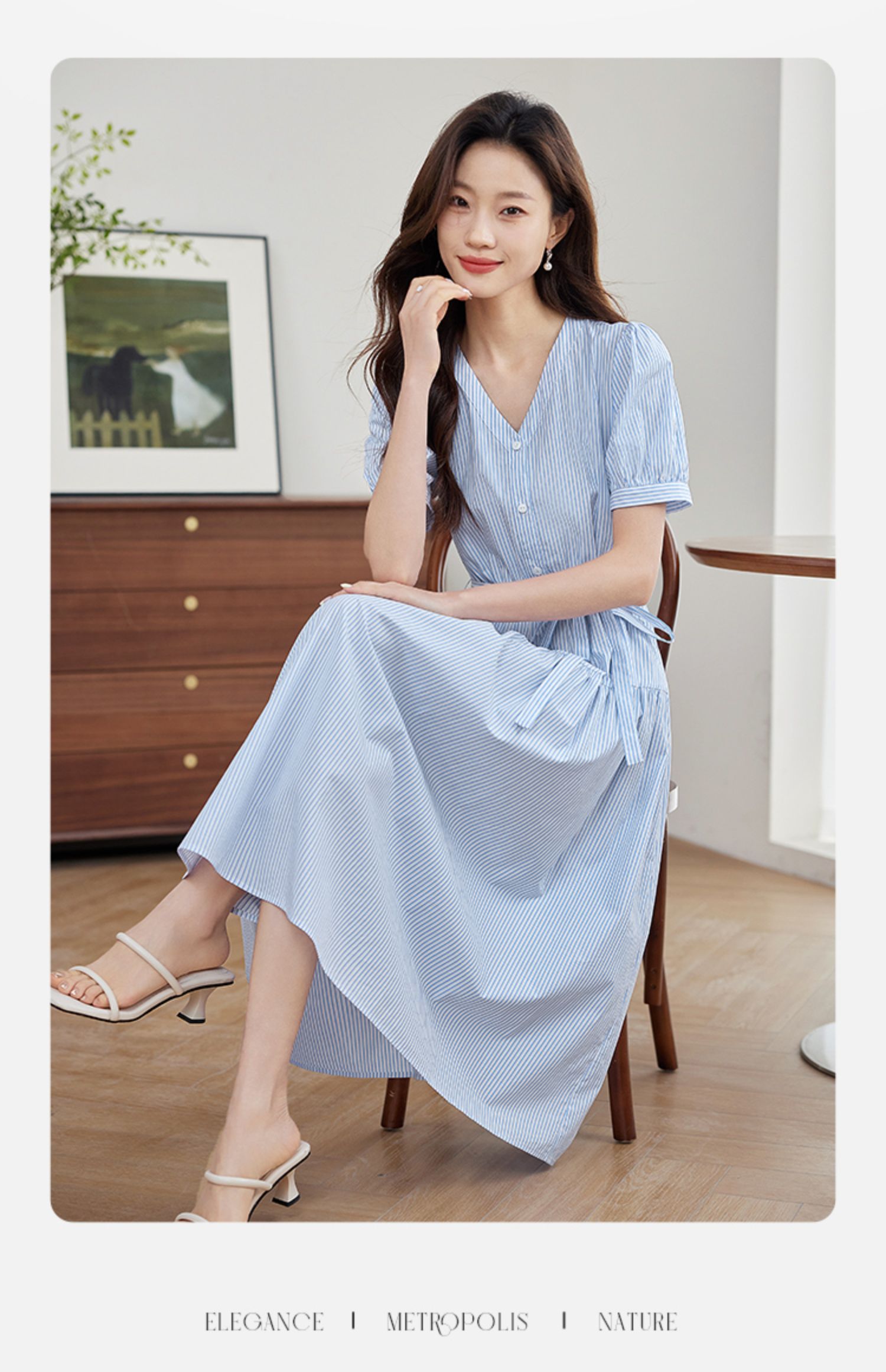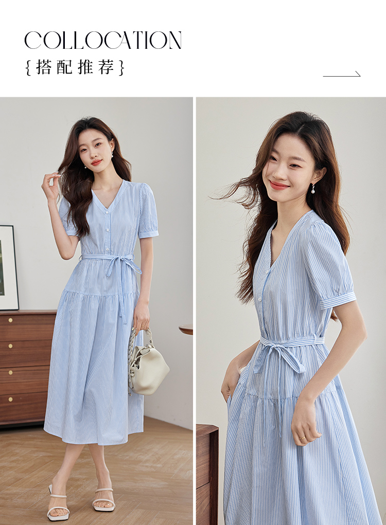 【专属特价】熙世界新疆棉条纹衬衫裙通勤收腰短袖V领连衣裙子2025夏日新款