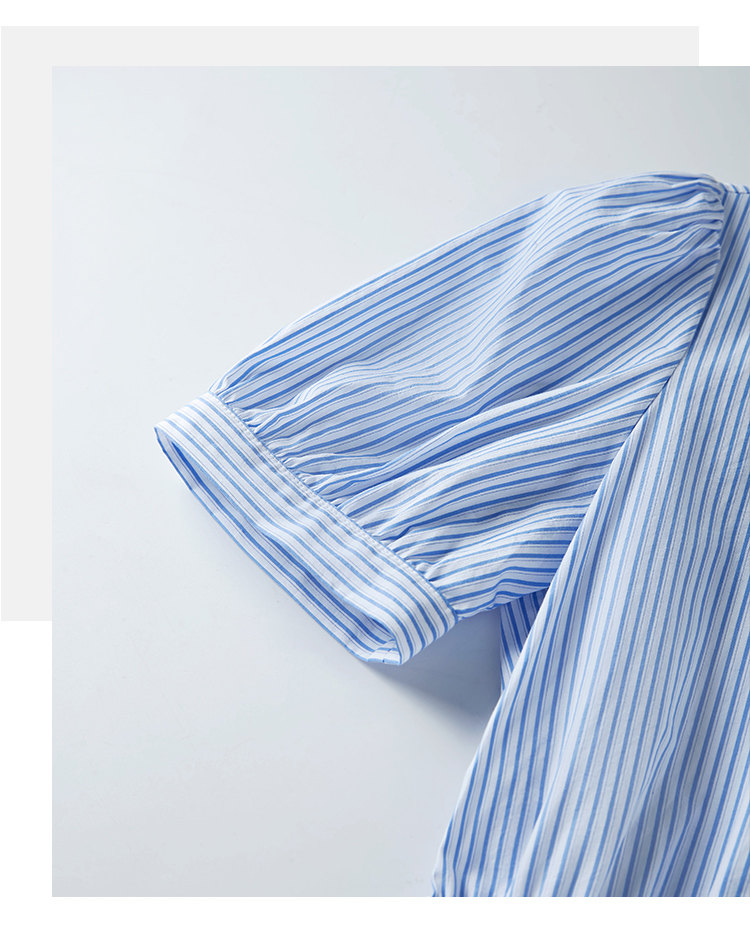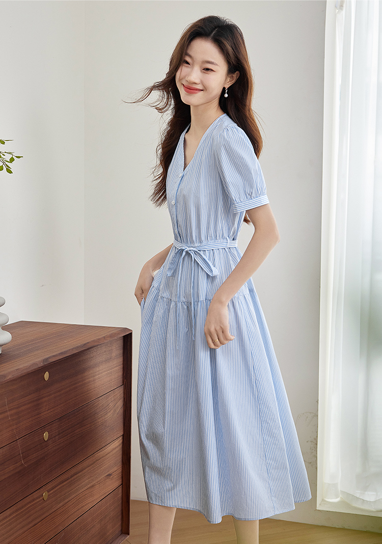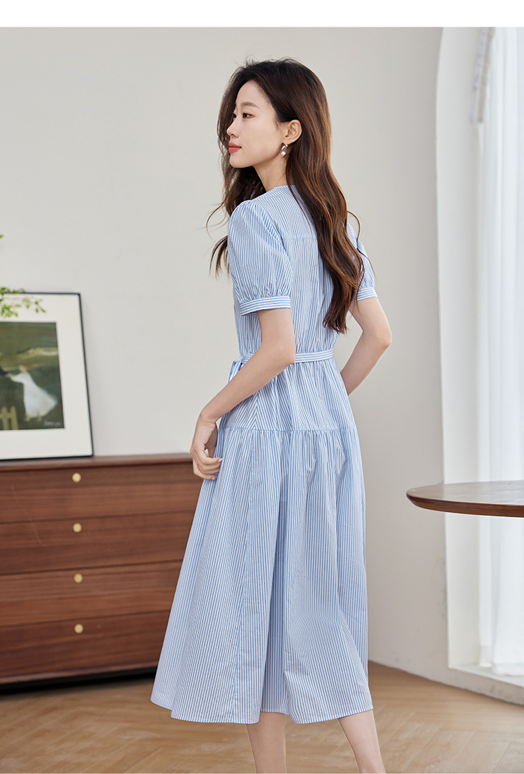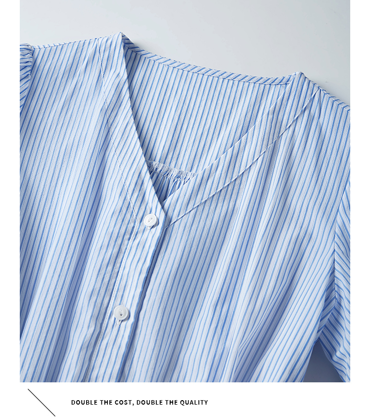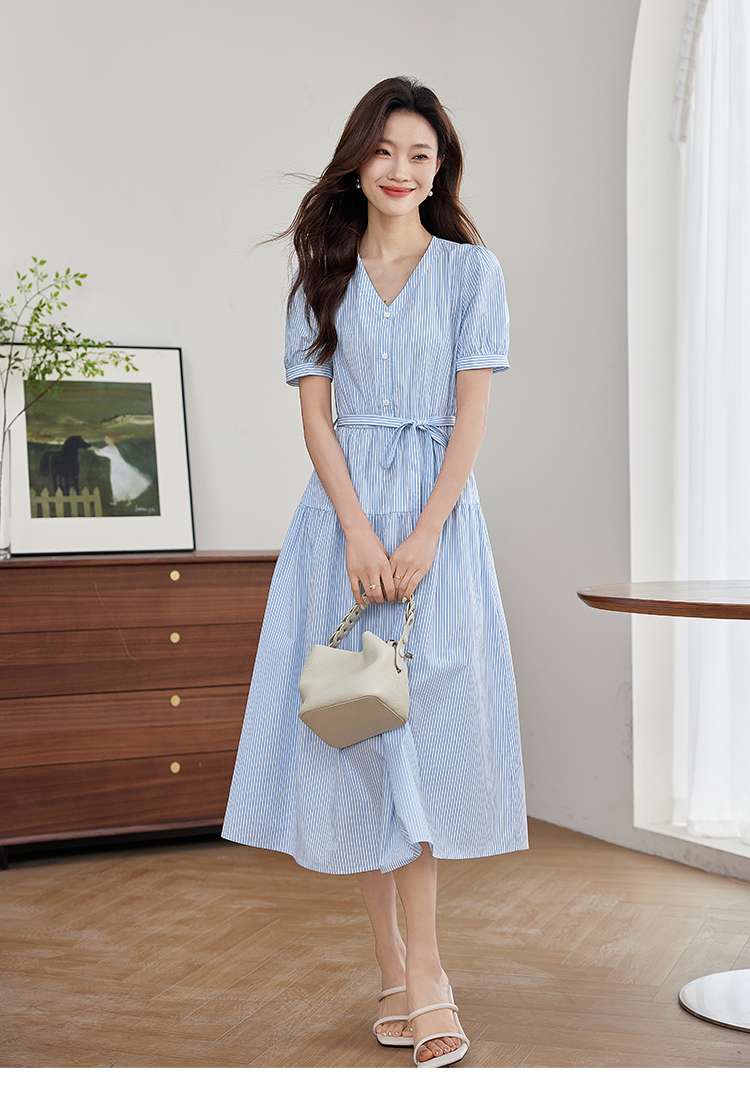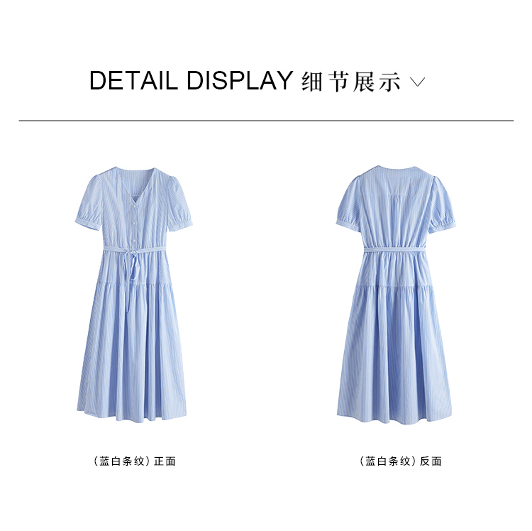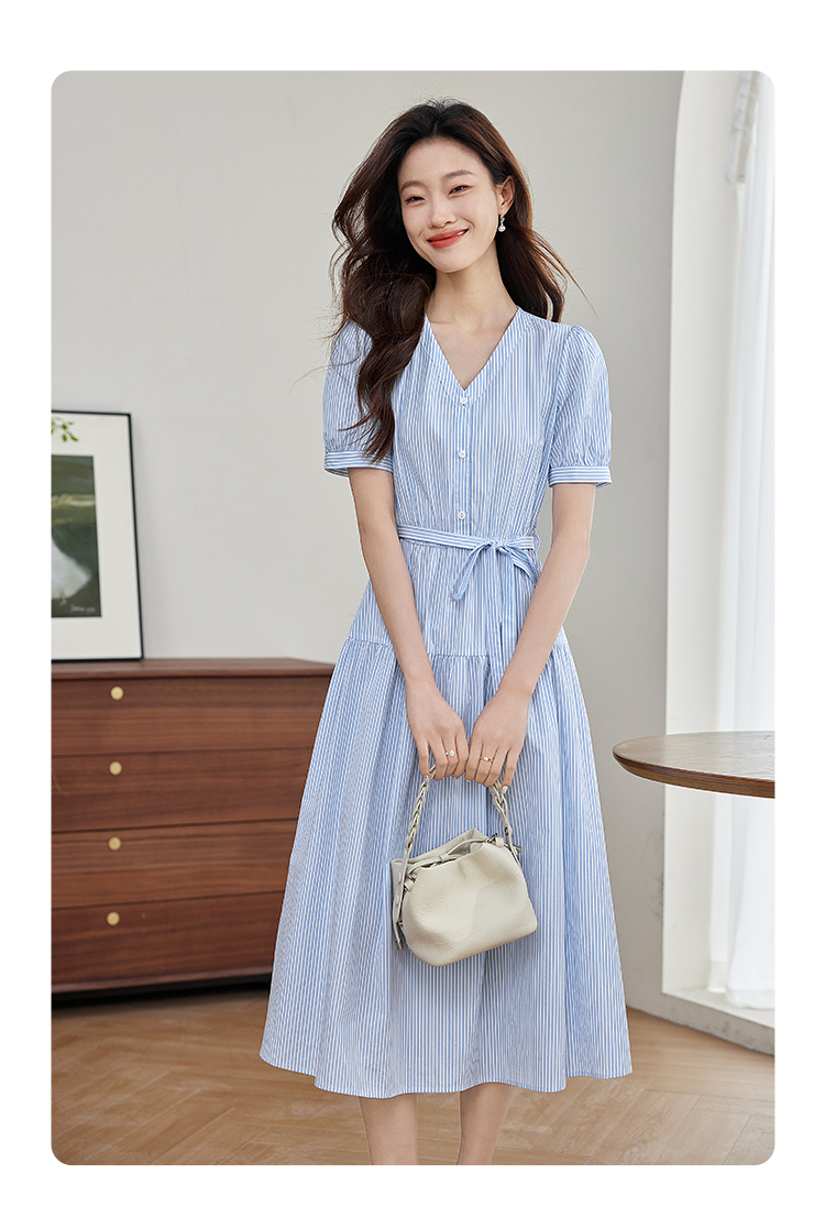 【专属特价】熙世界新疆棉条纹衬衫裙通勤收腰短袖V领连衣裙子2025夏日新款