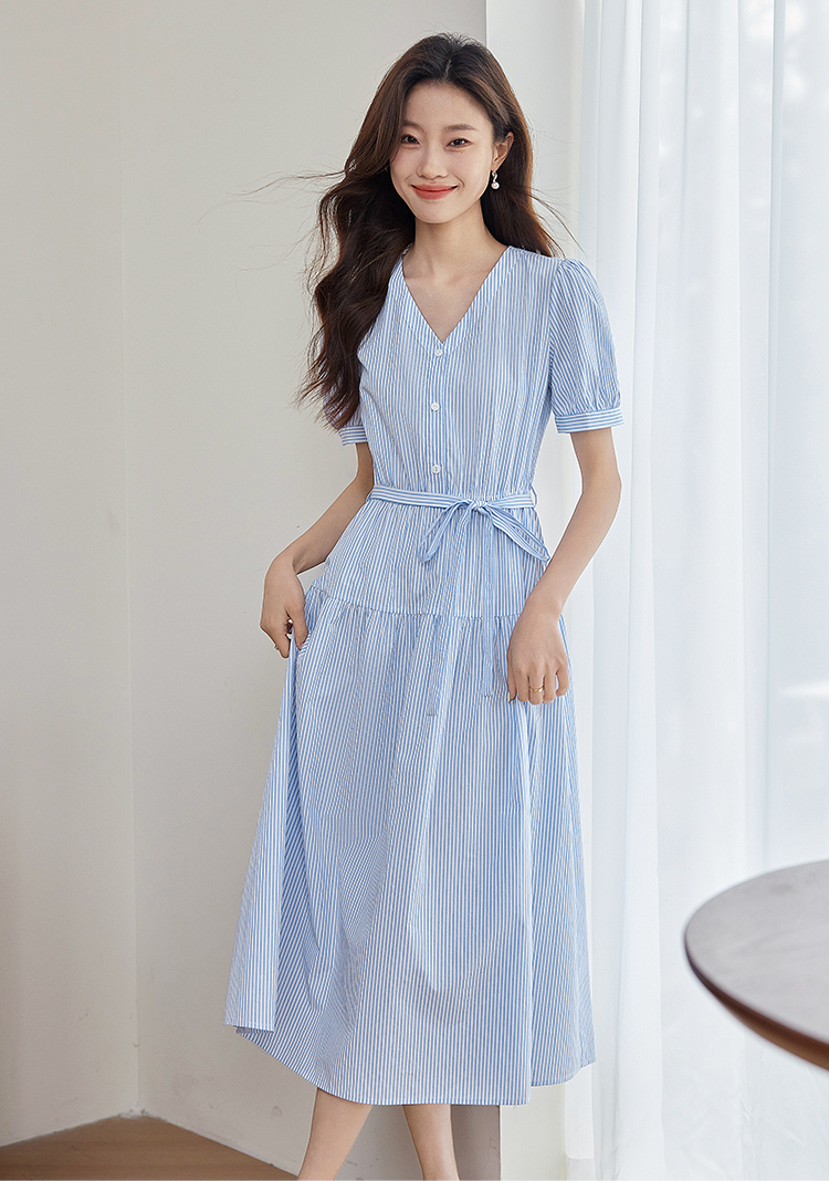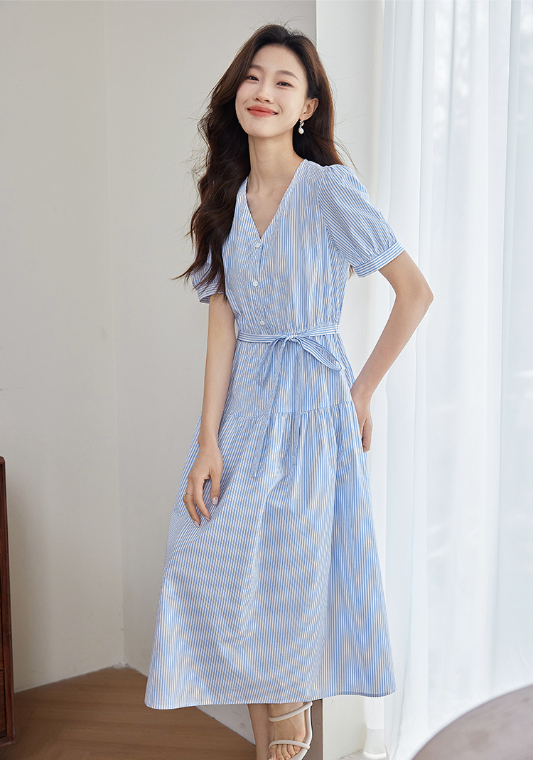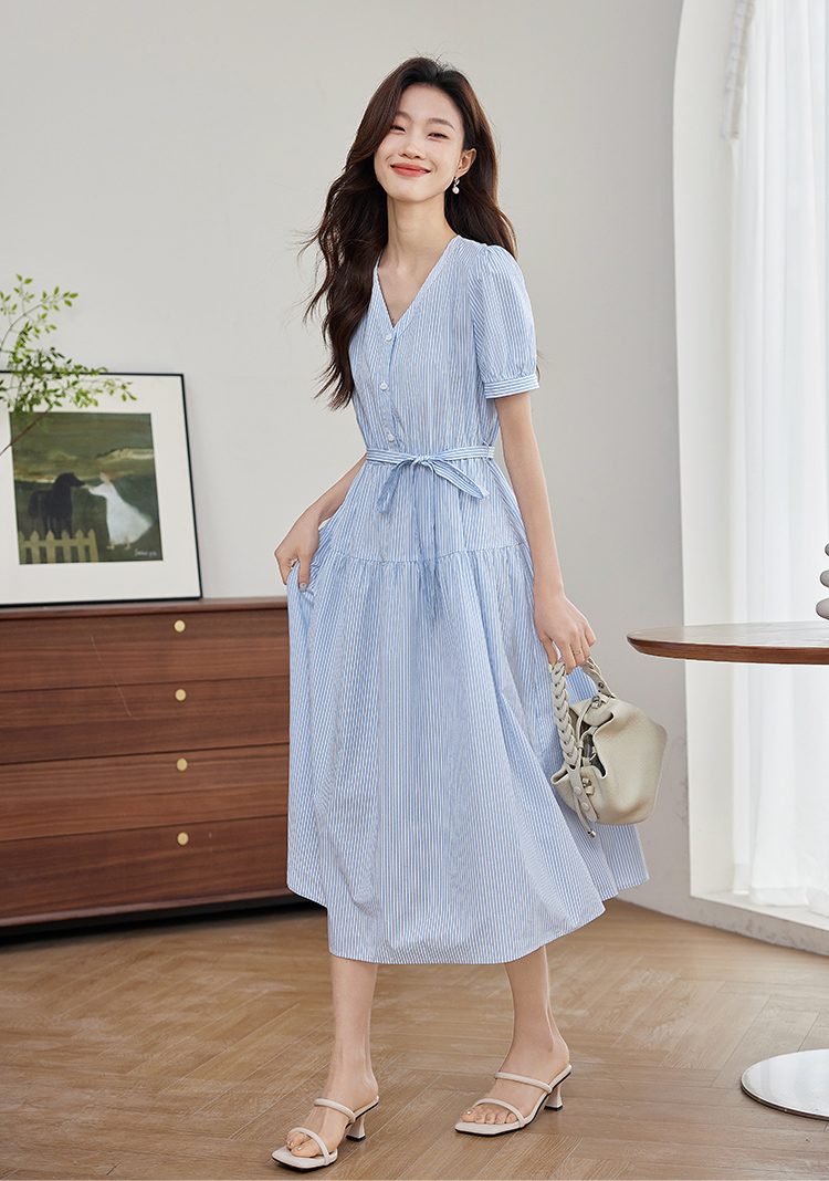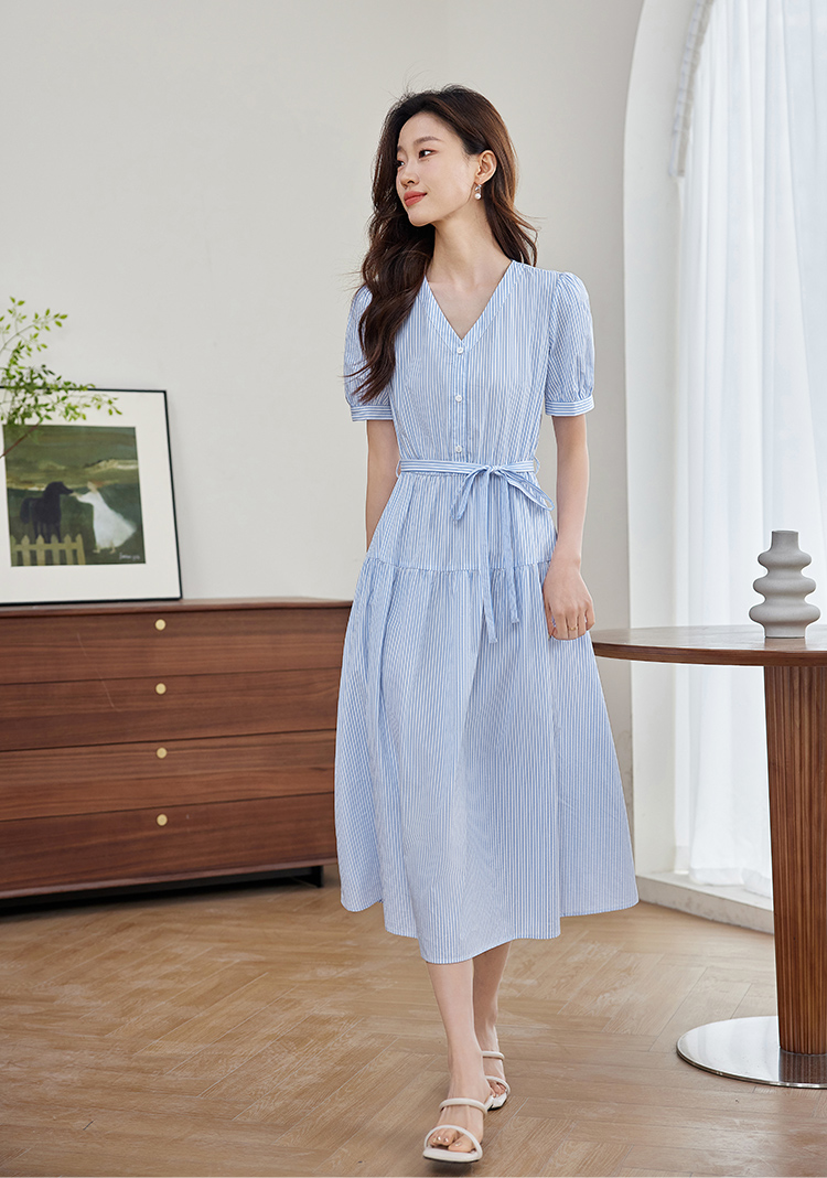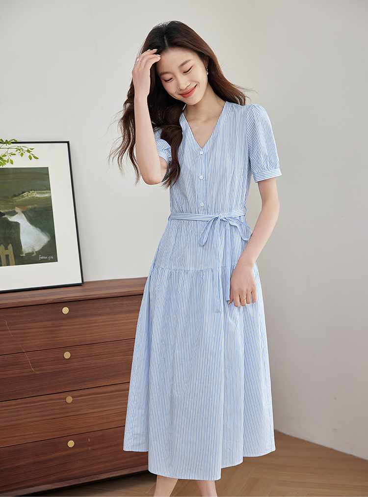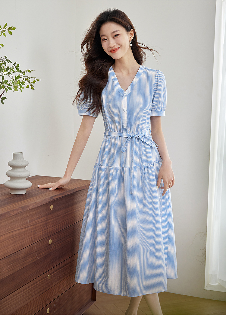 【专属特价】熙世界新疆棉条纹衬衫裙通勤收腰短袖V领连衣裙子2025夏日新款