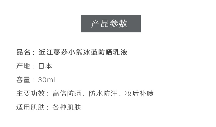 近江蔓莎蓝色小熊清爽防晒乳液军训高倍防水护肤滋润日本进口30ml