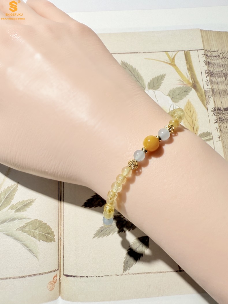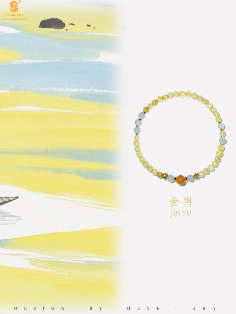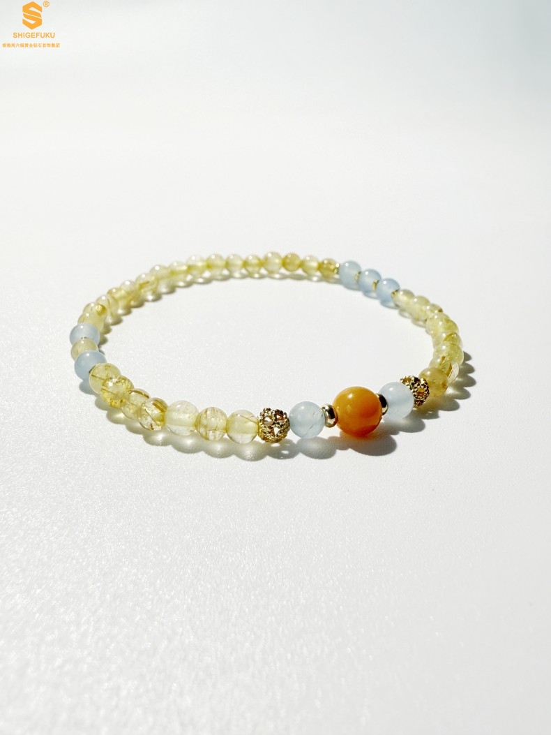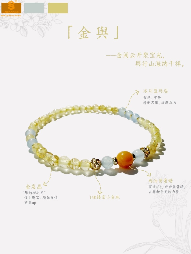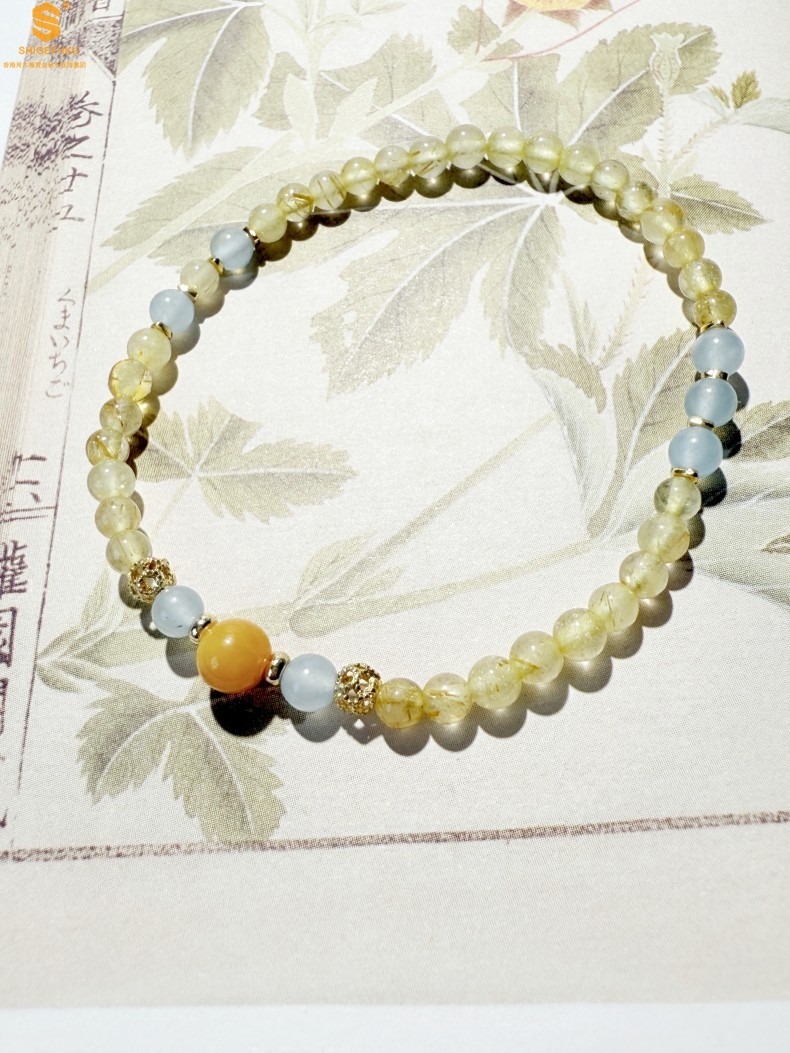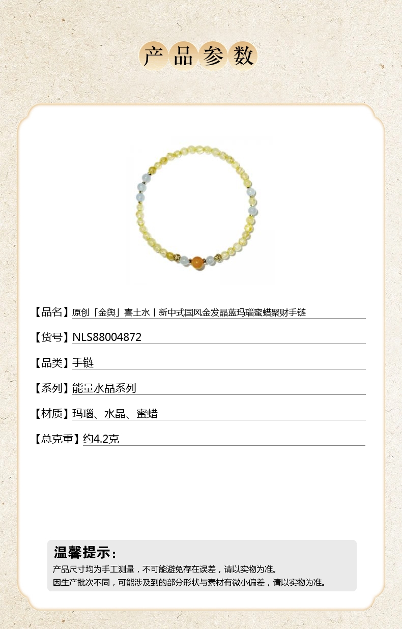 【品名】原创「金舆」喜土水丨新中式国风金发晶蓝玛瑙蜜蜡聚财手链