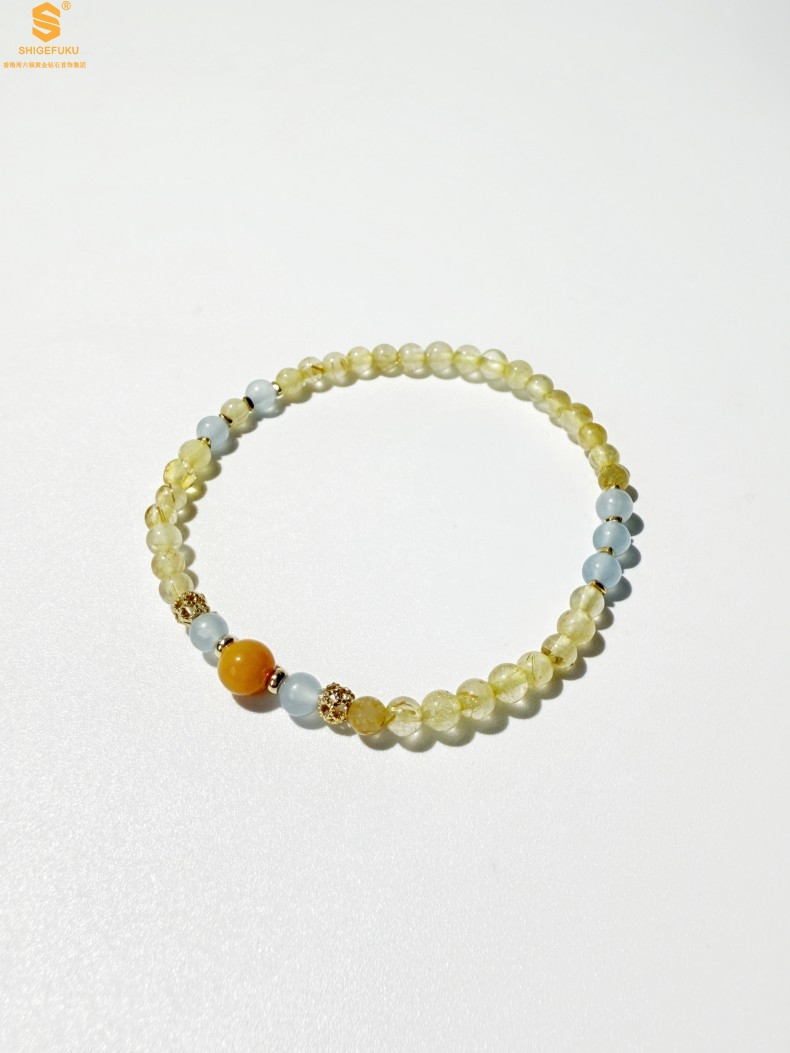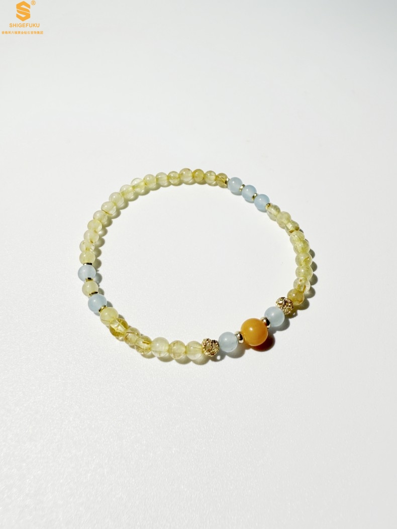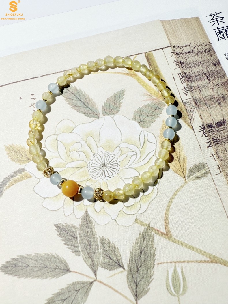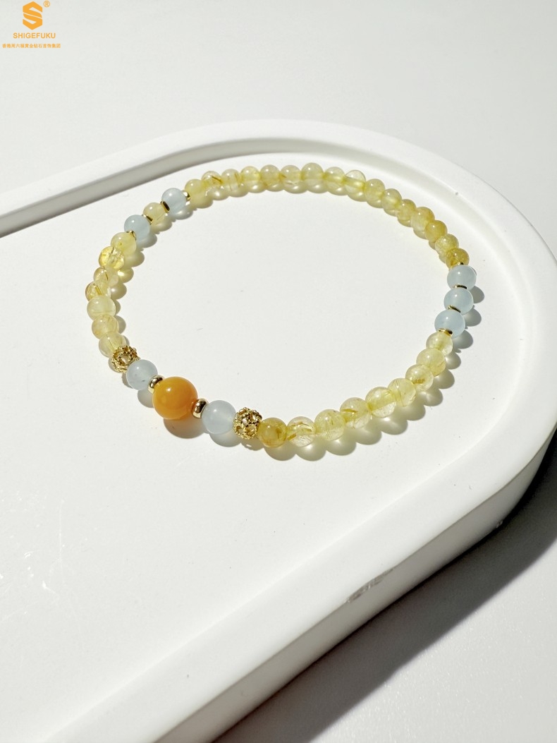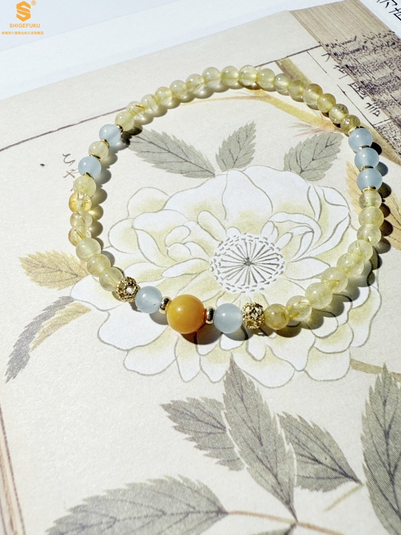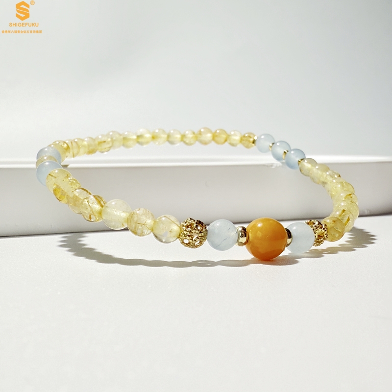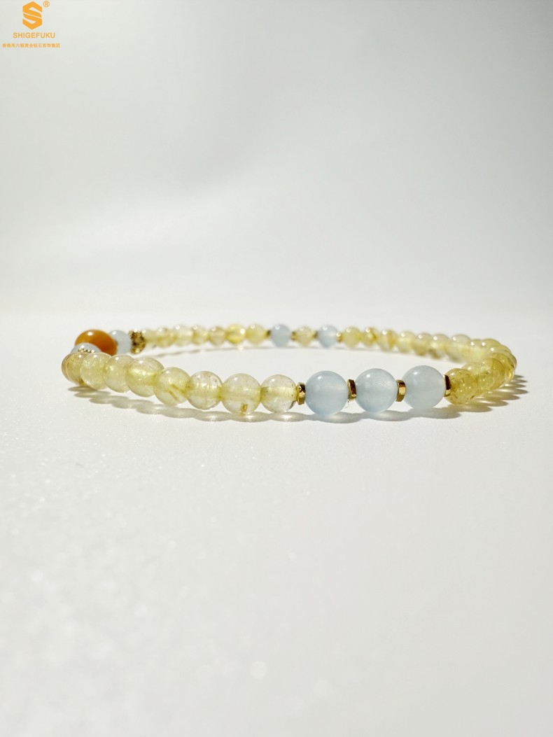 【品名】原创「金舆」喜土水丨新中式国风金发晶蓝玛瑙蜜蜡聚财手链