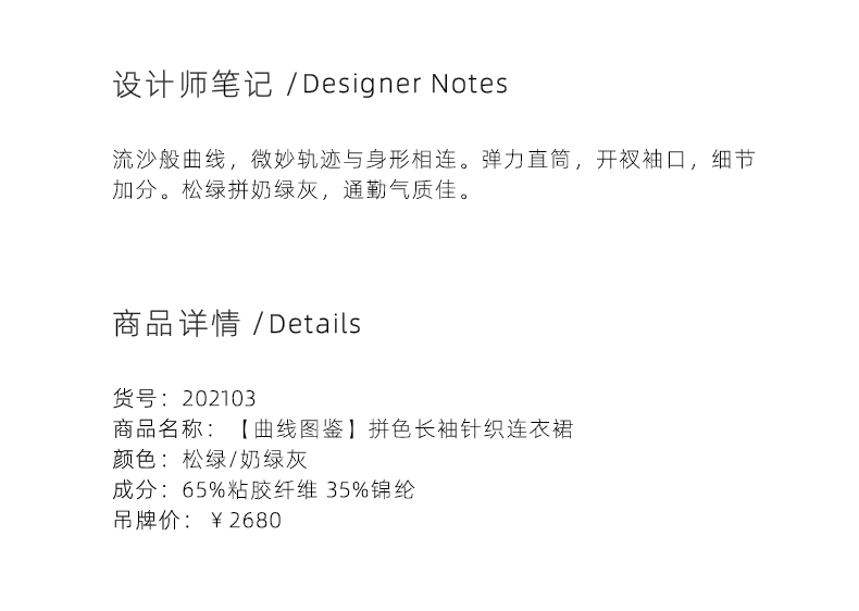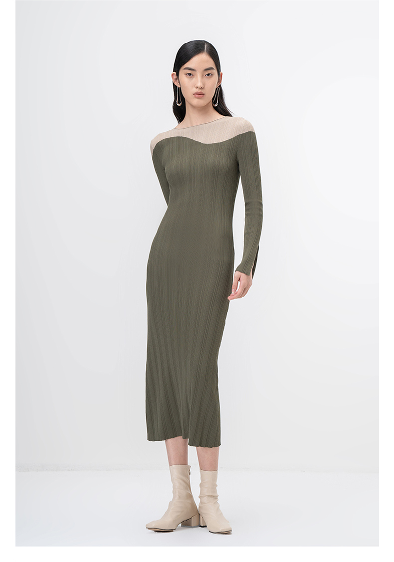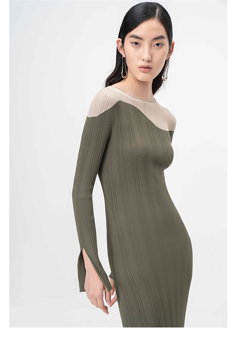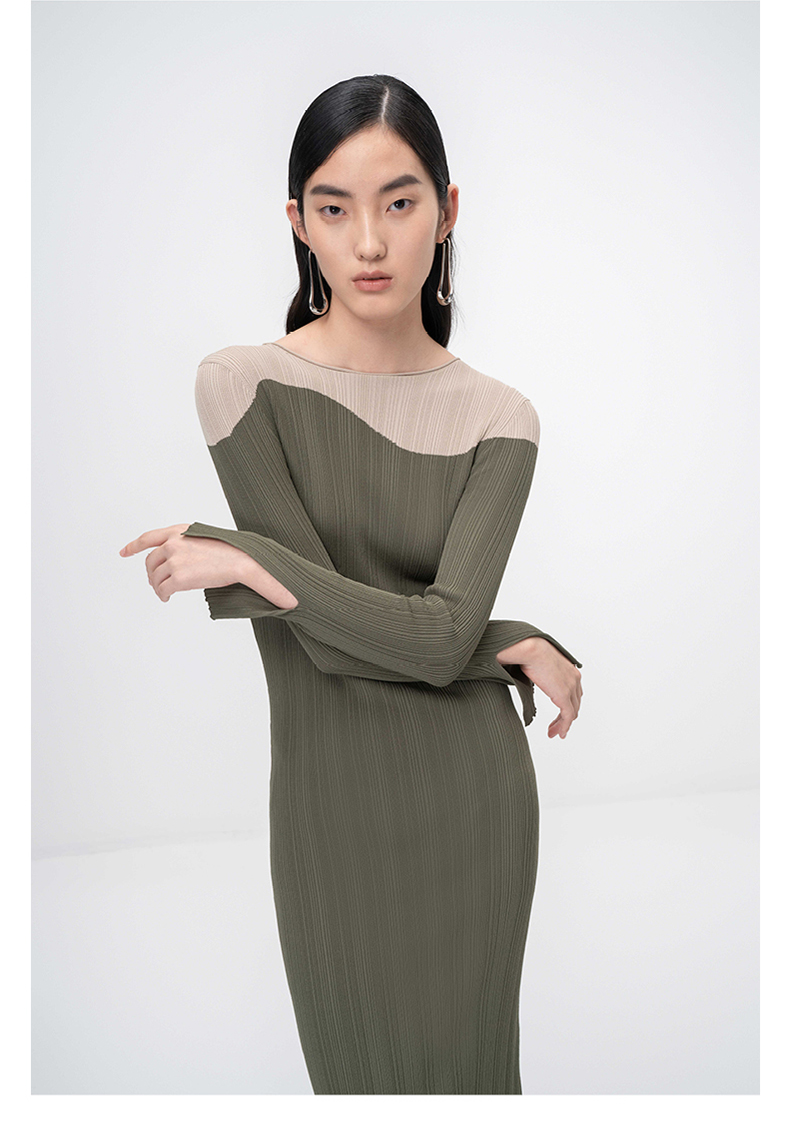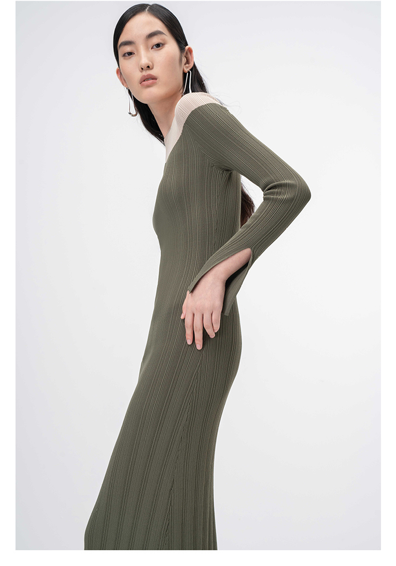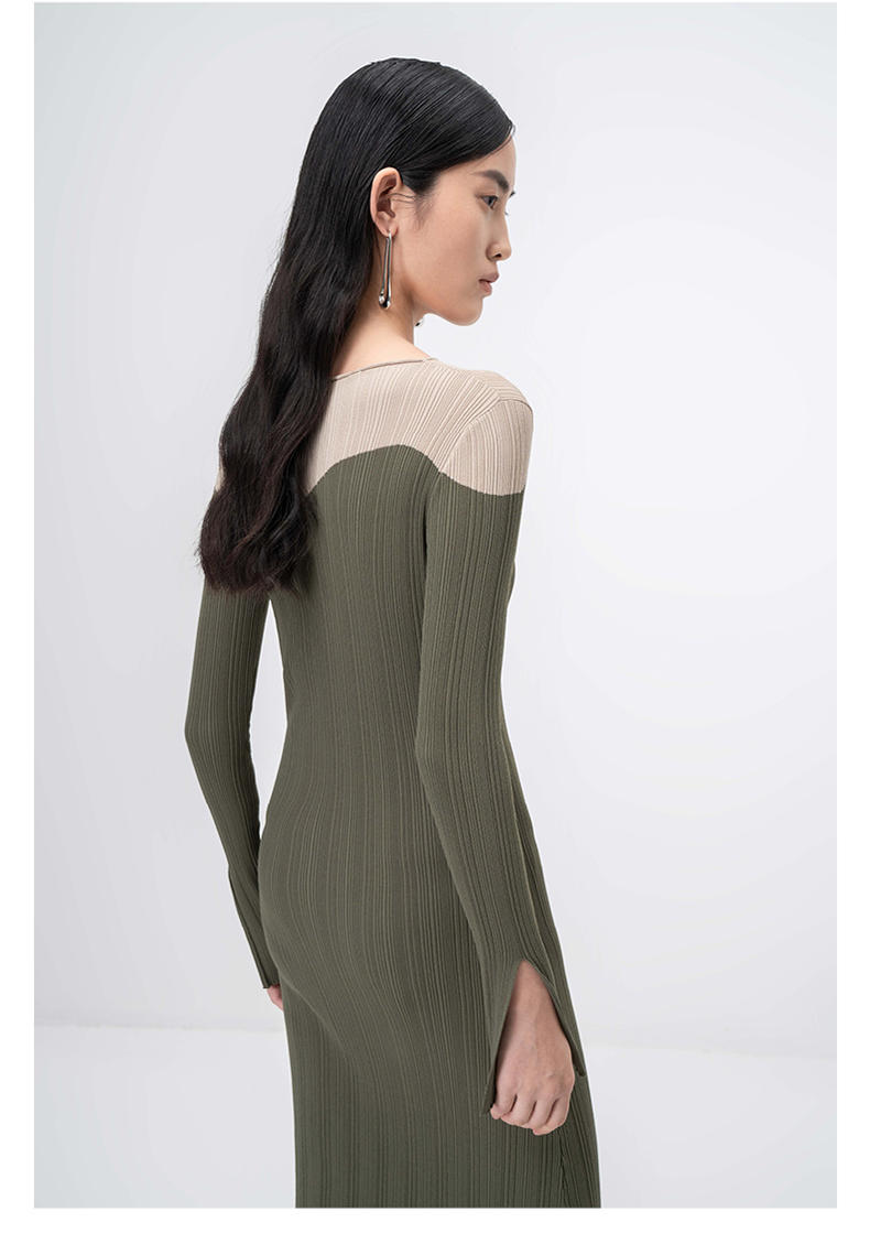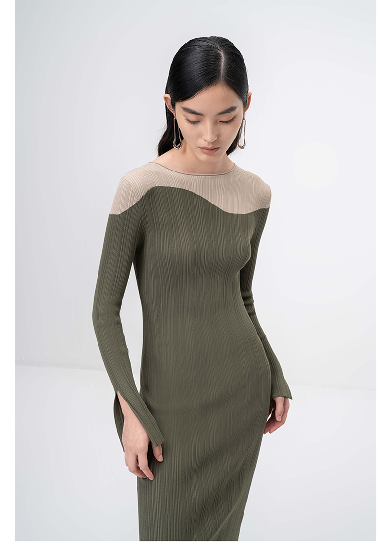 【曲线图鉴】流畅曲线松绿拼色长袖针织连衣裙/202103