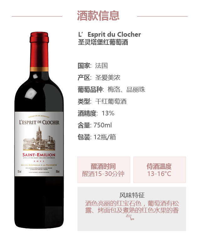 【双支特惠装】圣灵塔堡圣爱美浓红葡萄酒 L'Esprit du Clocher 750ml*2