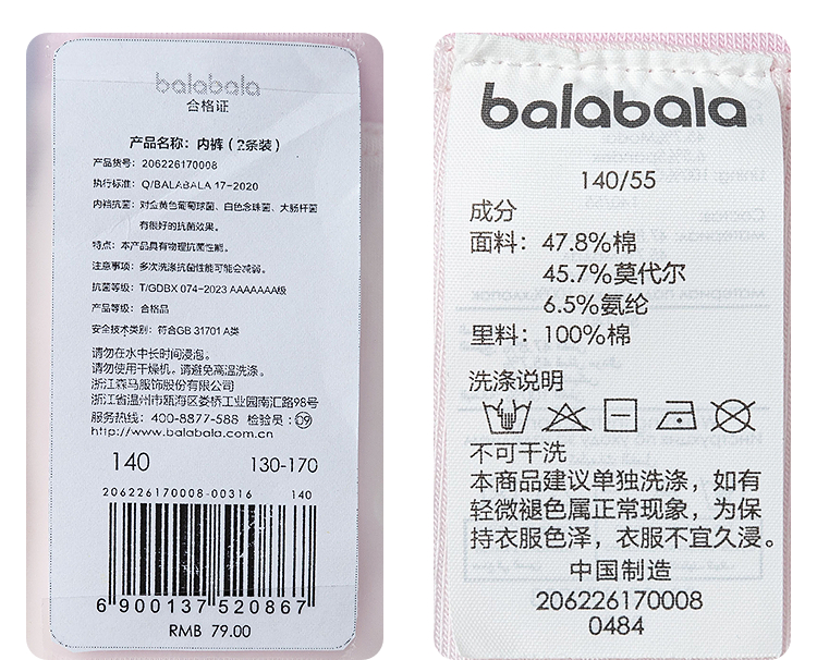 【商场同款】巴拉巴拉女童内裤三角夏新款儿童短裤抗菌舒适两条装