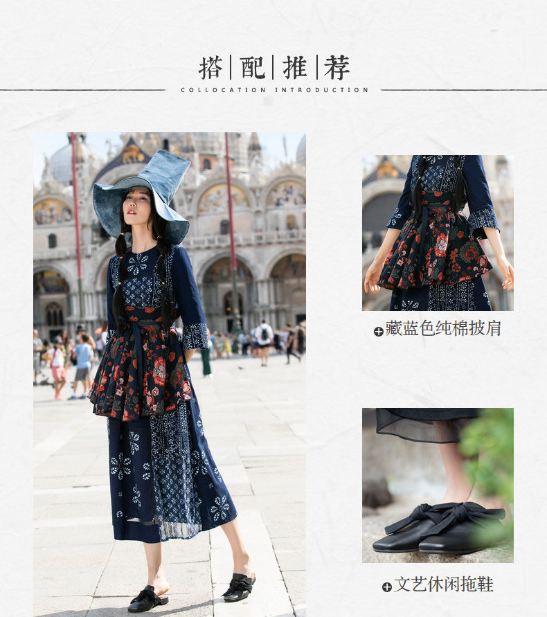 【林栖设计小店】【现货】蓝印花布系列春季女装新品蓝染绣花复古中袖小巧连衣裙1901007