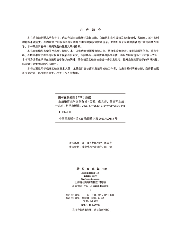 血细胞形态学案例分析 关明主编 本书系血细胞形态学参考书 内容包括血细胞概述及红细胞 白细胞和血小板相关案例86例 科学出版社