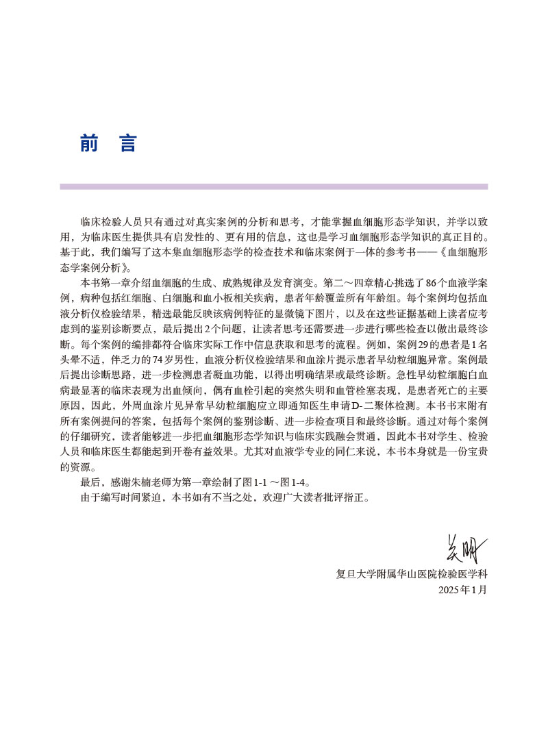 本书血细胞形态学图片典型、清晰。本书以疾病案例图片为切入点,结合实验室检查、鉴别诊断等信息,重点突出,外周血细胞形态学特征检查于疾病诊治而言,不但具备一定的指导与参考价值,而且在特定情形下还有确认之用。本书可为读者在学习血细胞形态学知识的同时,结合相关实验室检查进一步引发思考,提升血细胞形态学的学习兴趣、临床综合思维和诊断分析能力。