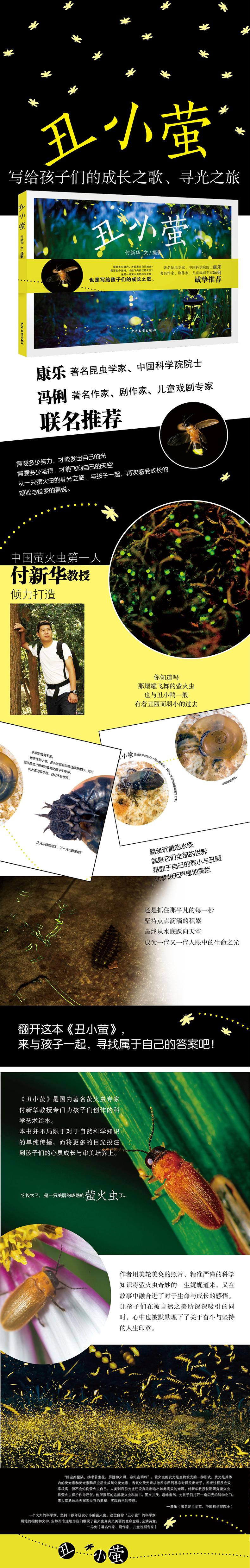 《丑小萤》是专门为5-10岁小读者创作的萤火虫摄影科学绘本。本书通过童话故事结合实景拍摄的手法,讲述了一只萤火虫在严苛的自然环境下努力成长的故事。本书力求将科学与艺术充分融合,在严谨的科学基础上构建萤火虫所特有的光辉美学形象,在传达自然科学知识的同时也在读者心中种下艺术之美的种子,埋下关于奋斗与坚持的人生印章。