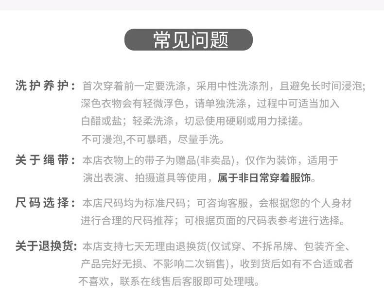 2) 非质量问题售后运费自理,拒收到付件(商品不影响二次销售,包装袋、吊牌需要退回,袋子整洁,表面不能写字和粘胶纸)