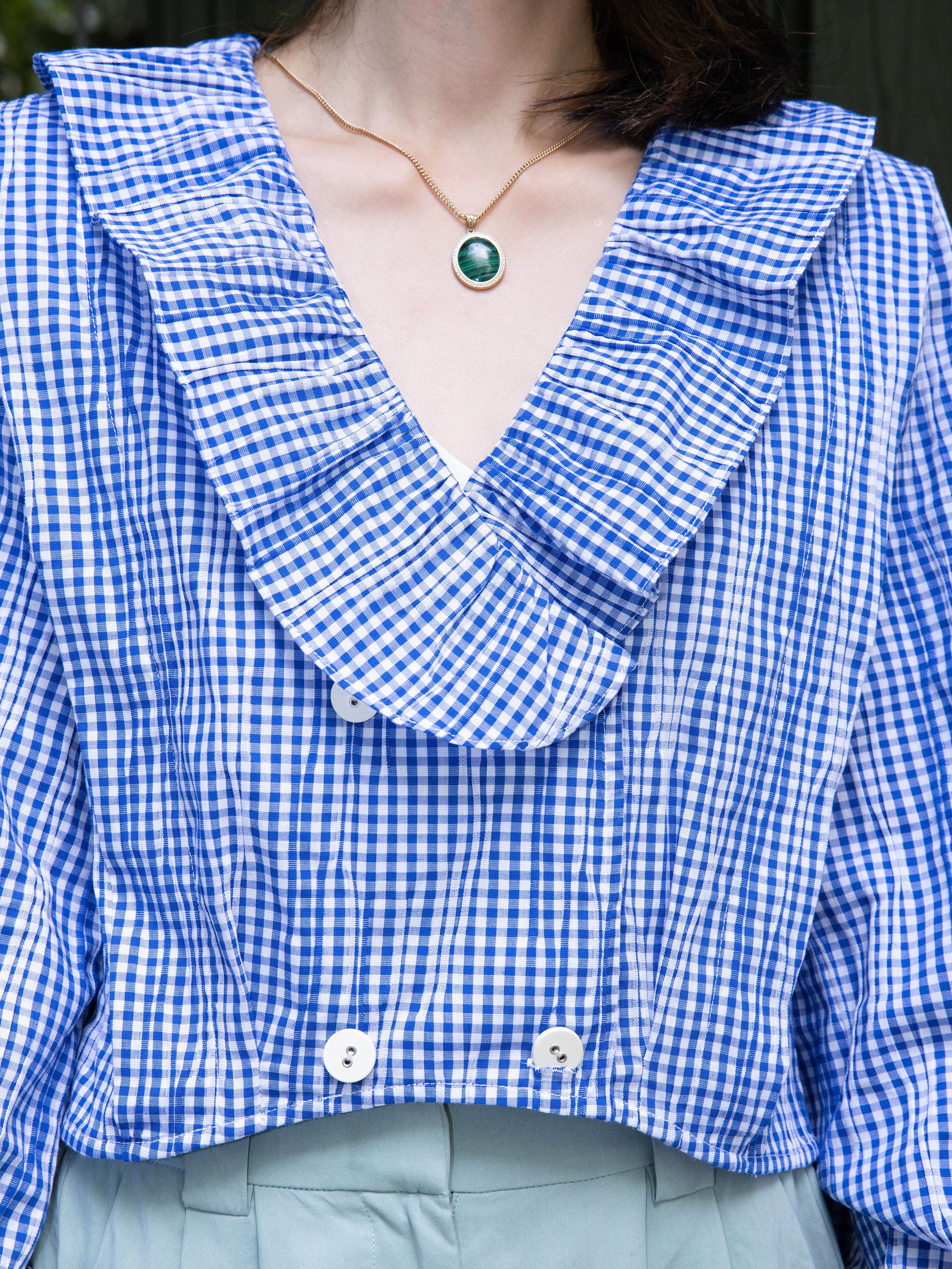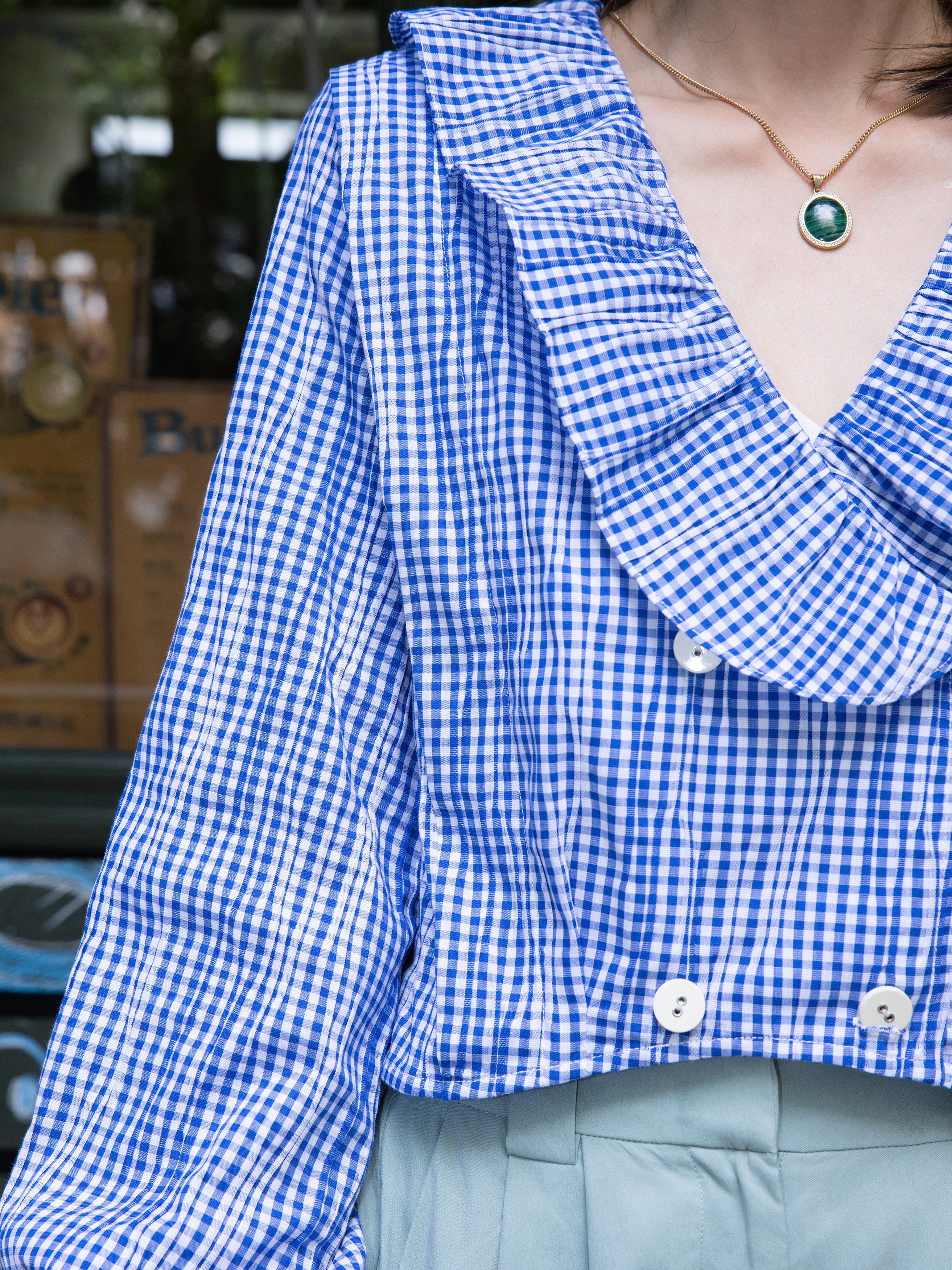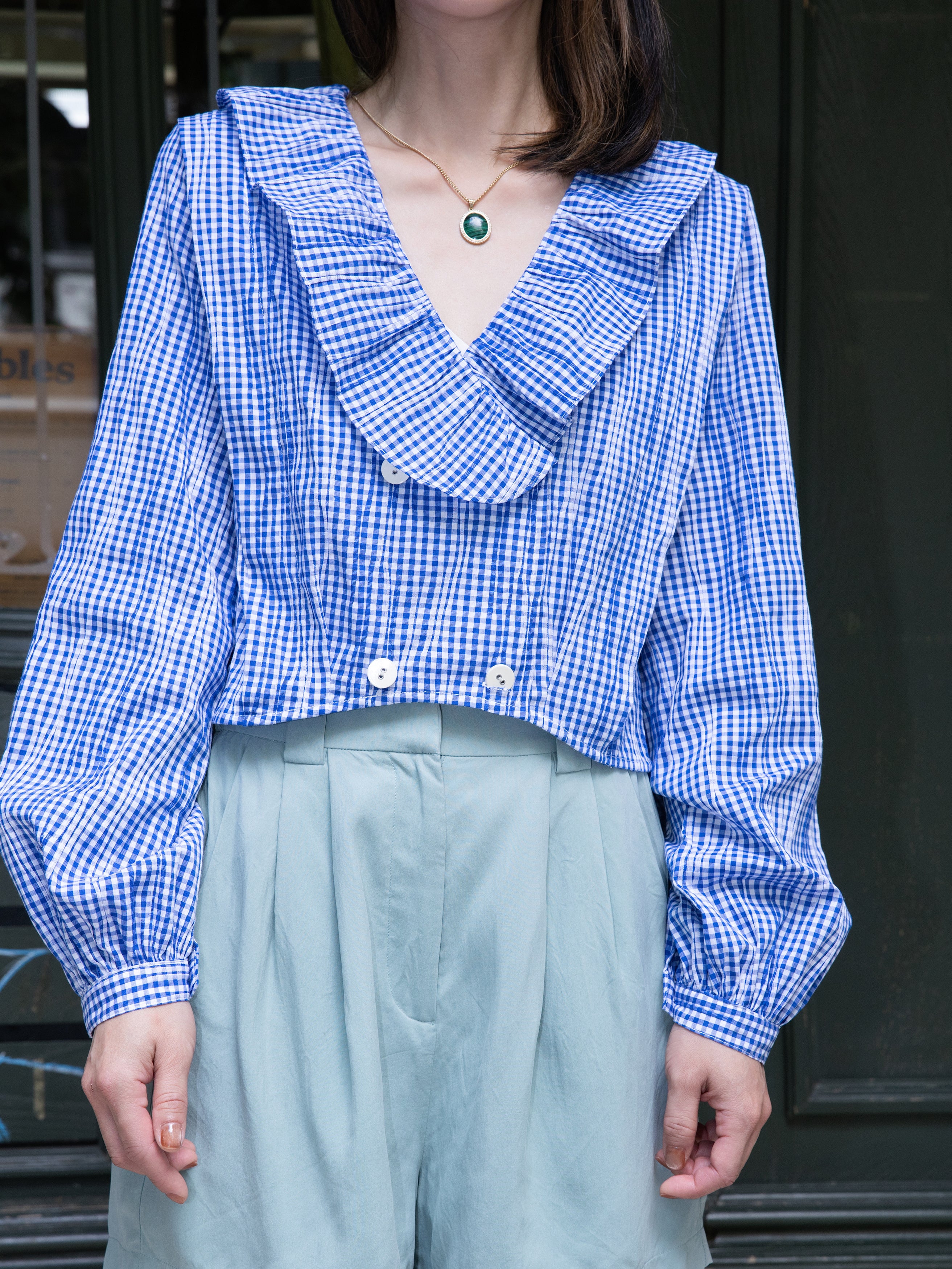 TYNVIE 荷叶边领子气球袖裹身短款衬衫-蓝色格纹