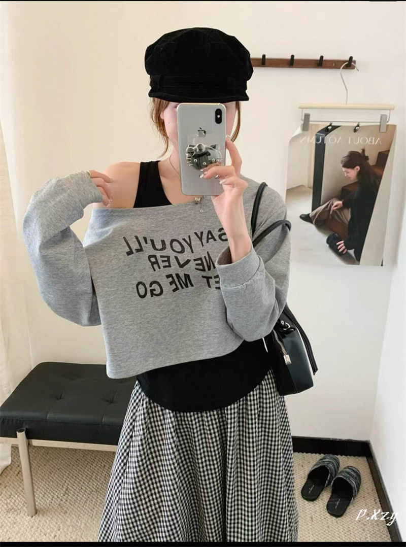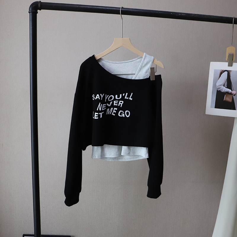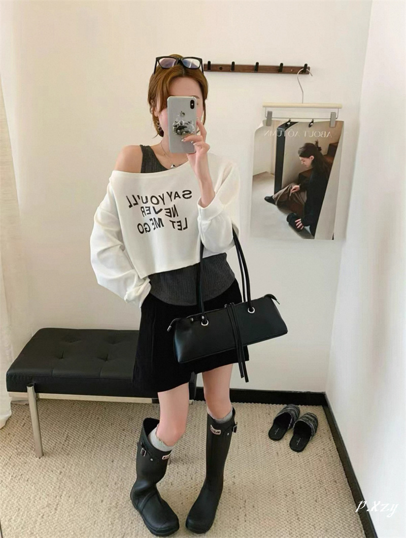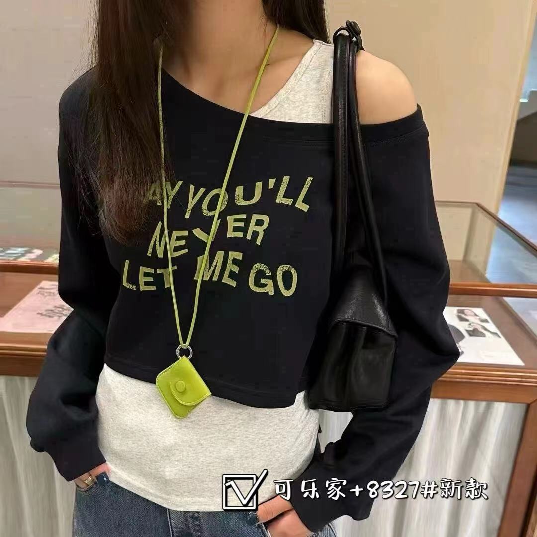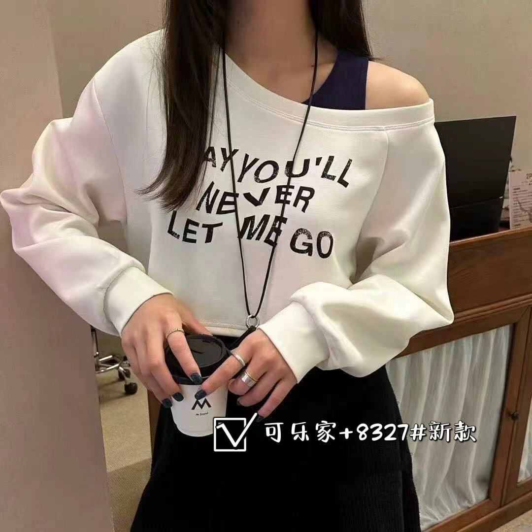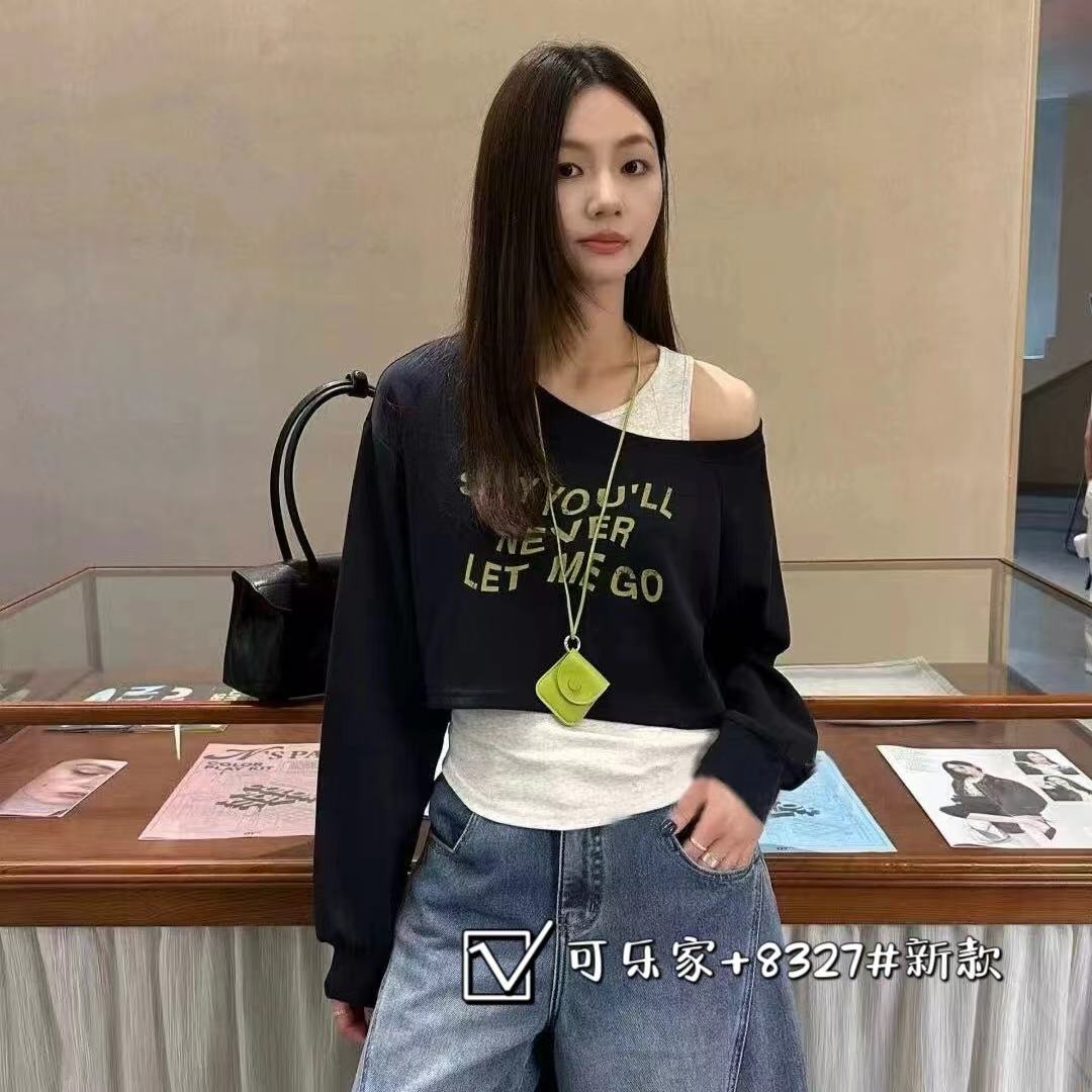 【GZ】无忧购 秋季慵懒风一字领字母T恤女背心长袖打底衫女士二件套T恤8327(截单后3-5天发货)