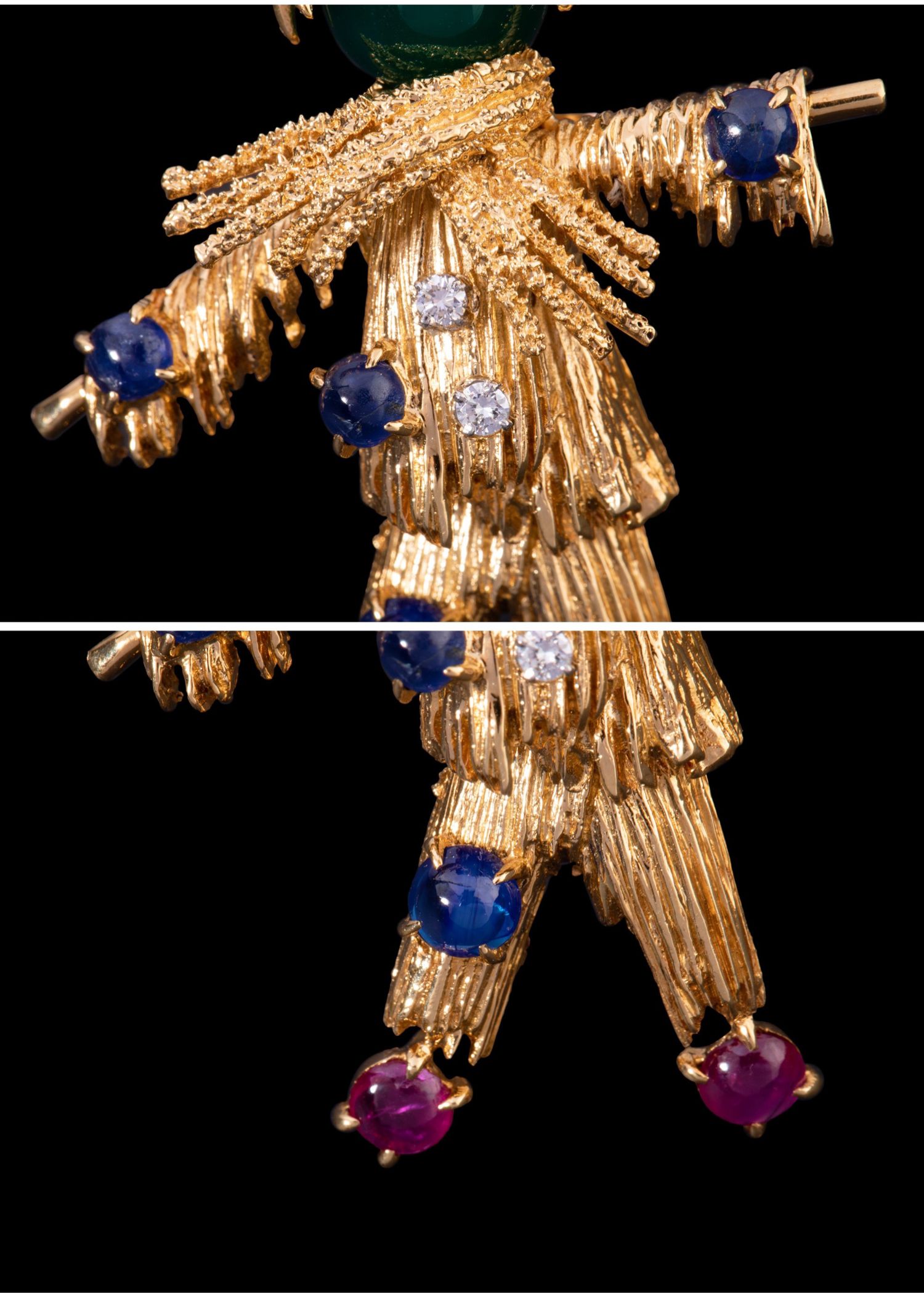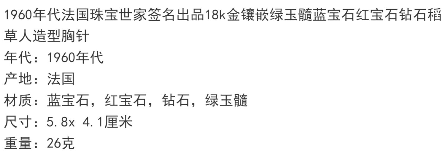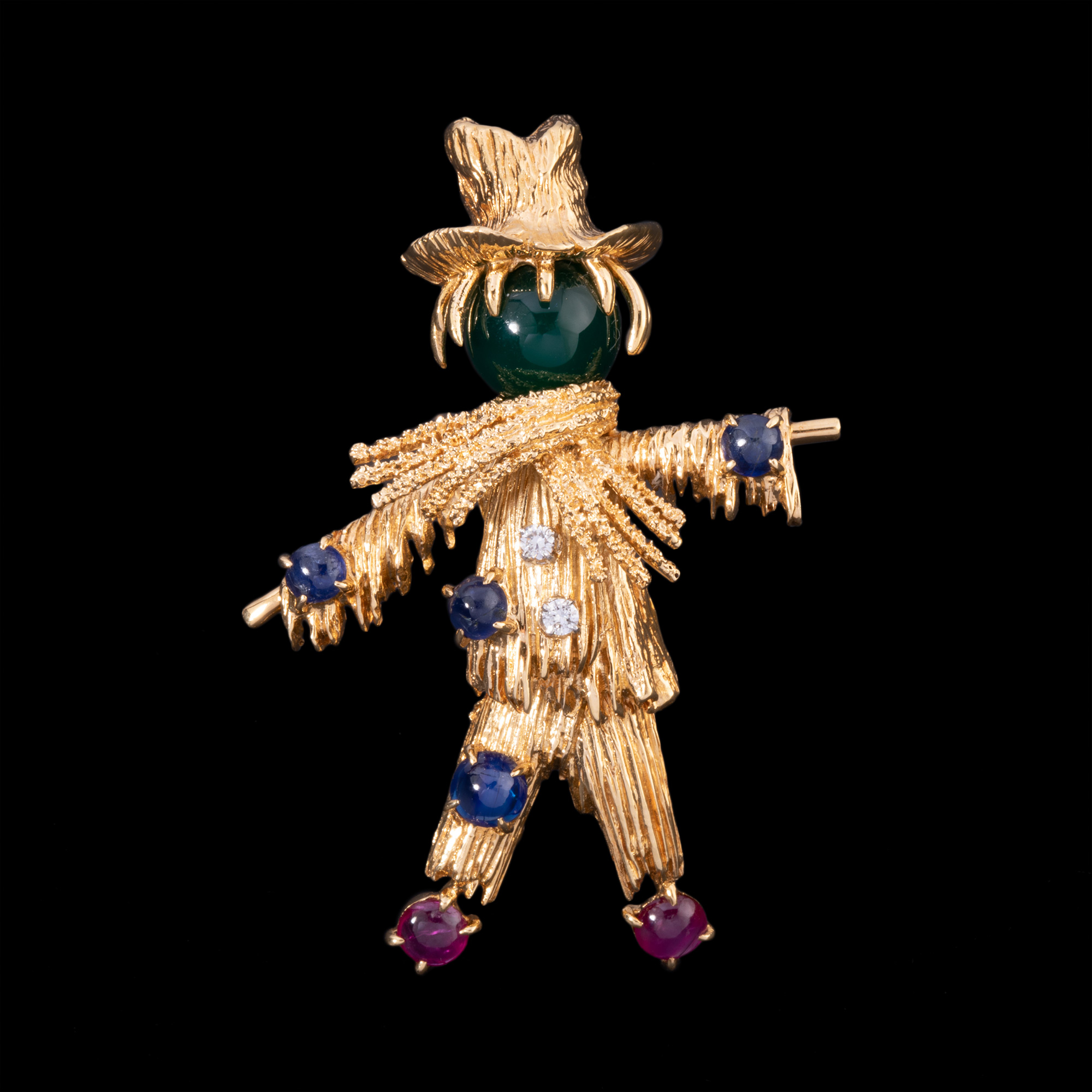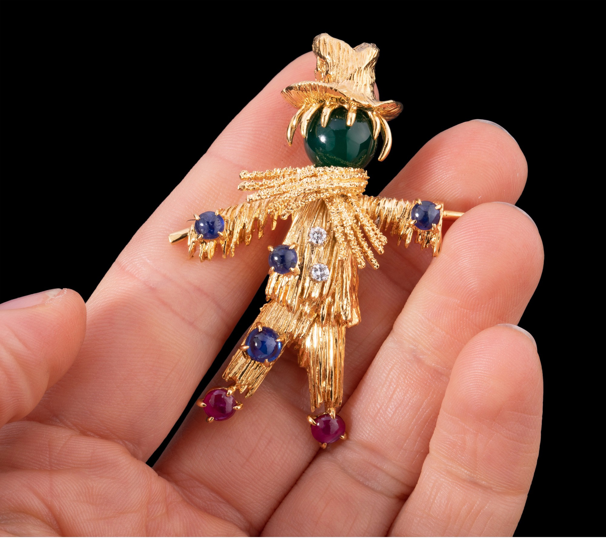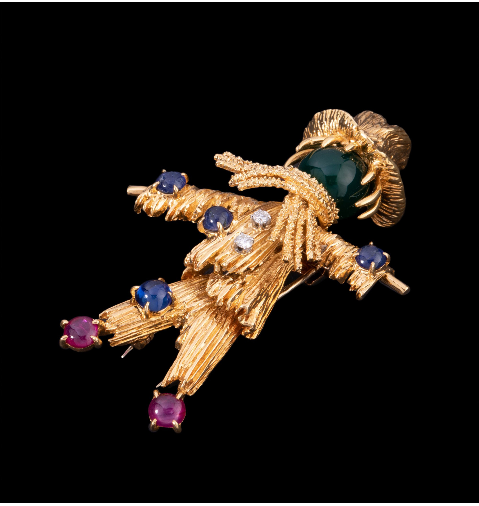 独角鹿西洋古董法国18K金镶嵌绿玉髓蓝宝石红宝石钻石稻草人胸针