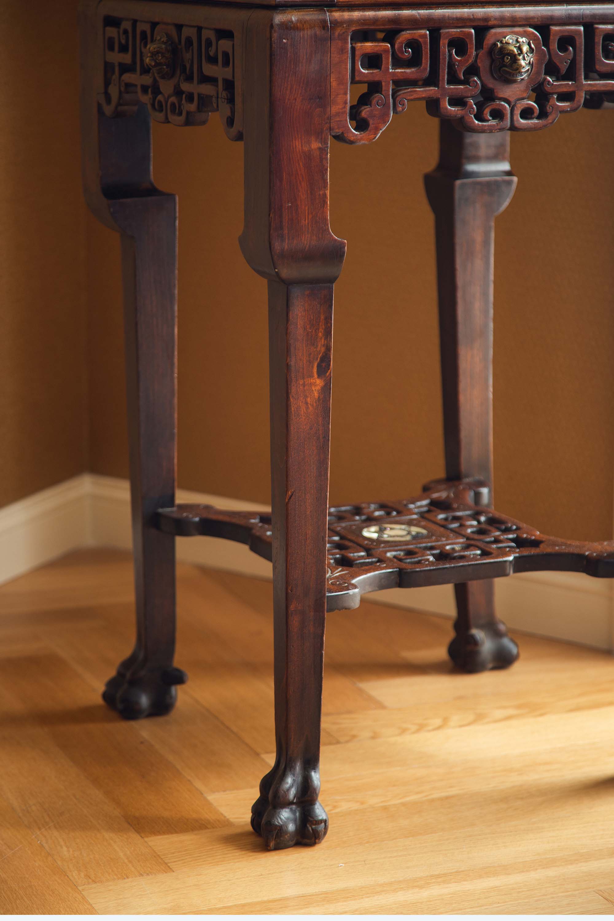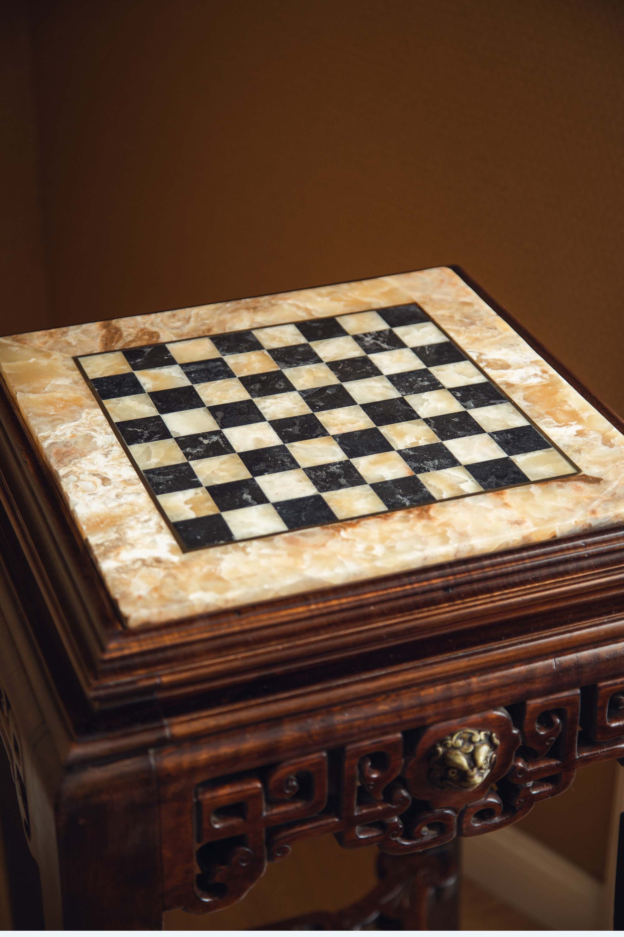 19世纪法国出品VIARDOT东方风格瑞兽造型铜鎏金精雕装饰吉祥回纹硬木镂雕嵌棋盘格大理石台面花几