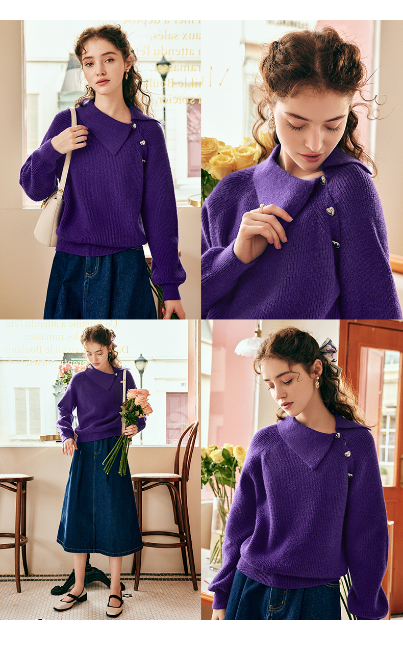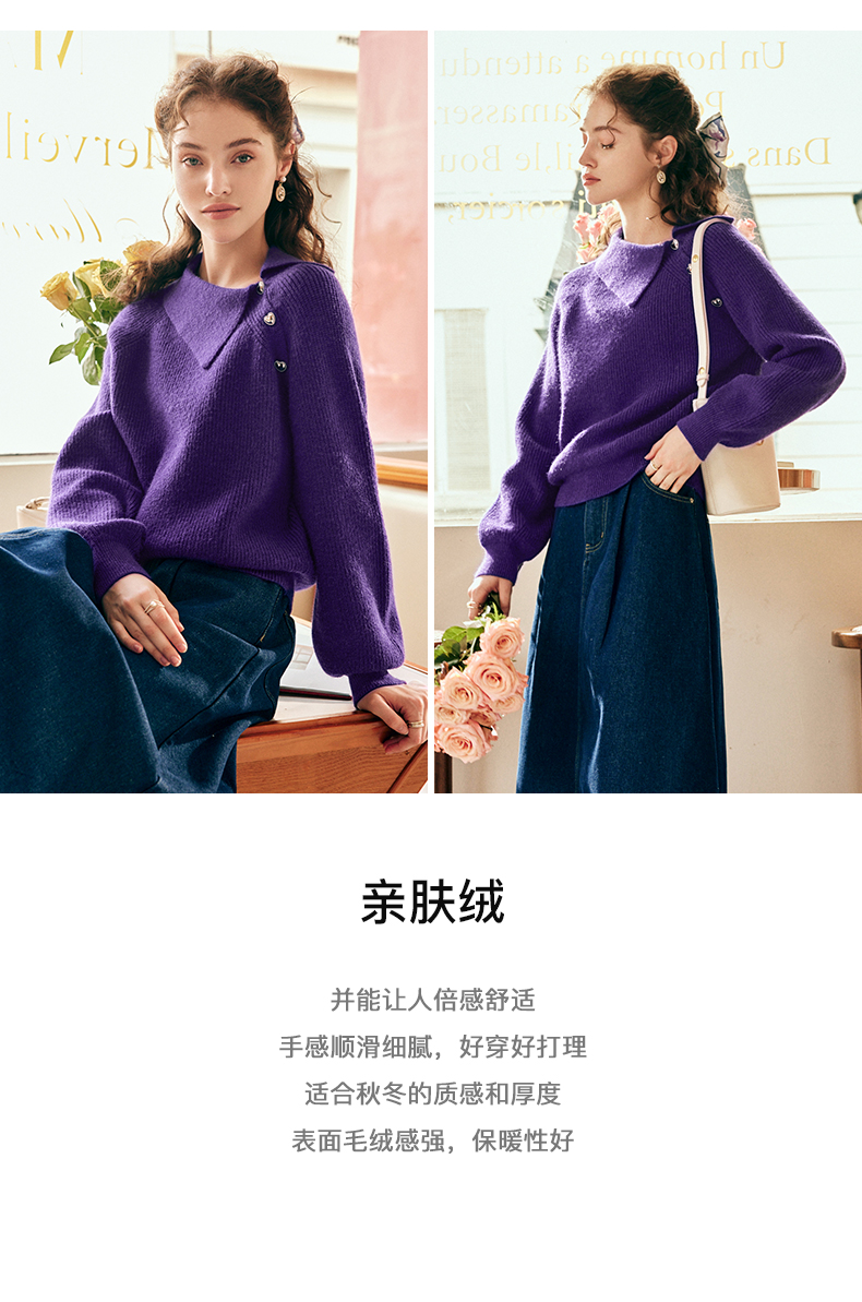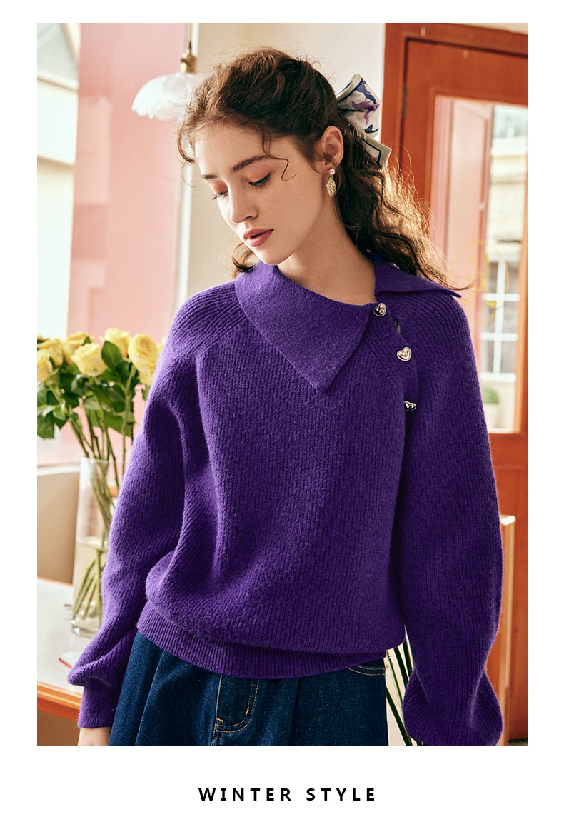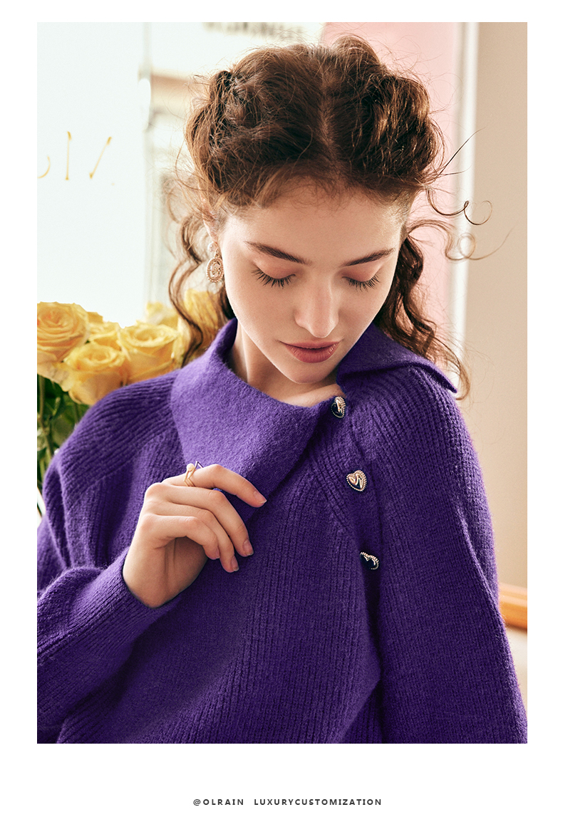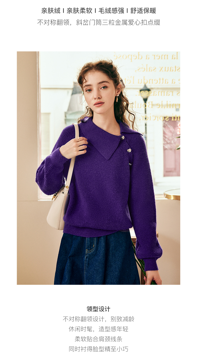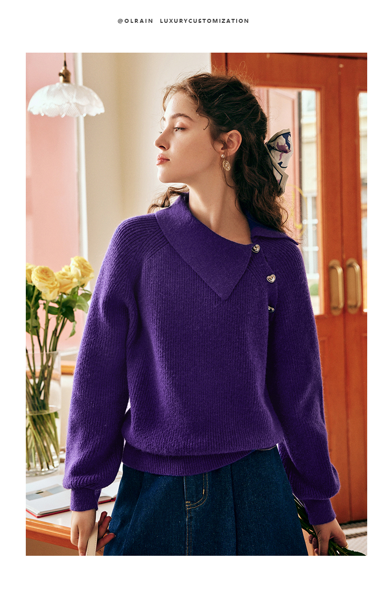 OLrain欧芮儿法式紫色毛衣女秋冬2022年新款不对称翻领毛绒针织衫