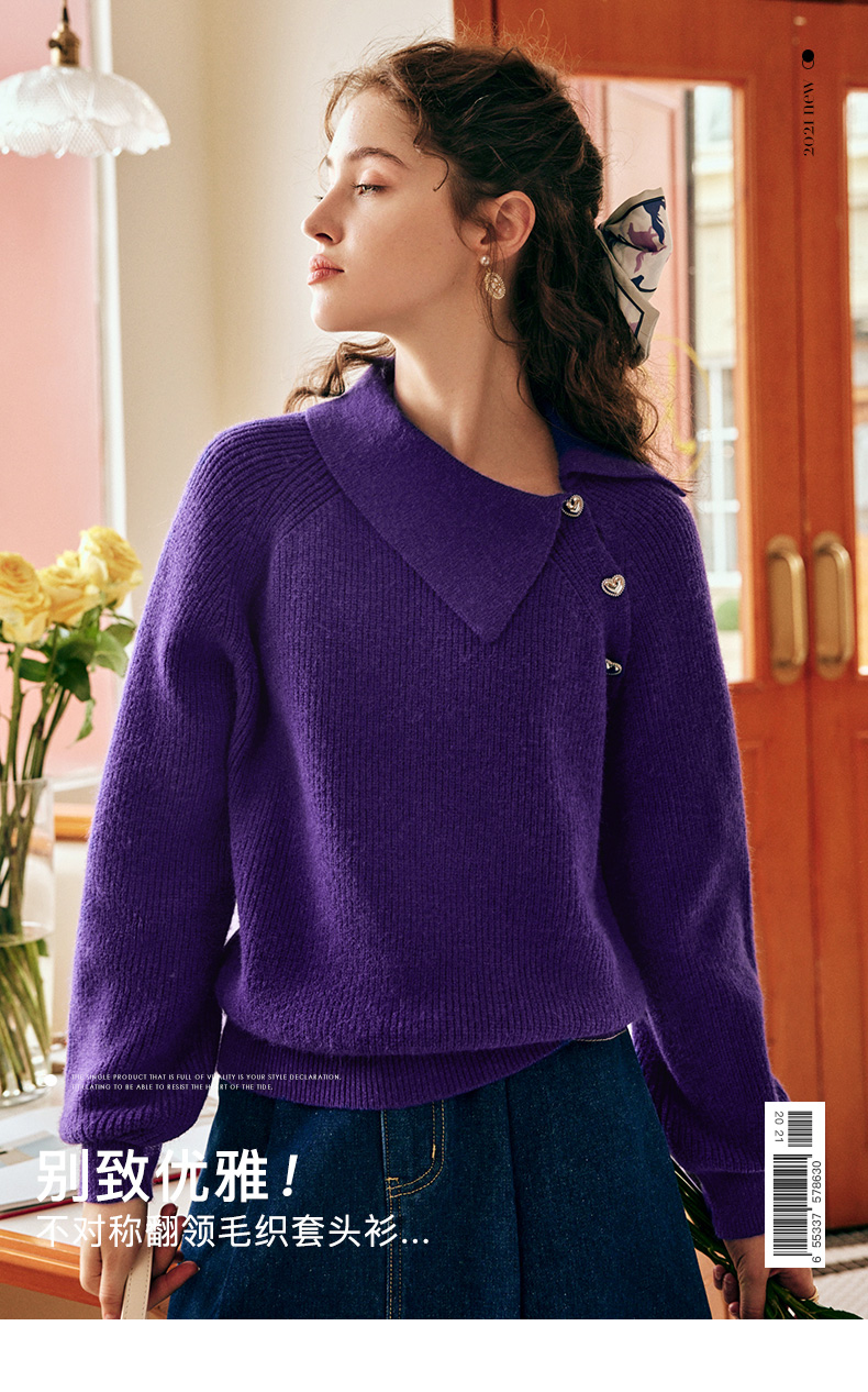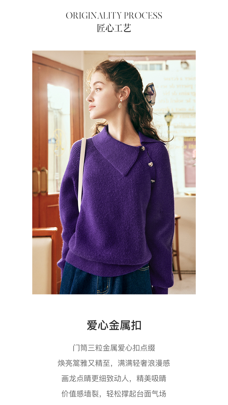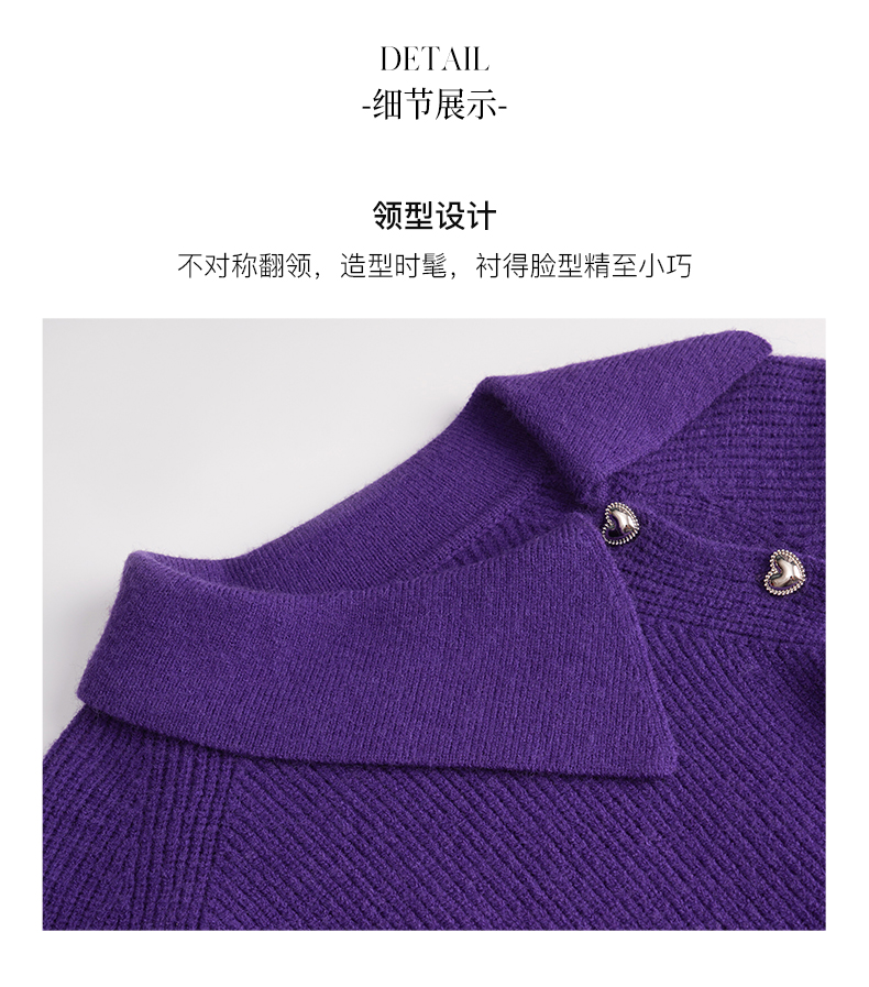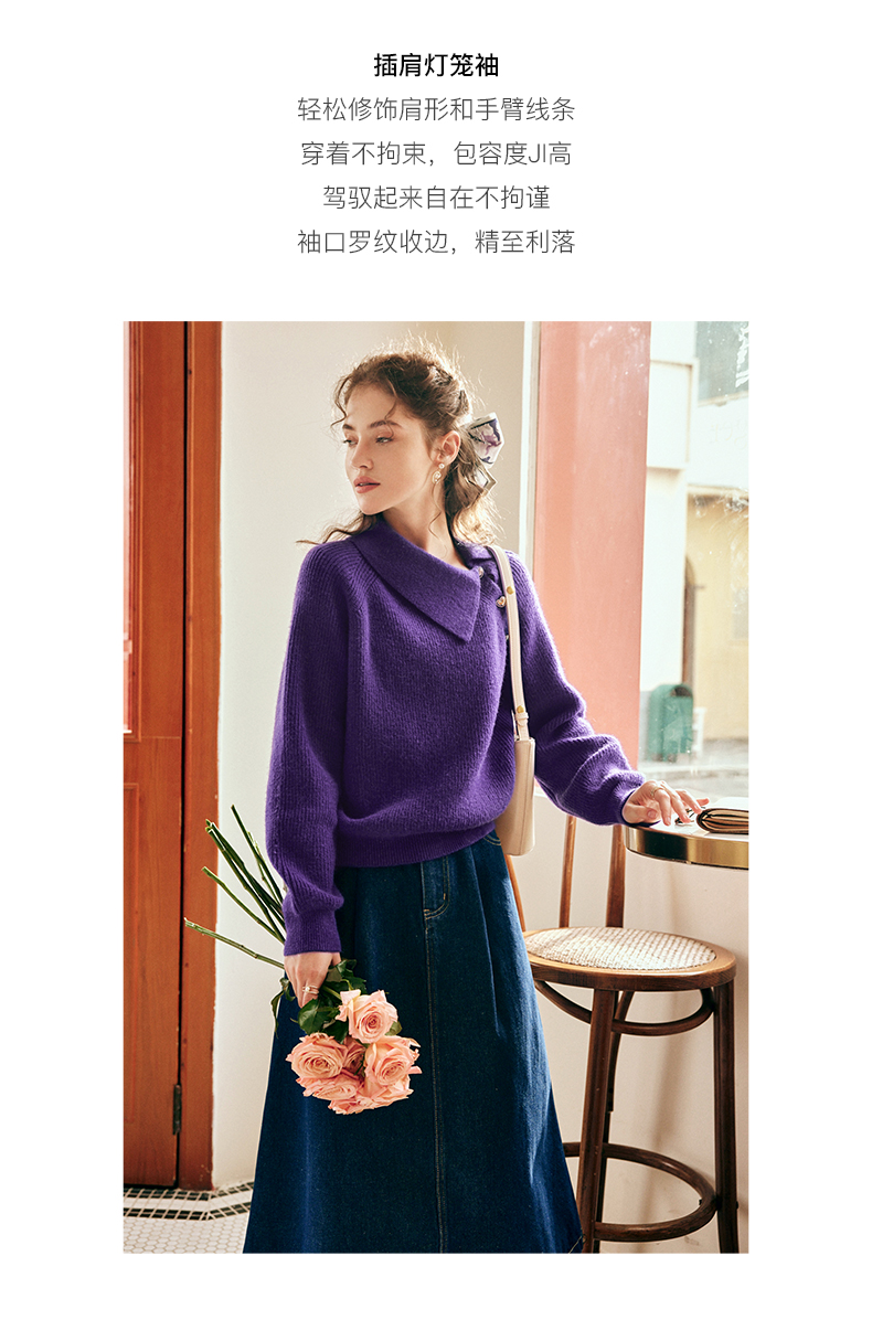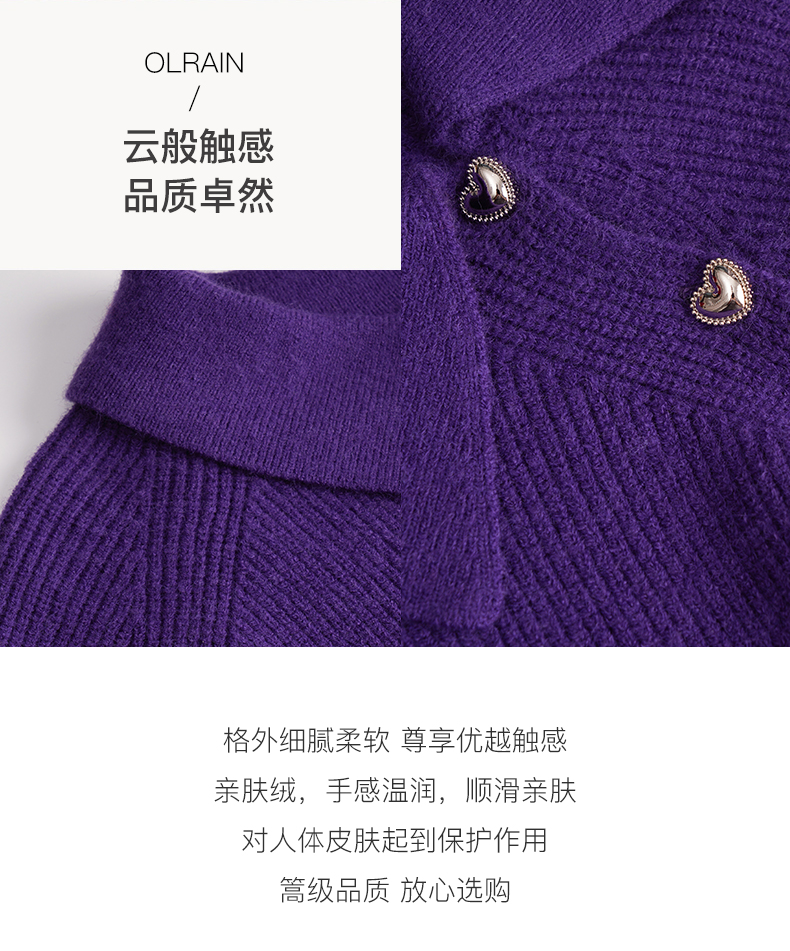 OLrain欧芮儿法式紫色毛衣女秋冬2022年新款不对称翻领毛绒针织衫